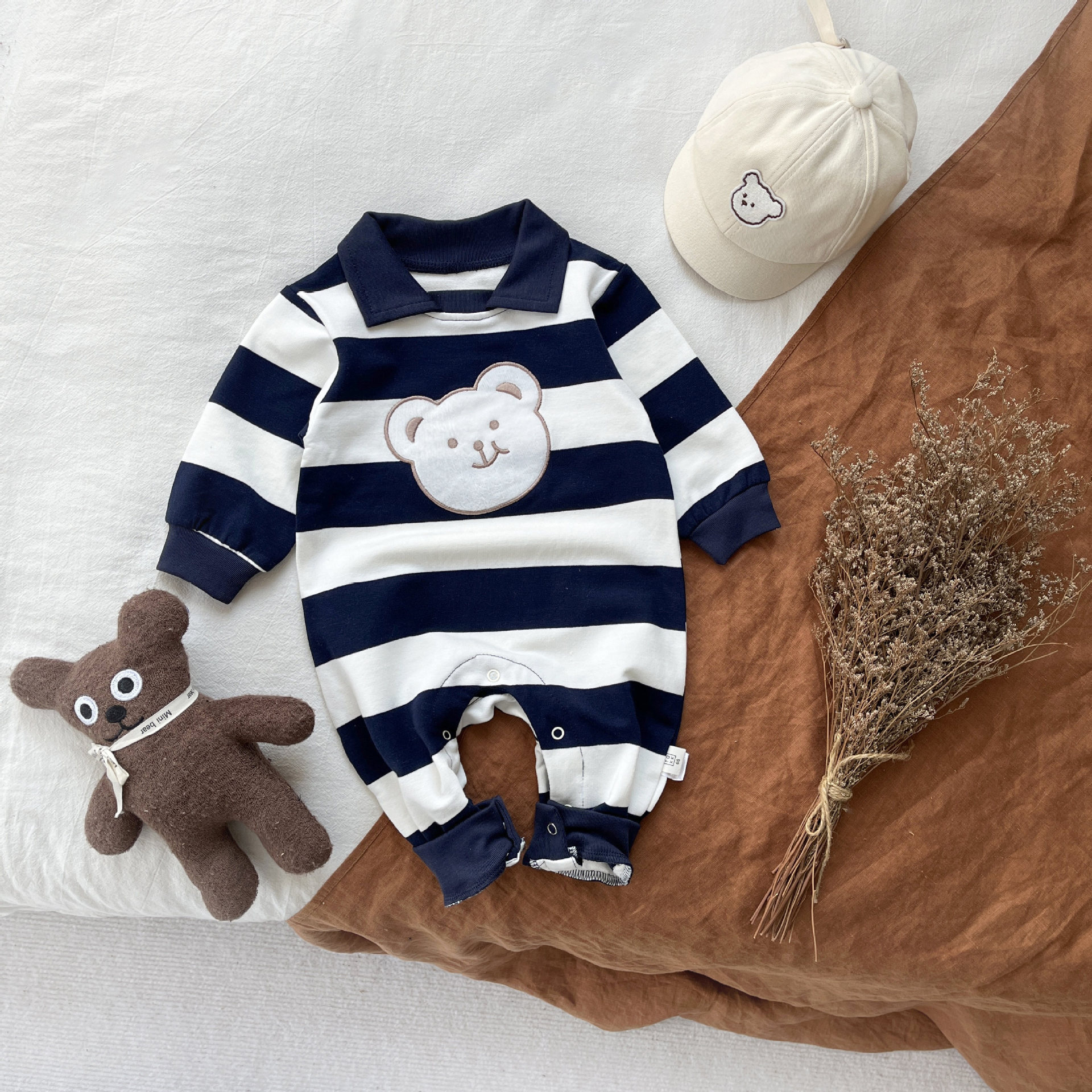 Ins 가을 한국식 신생아 줄무늬 만화 점프 수트 스포츠 Hakka 남자와 여자 아기 가방 방풍 등반 세트스토어 가기