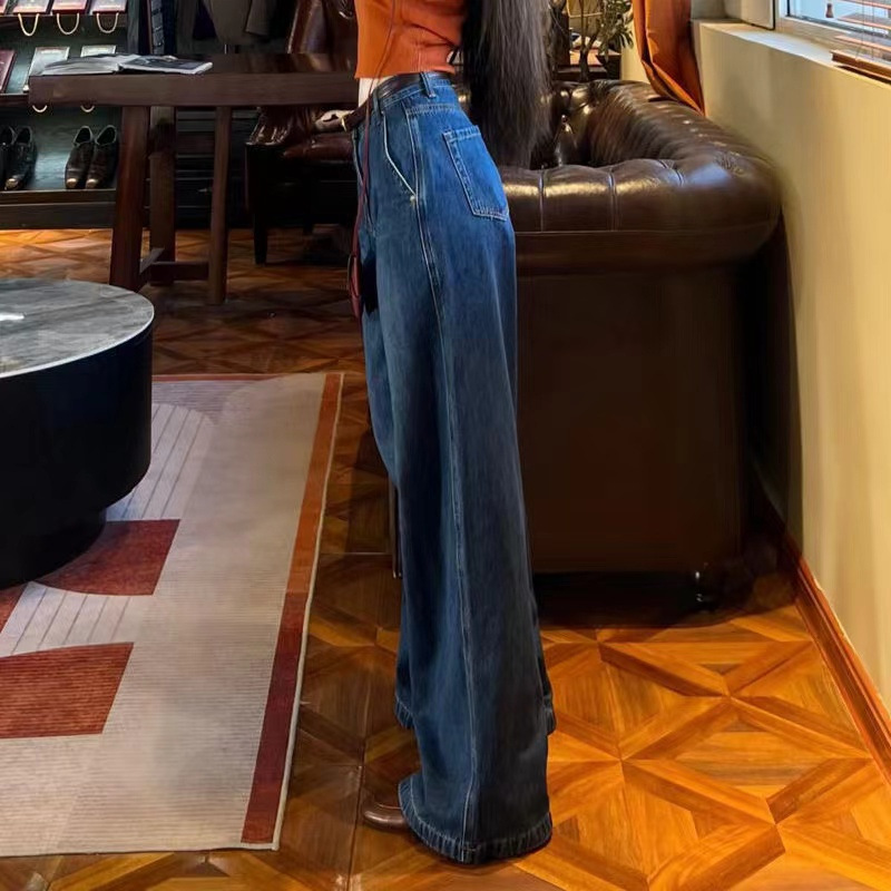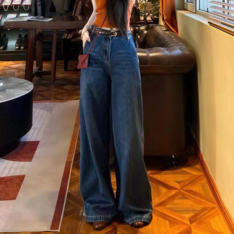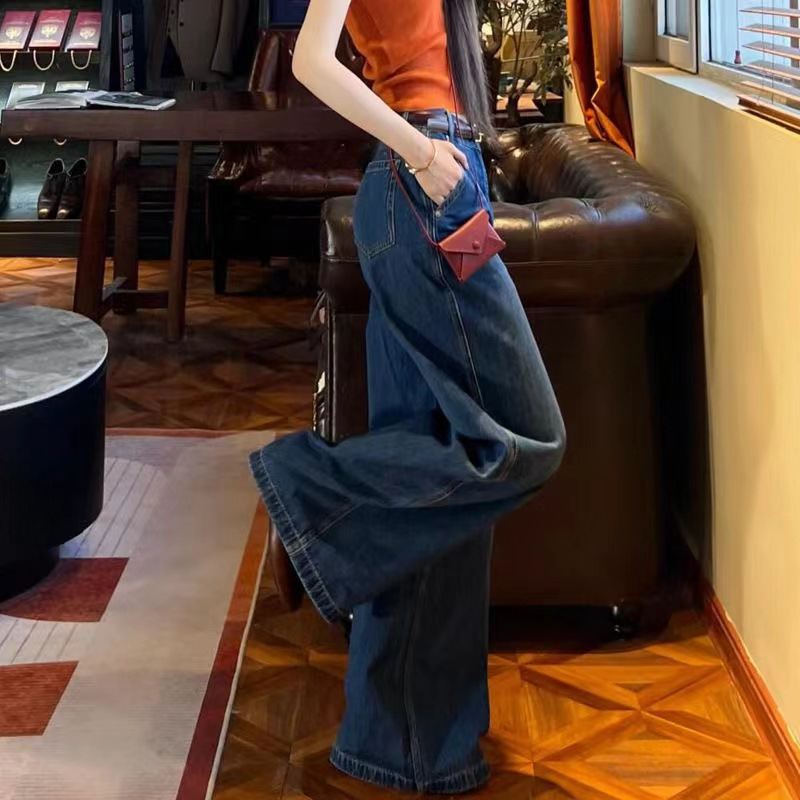뜨거운 소녀 빈티지 다크 블루 넓은 다리 청바지 여성의 높은 허리 느슨한 슬리밍 스트레이트 바지스토어 가기