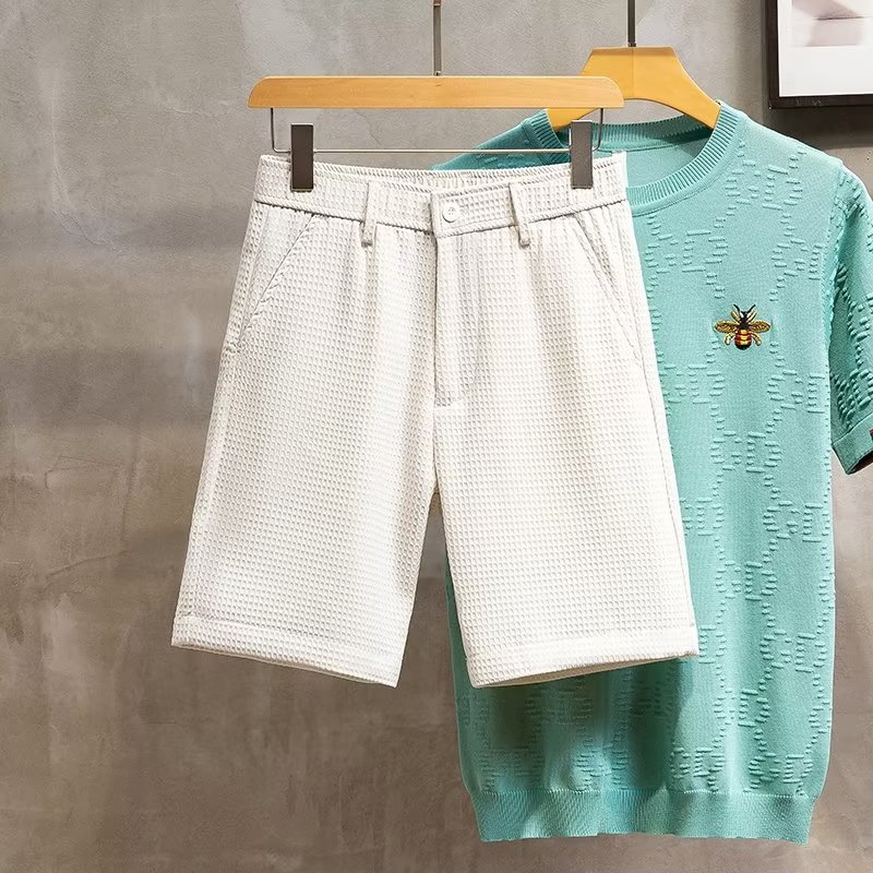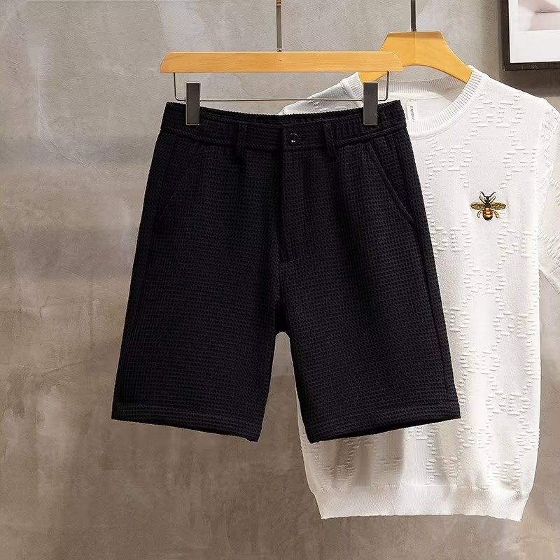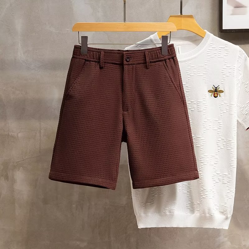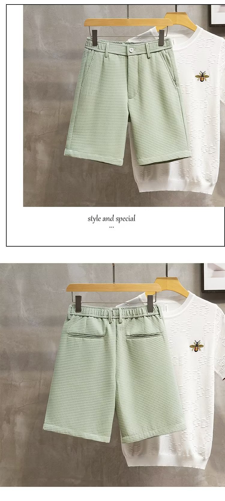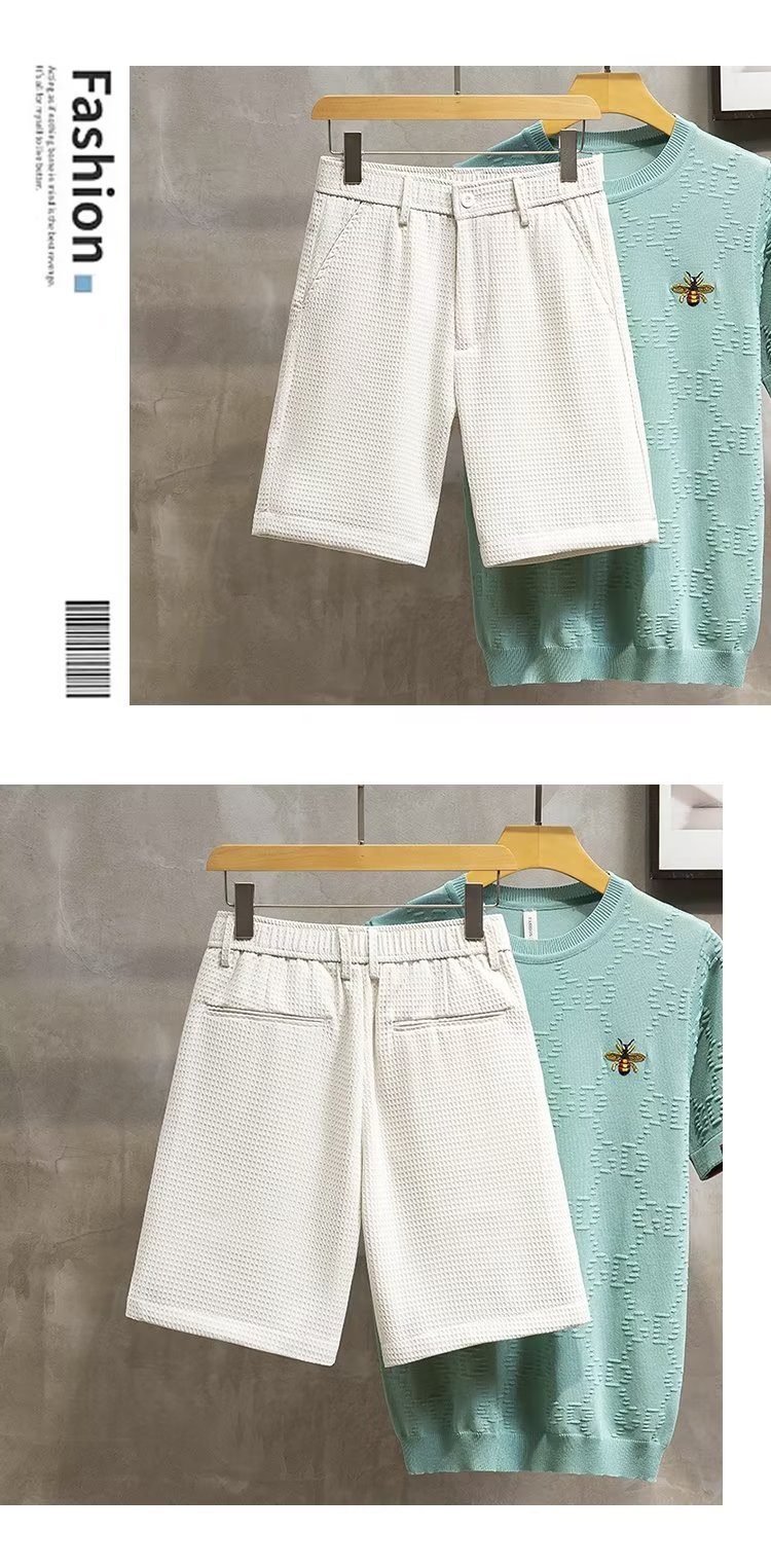 고급 와플 세트 반바지 남성 스트레이트 슬림 핏 5 점 바지 남성 패션 브랜드 핸섬 화이트 세트 바지