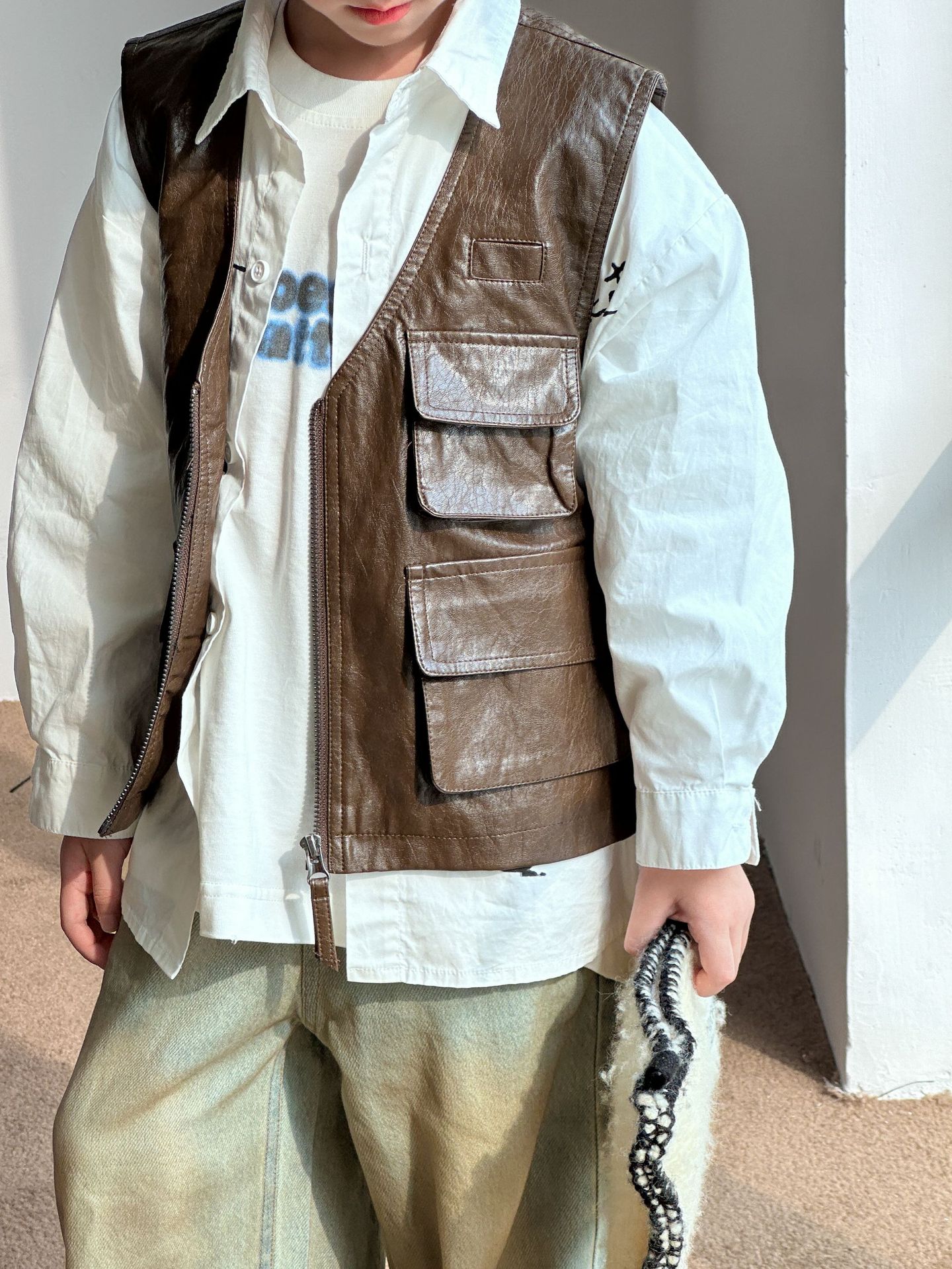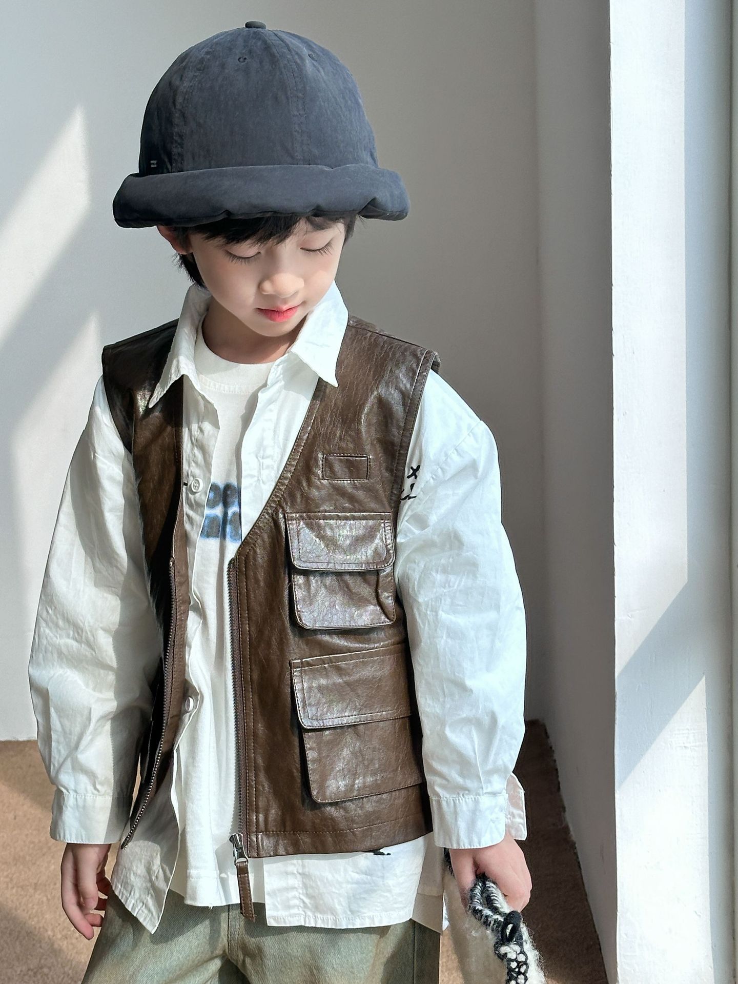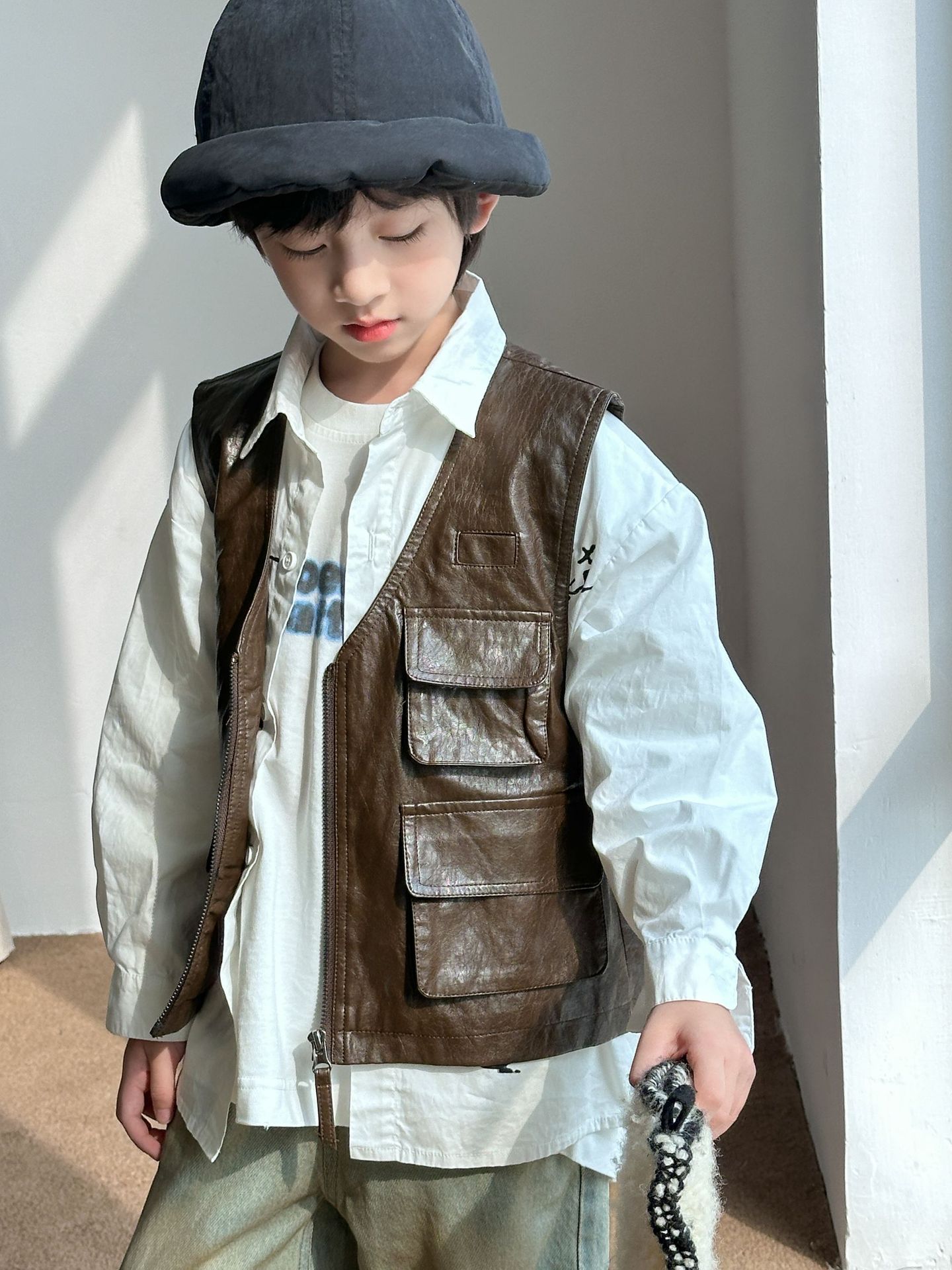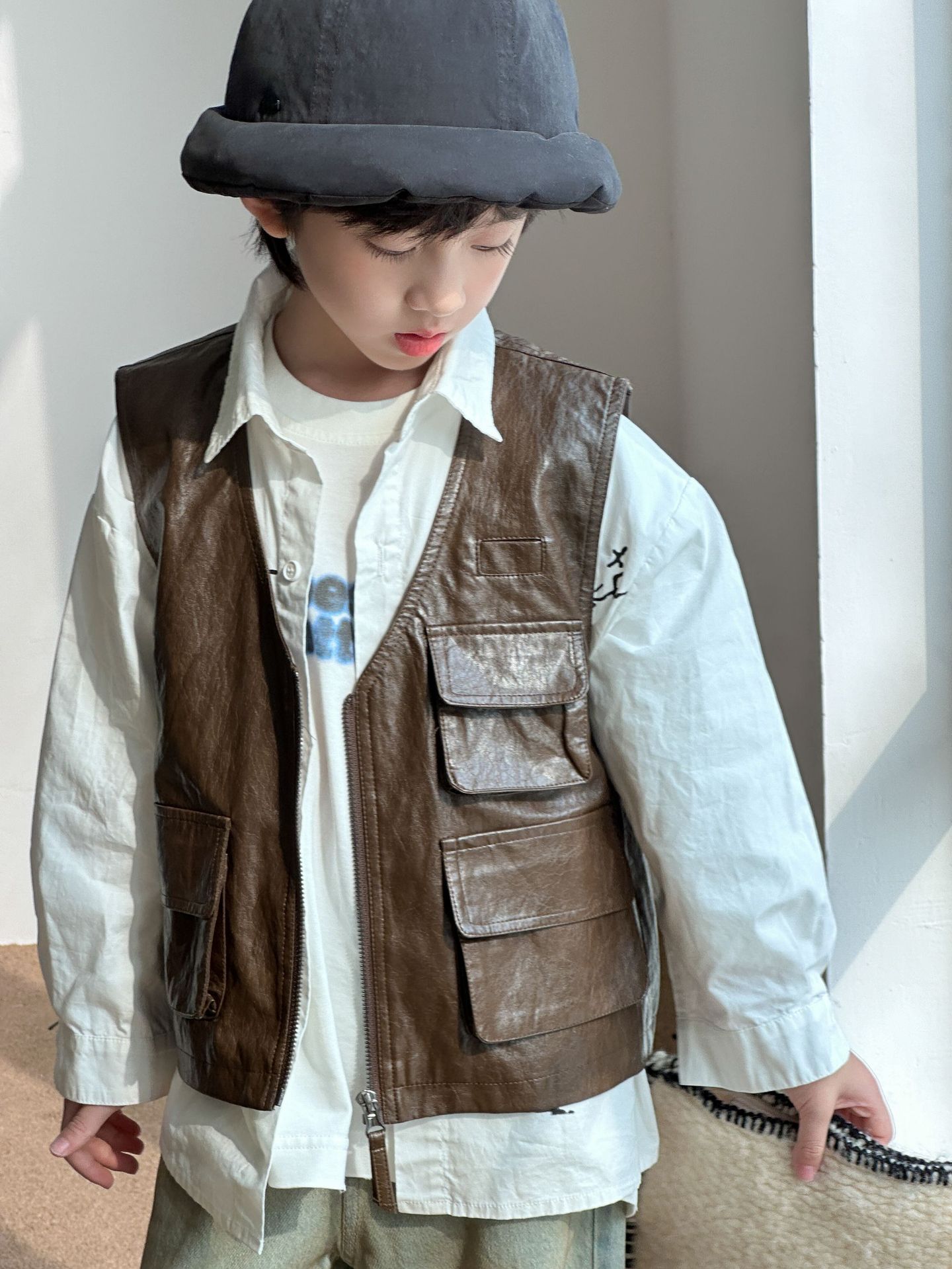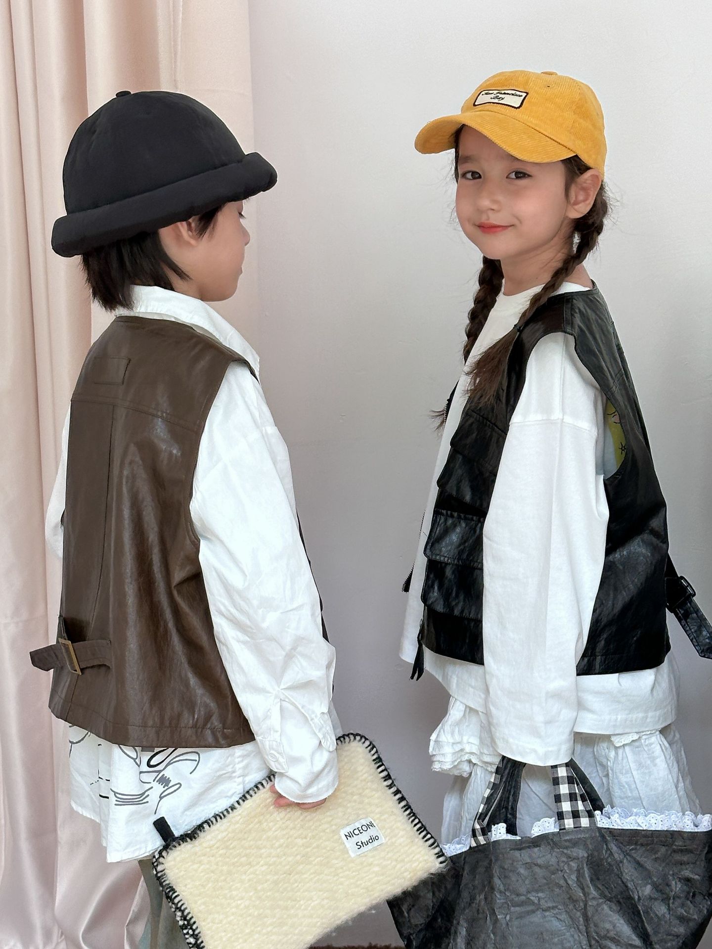 2025 봄 새로운 한국어 버전 소년과 소녀를위한 어린이 잘 생긴 가죽 조끼 중공업 입체 가방 양복 조끼 조끼 유행 스타일