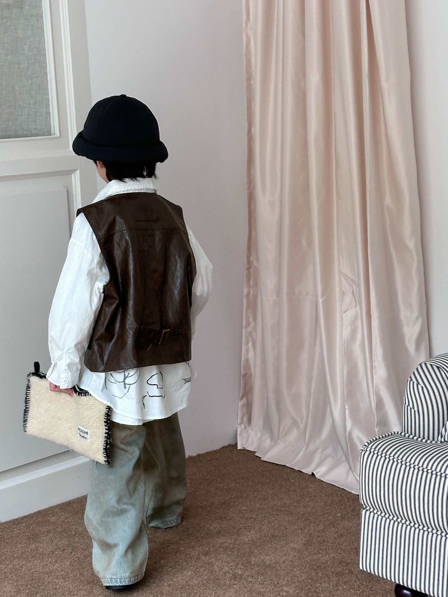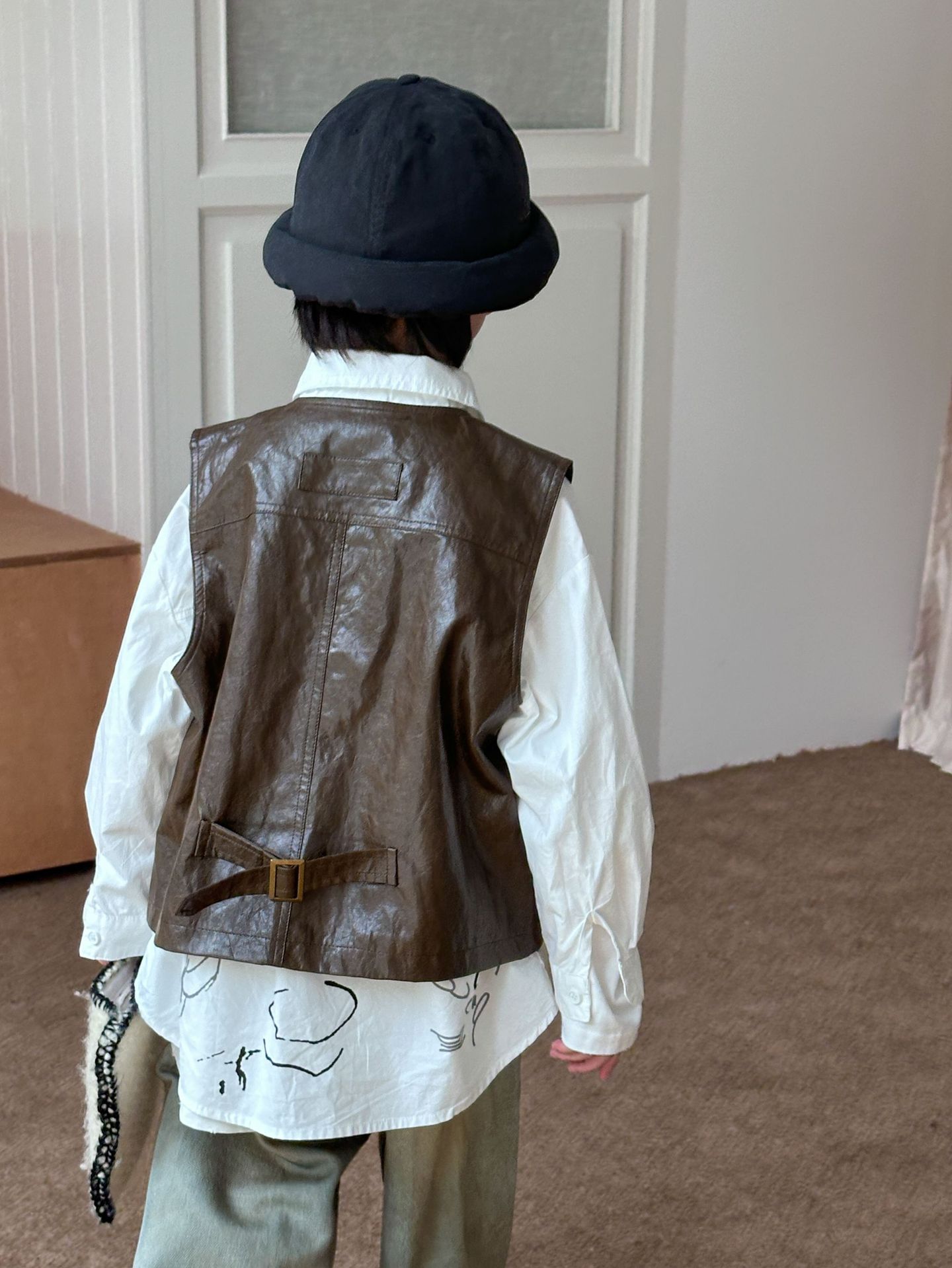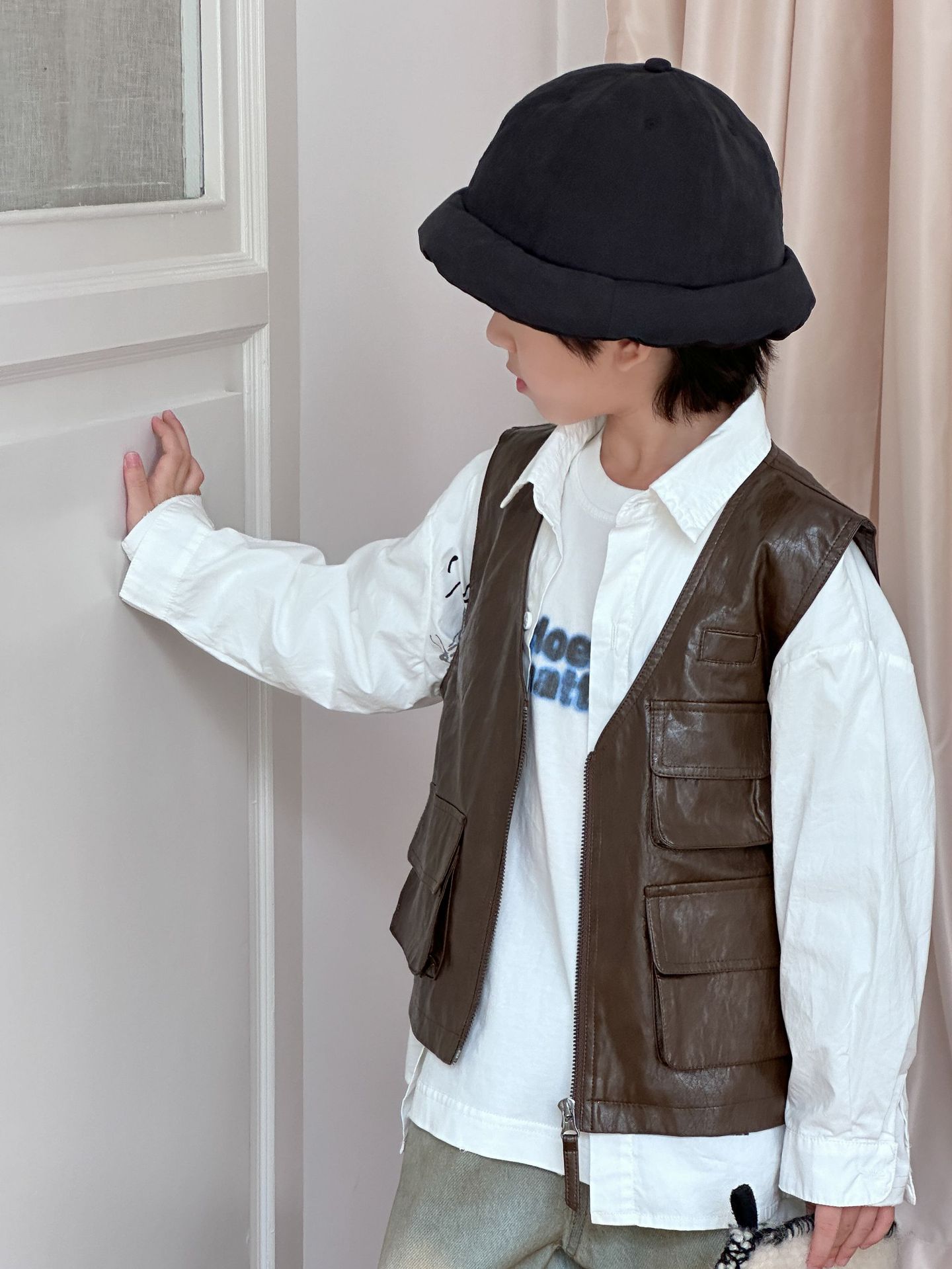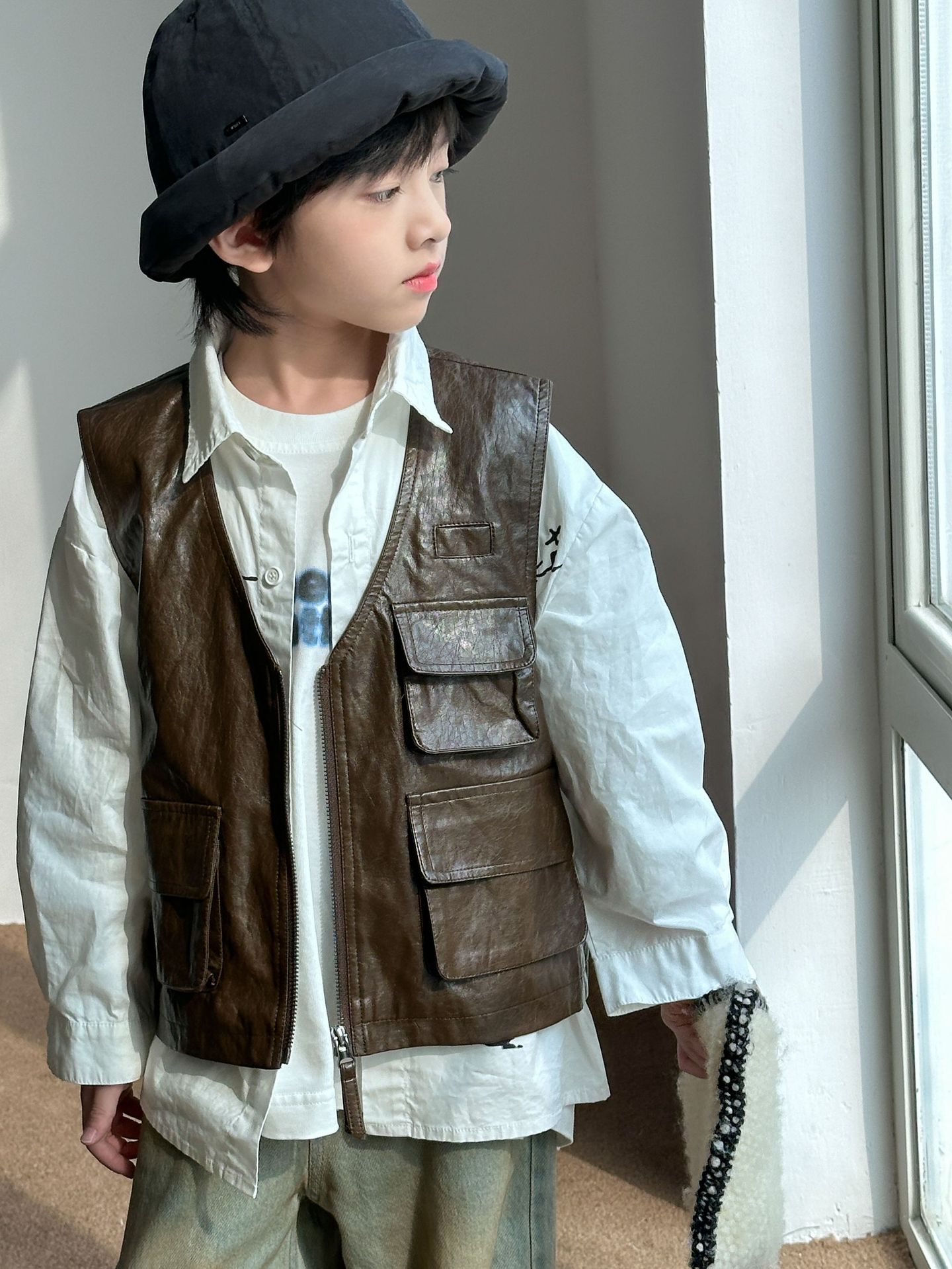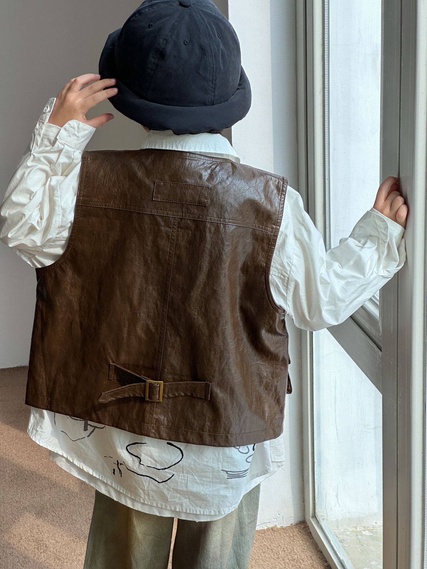 2025 봄 새로운 한국어 버전 소년과 소녀를위한 어린이 잘 생긴 가죽 조끼 중공업 입체 가방 양복 조끼 조끼 유행 스타일