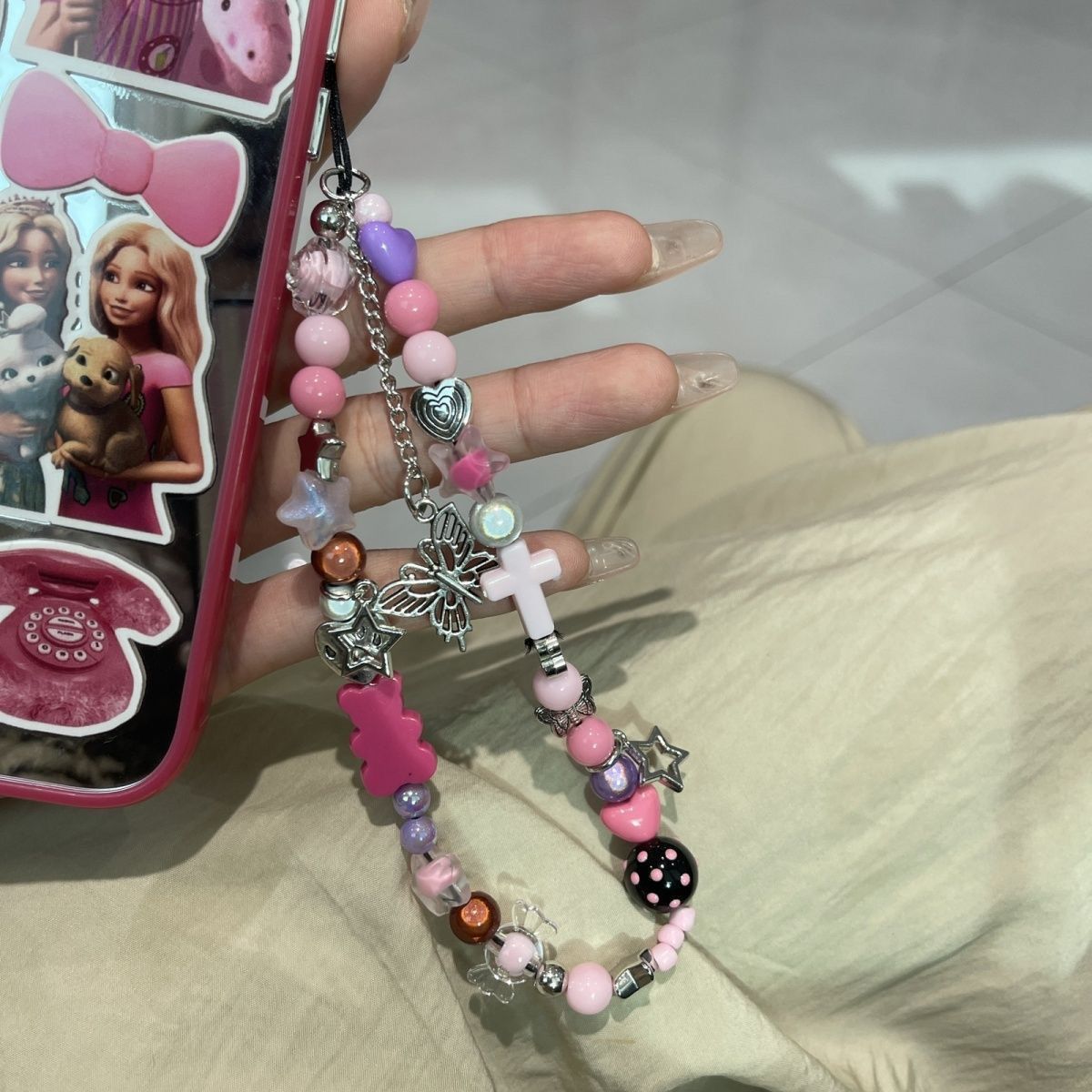 달콤한 쿨 스타일 블랙 파우더 컬러 매칭 전화 케이스 전화 로프 스타 나비 펜던트 손으로 그린 구슬 CCD 끈 DIY 구슬스토어 가기