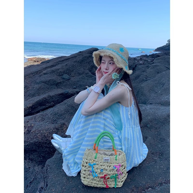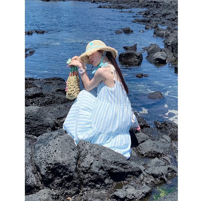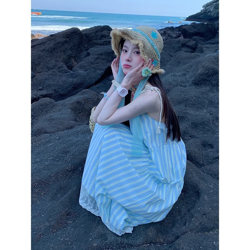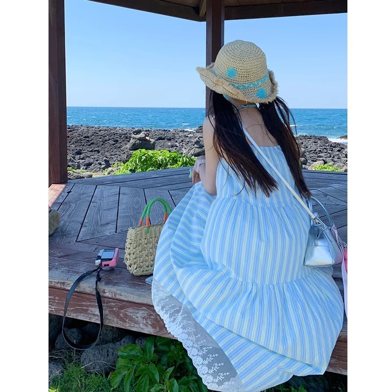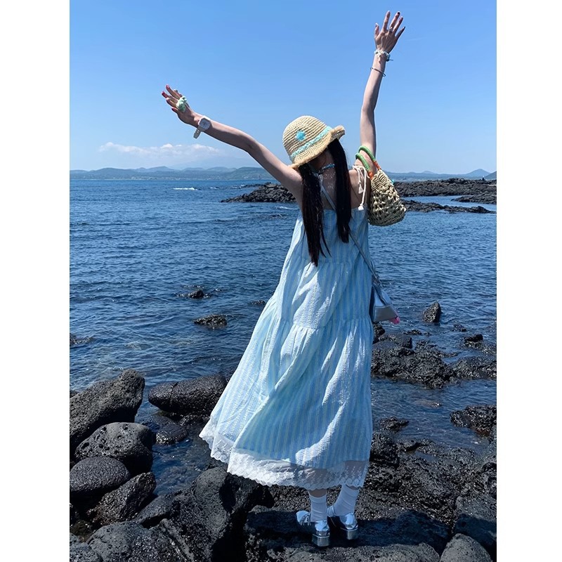 프랑스 스타일 첫사랑 블루 슬링 원피스 여성 여름 2024 새로운 도착 해변 스타일 비치 롱 원피스스토어 가기