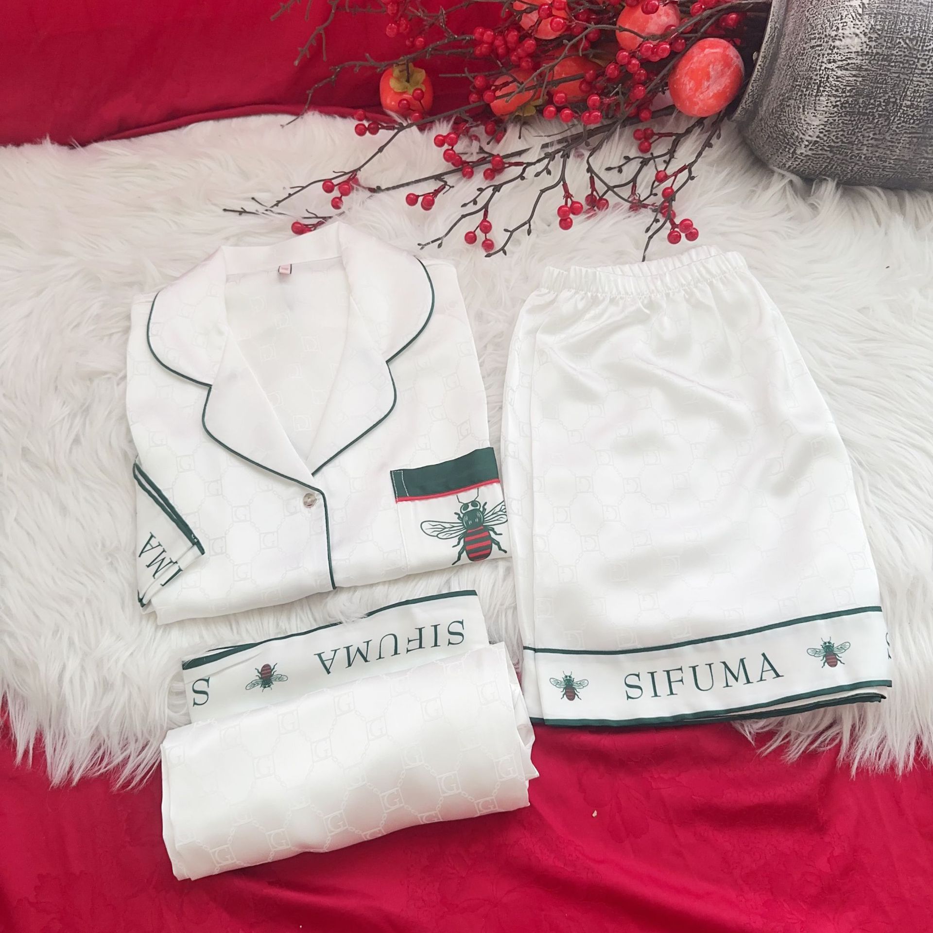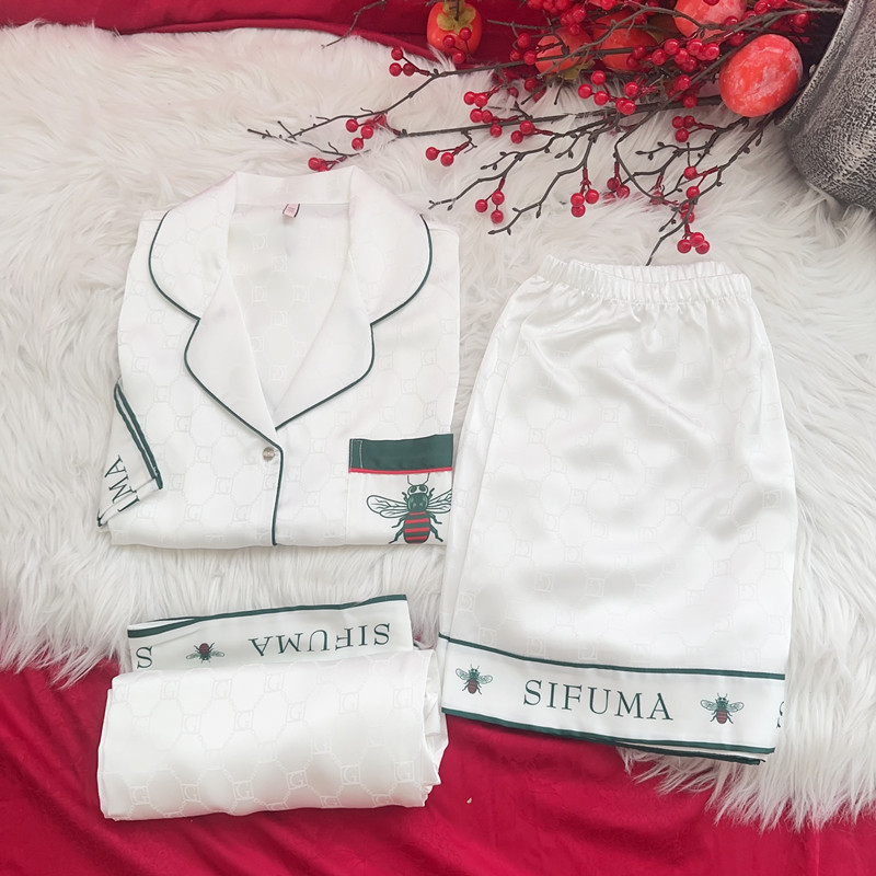 패셔너블하고 고급스러운 남성용 아이스 실크 잠옷, 봄 여름 3피스 세트, 커플용 반팔 화이트 고급 홈웨어