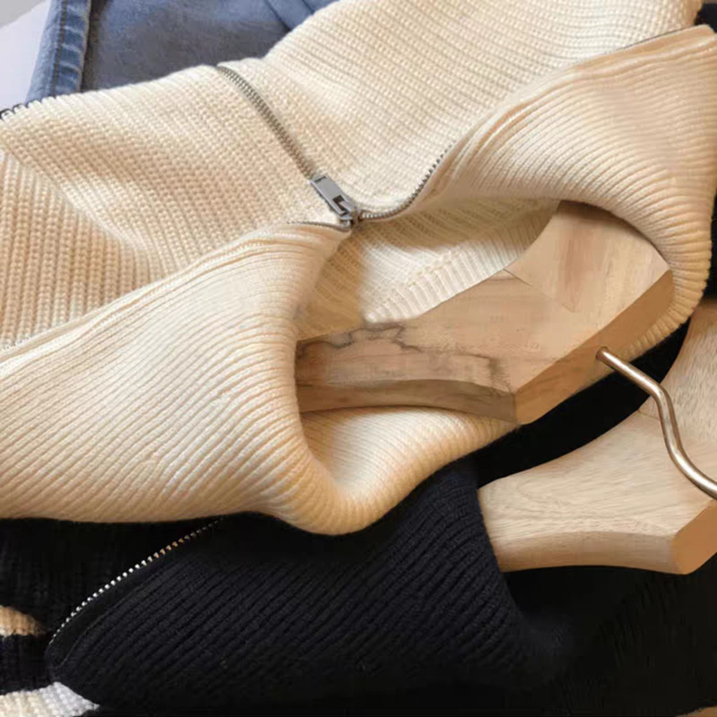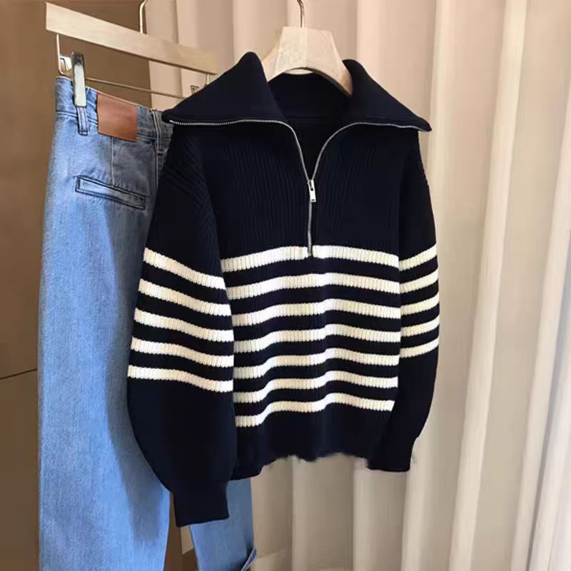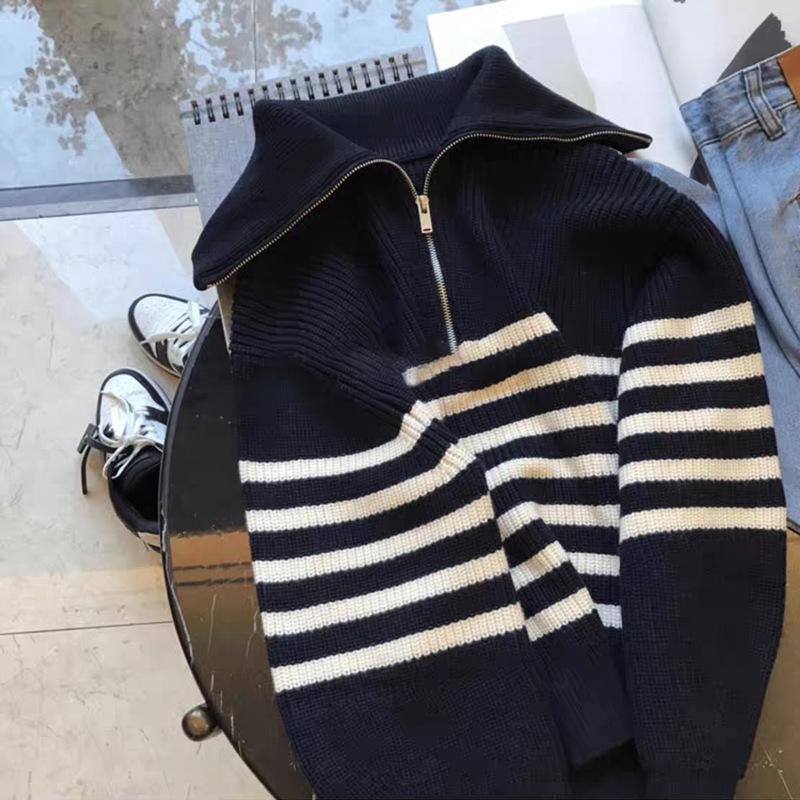 대형 옷깃 스웨터 여성용 하프 지퍼 터틀넥 스트라이프 2024 가을과 겨울 느슨한 게으른 스타일 풀오버 울 스웨터스토어 가기