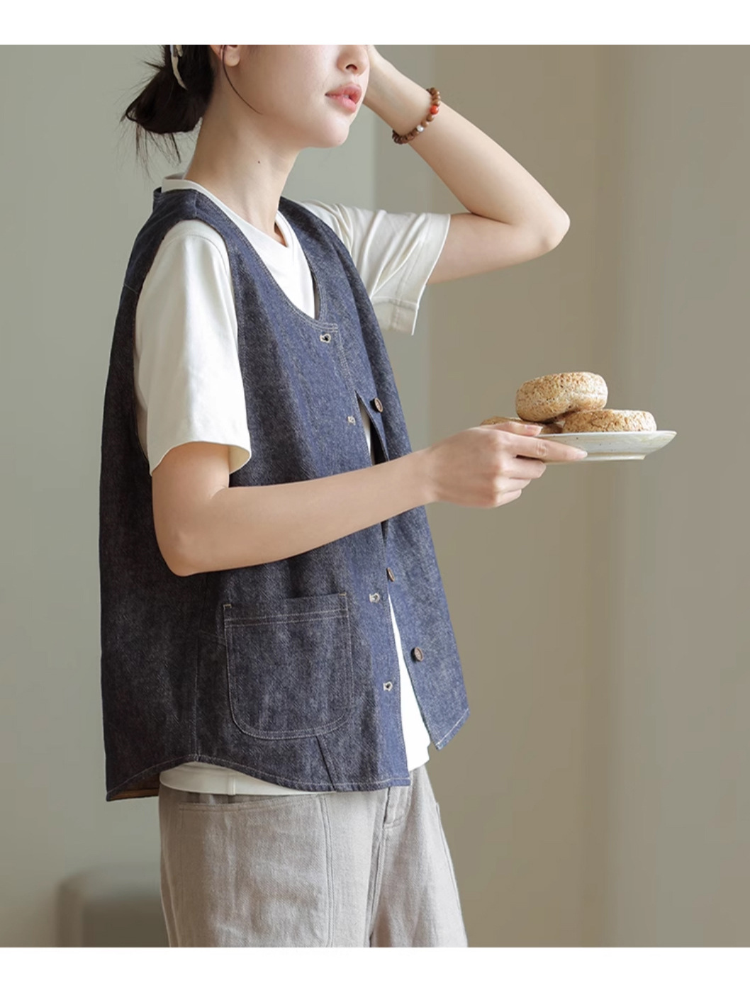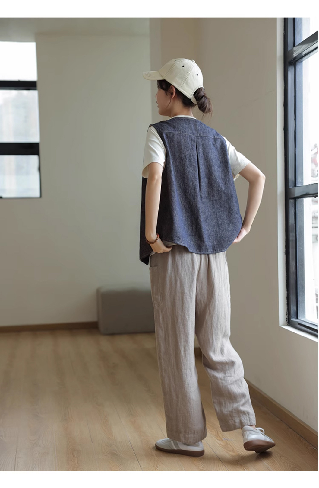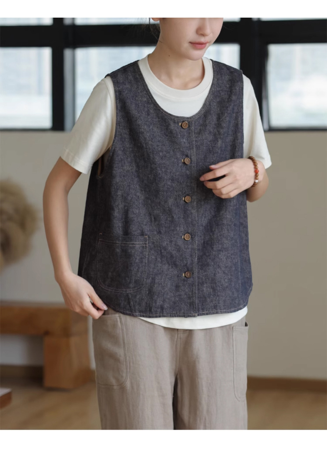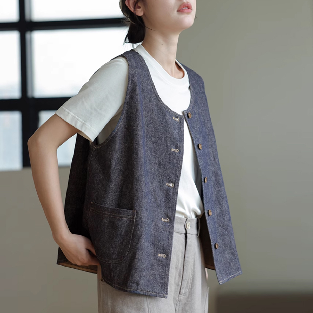 2025년 신상 다용도 고밀도 양면 염색 능직 린넨 코튼 샤넬 스타일 민소매 고급 데님 조끼 여성용스토어 가기