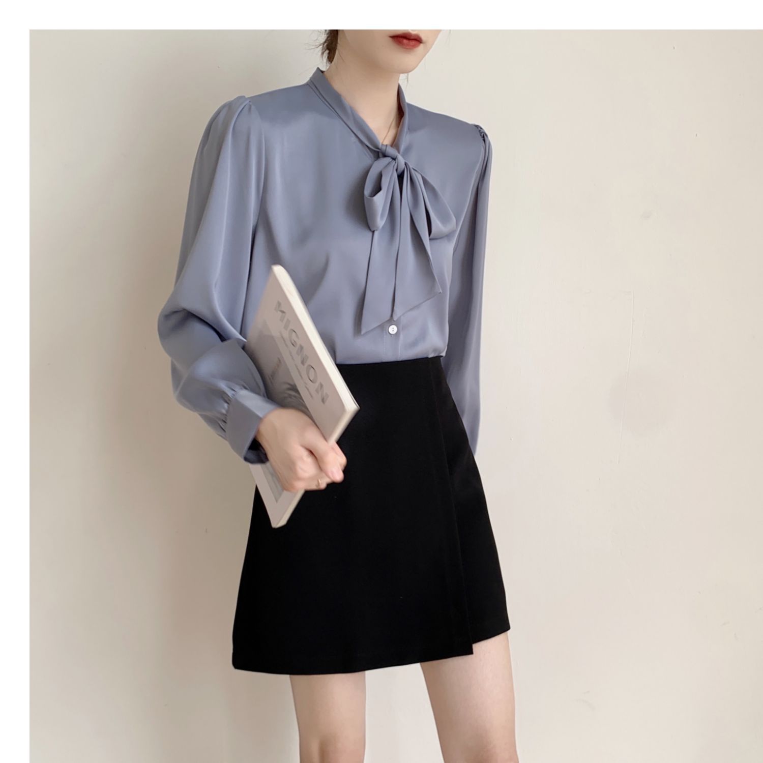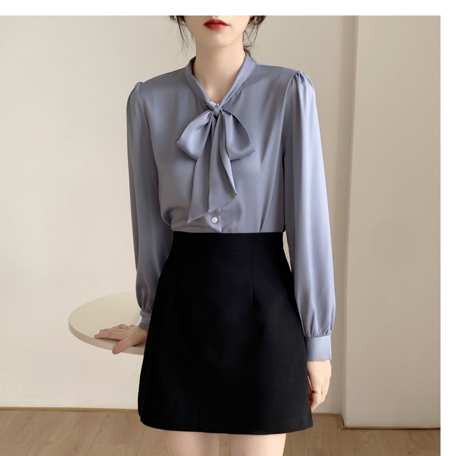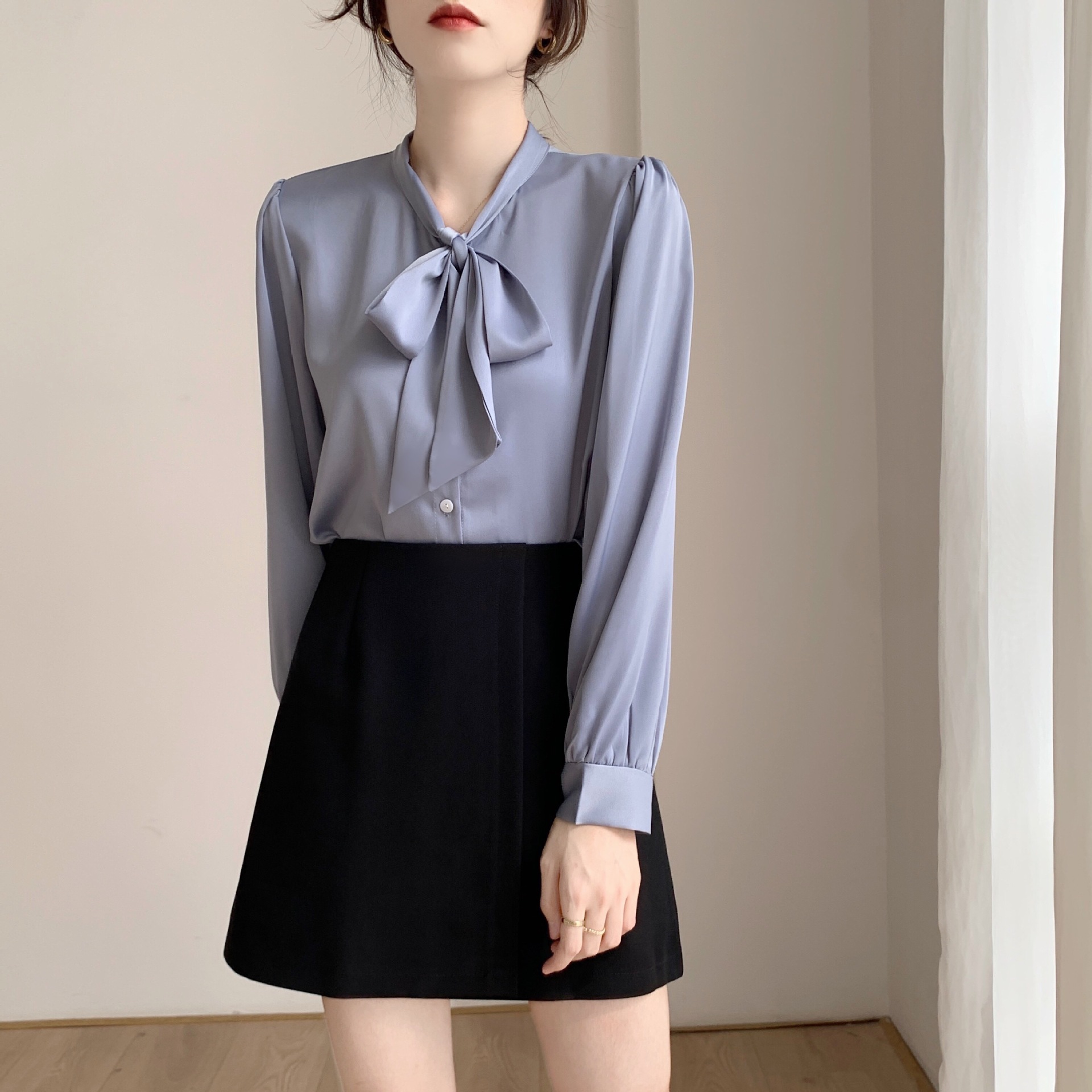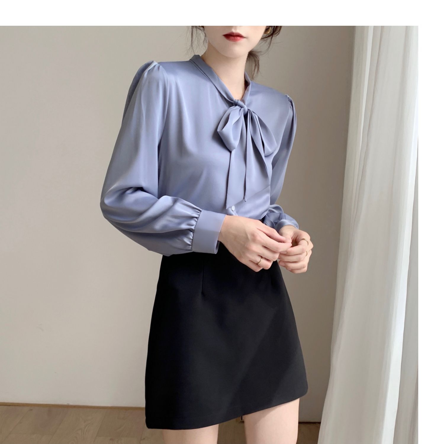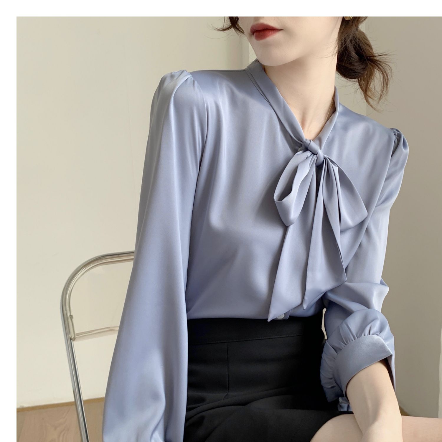 슈퍼 오리지널 블루 활 셔츠 여성 디자인 센스 틈새 전문 우아한 셔츠 새틴 탑 레이스스토어 가기