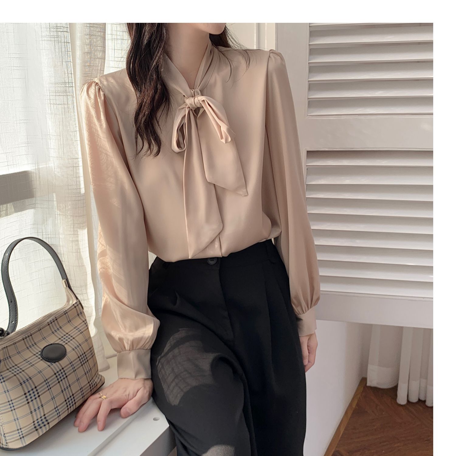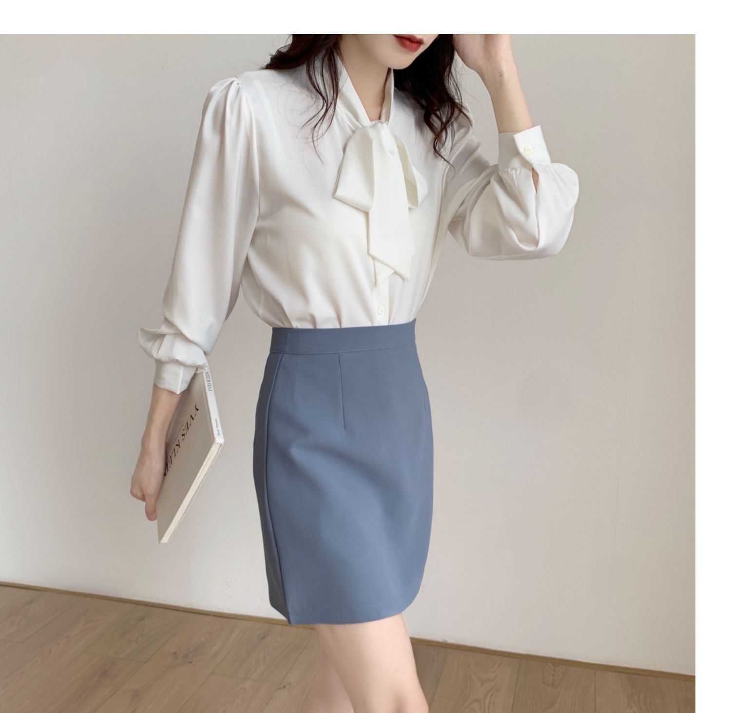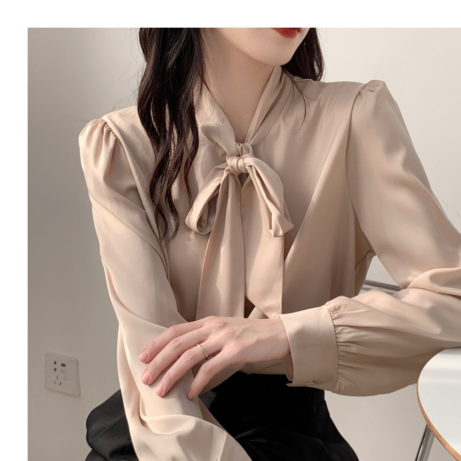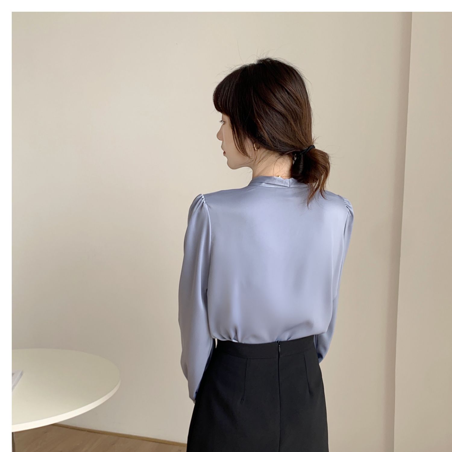 슈퍼 오리지널 블루 활 셔츠 여성 디자인 센스 틈새 전문 우아한 셔츠 새틴 탑 레이스스토어 가기