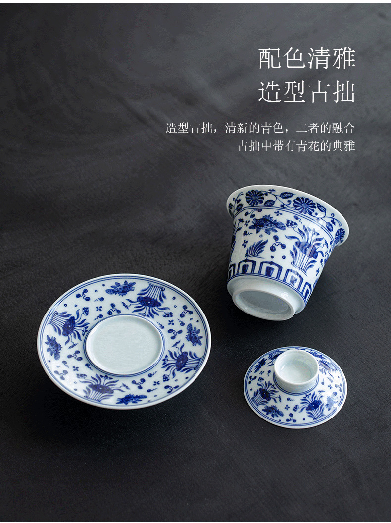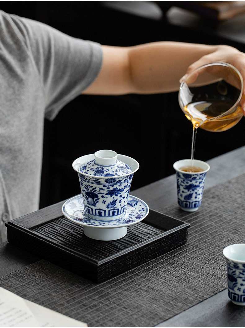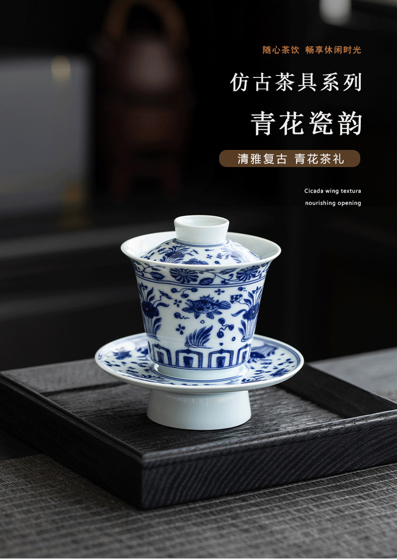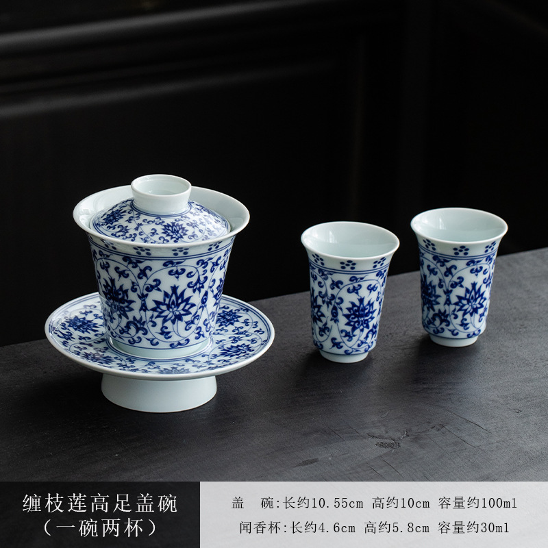 • 파란색과 흰색 도자기, 높은 발, 세 가지 재능, 두 컵의 그릇-얽힌 가지 연꽃