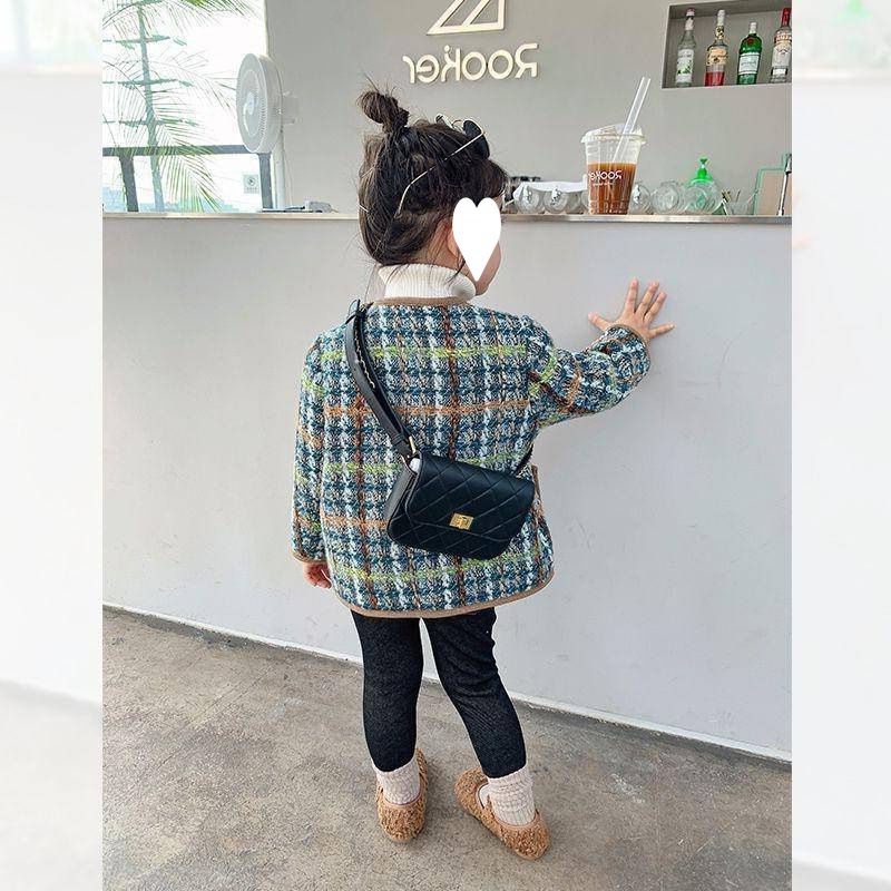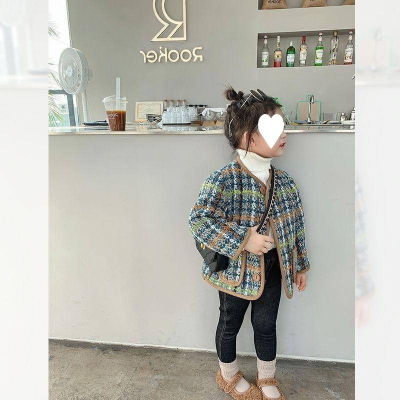어린이 크루 넥 세련된 격자 무늬 올 매치 재킷 2024 가을 겨울 한국 스타일 아기 소녀 샤넬 스타일 코튼 따뜻한 재킷스토어 가기