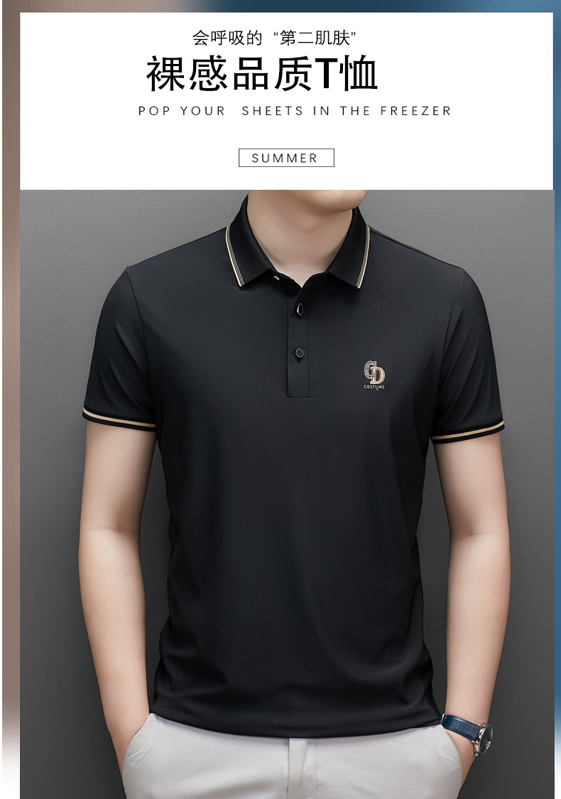 남자 아이스 실크 반팔 폴로 셔츠 2023 여름 새로운 도착 비즈니스 캐주얼 올 매치 티셔츠 남성용 화이트 옷깃 탑