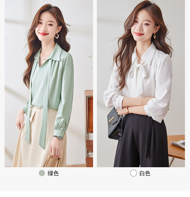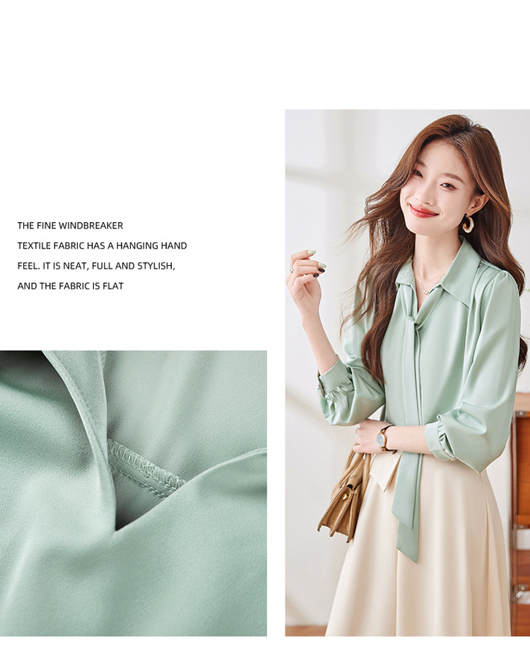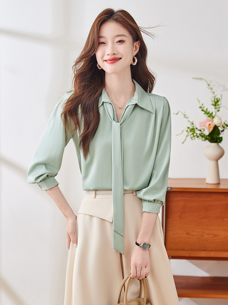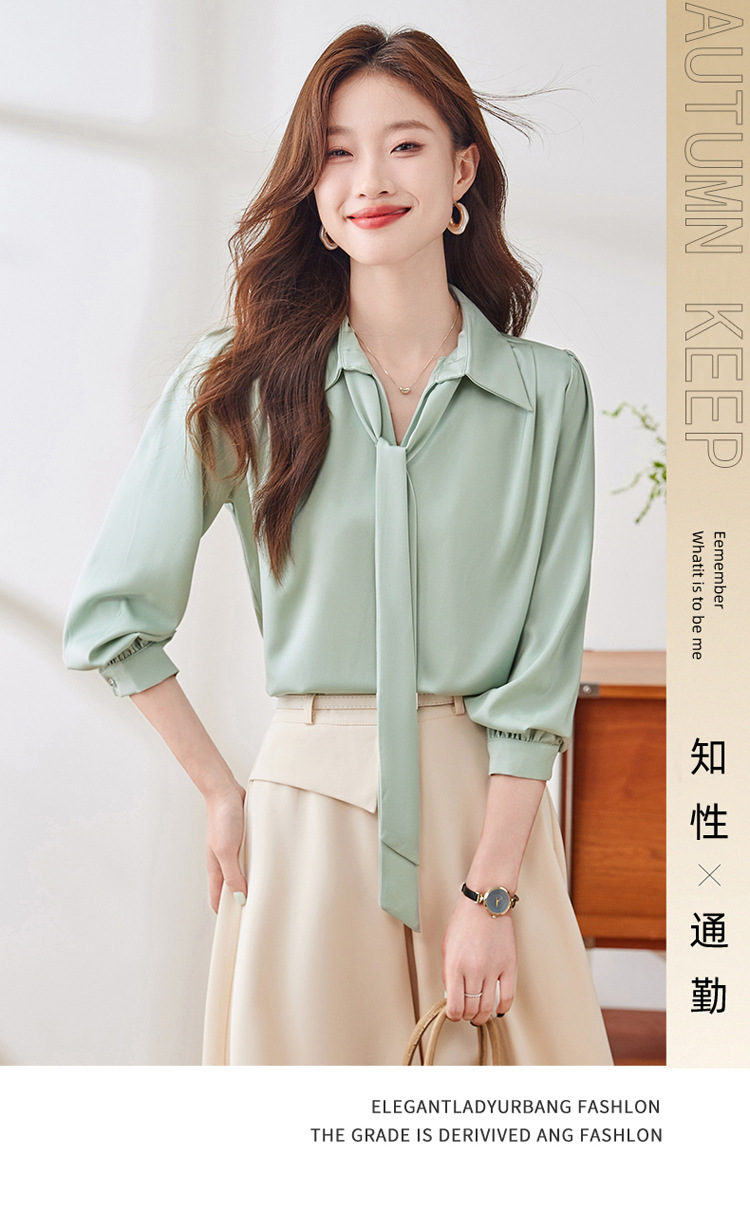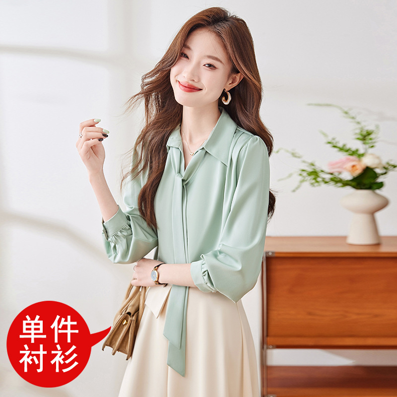 2025 가을 신상 패셔너블하고 우아한 리본 디자인의 독특한 긴팔 새틴 드레이프 여성용 아름다운 상의스토어 가기