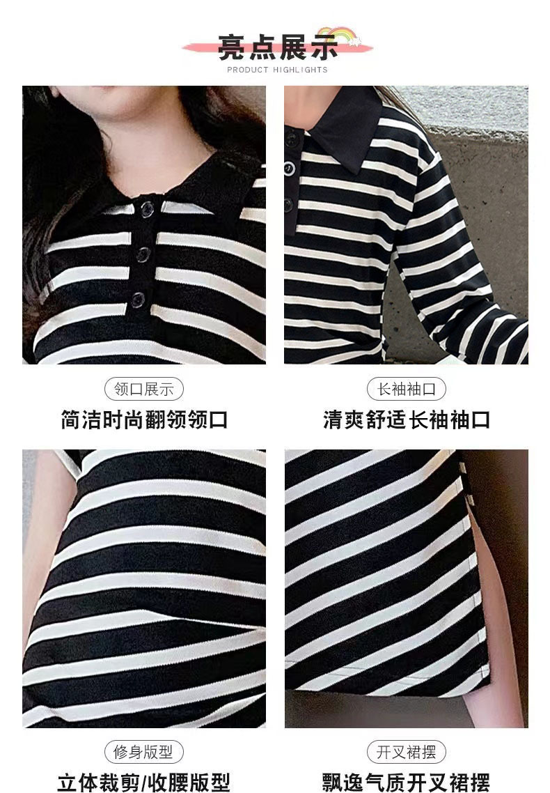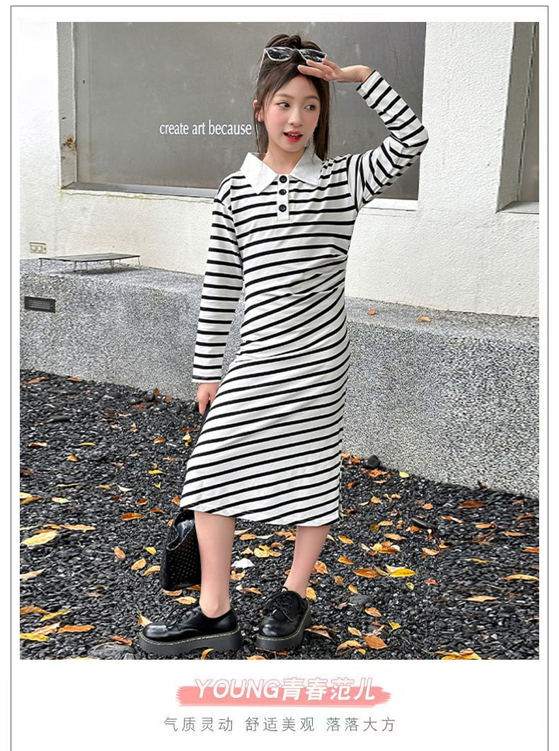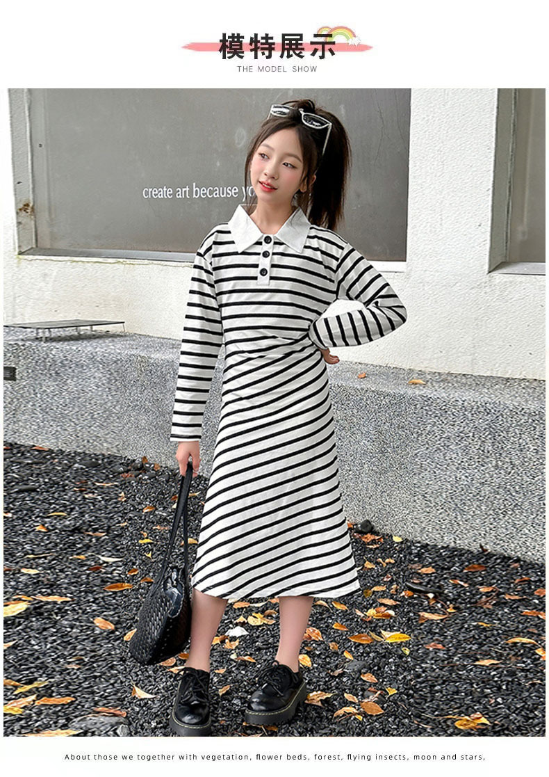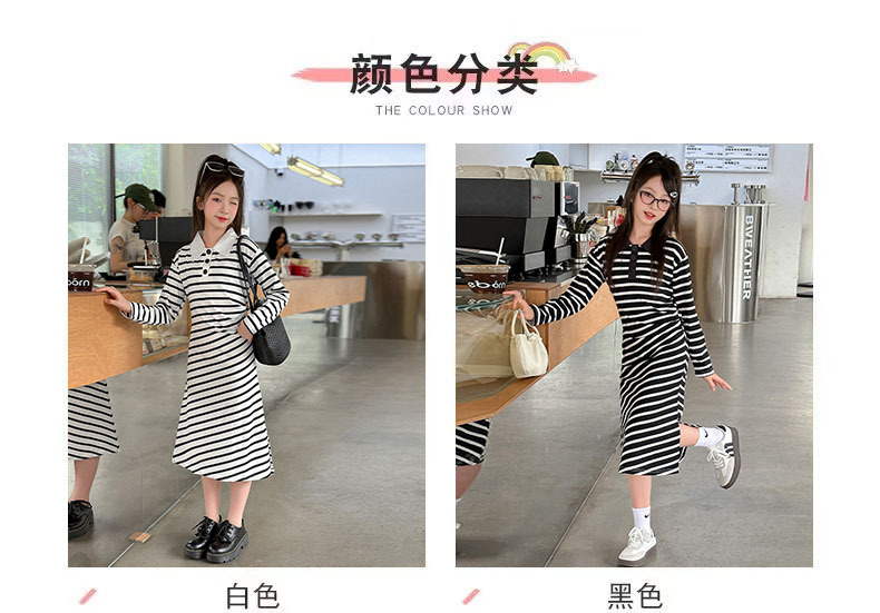소녀의 봄과 가을 폴로 칼라 한국식 옷깃 공주 원피스 줄무늬 니트 긴팔 슬림 핏 원피스 스타일라인 원피스스토어 가기
