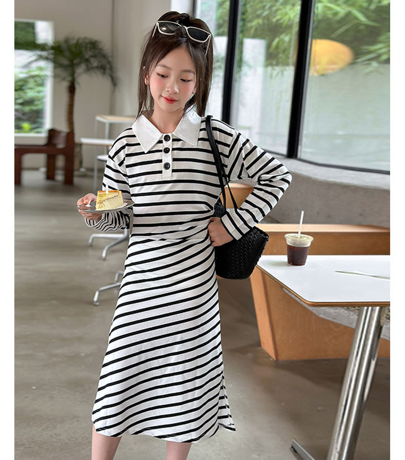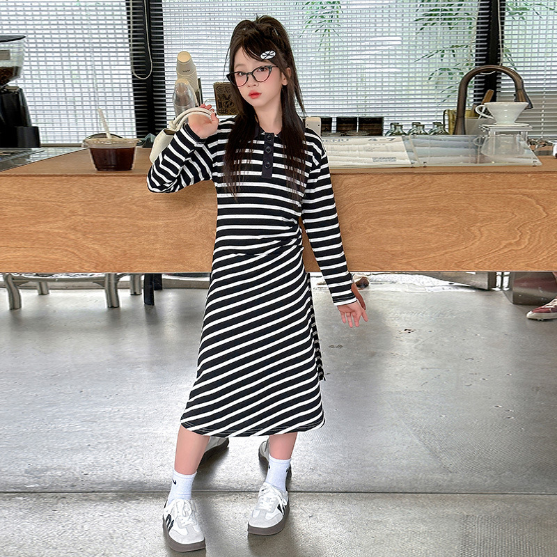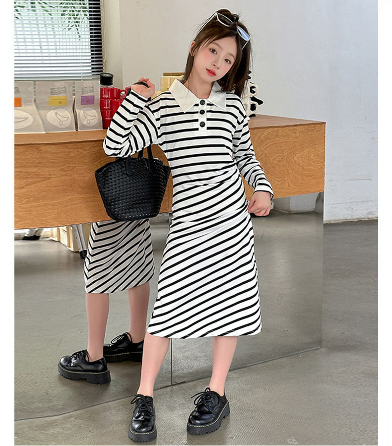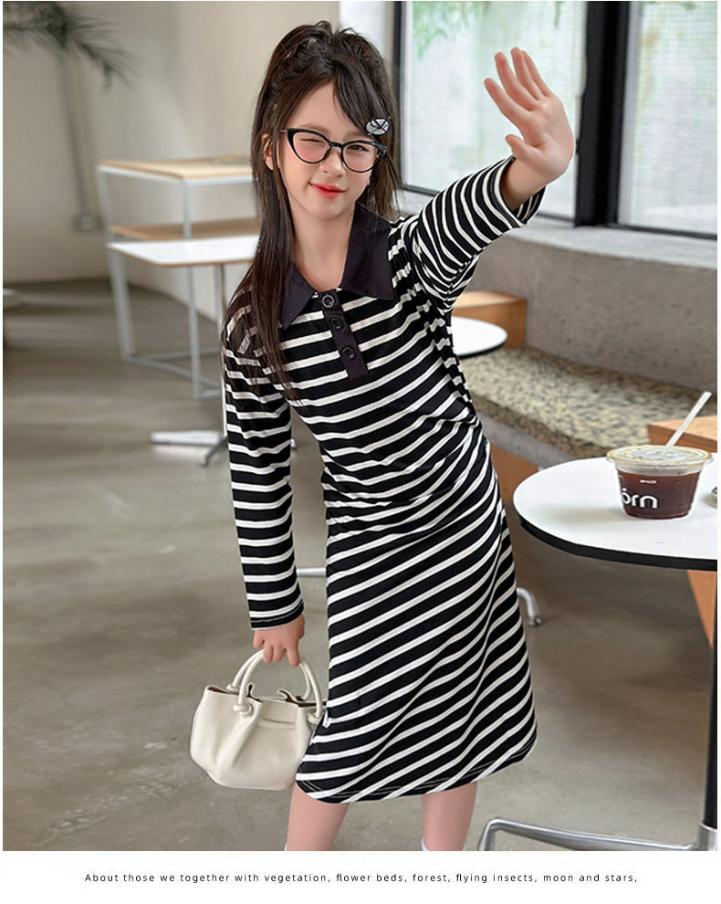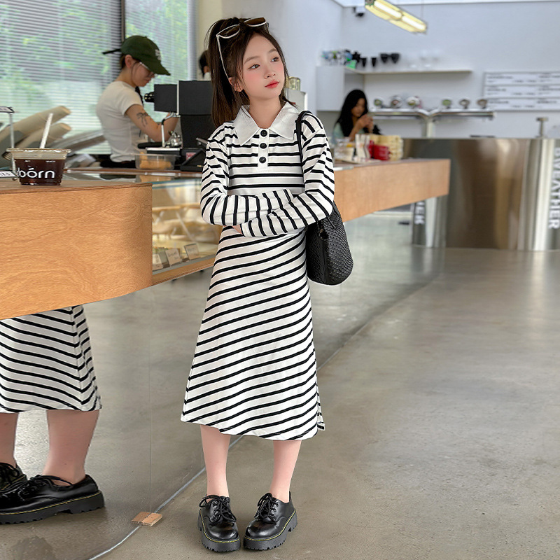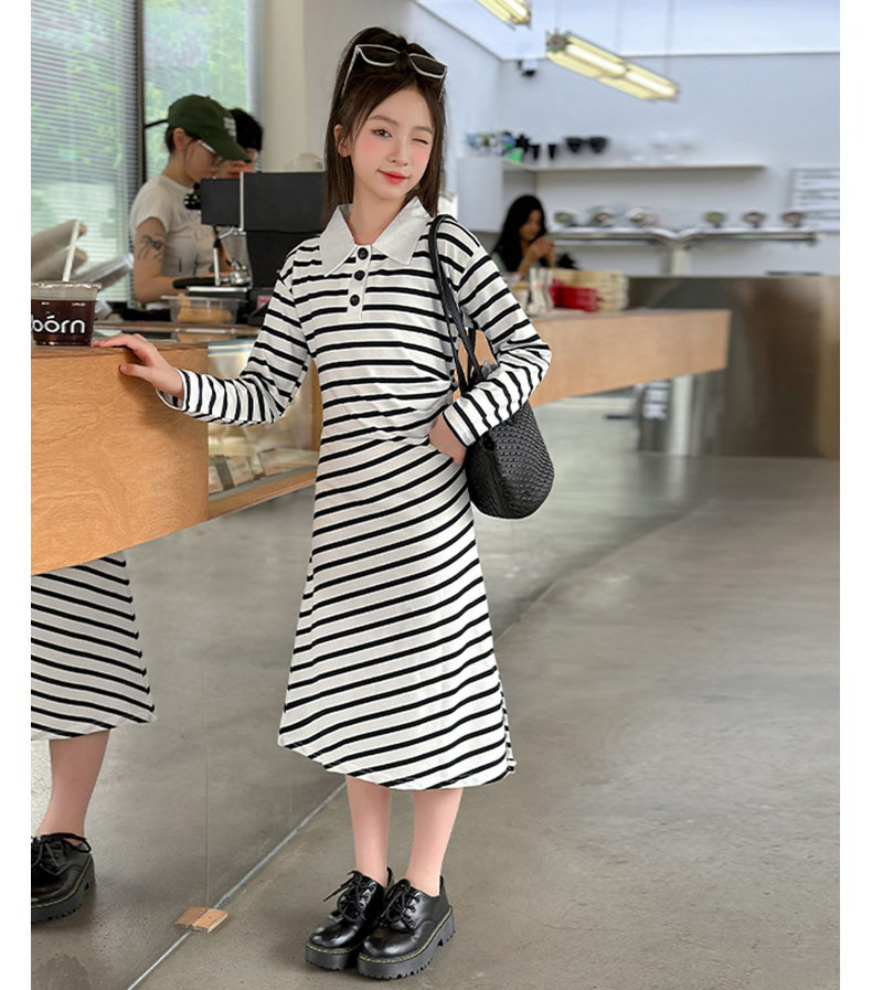 소녀의 봄과 가을 폴로 칼라 한국식 옷깃 공주 원피스 줄무늬 니트 긴팔 슬림 핏 원피스 스타일라인 원피스