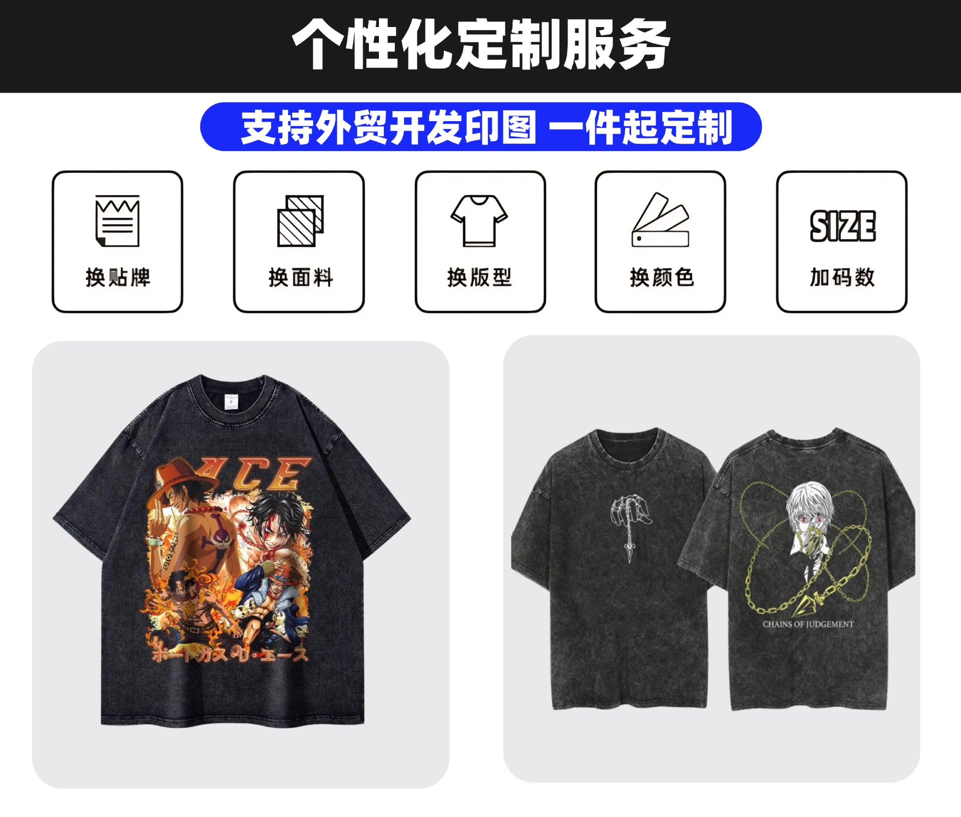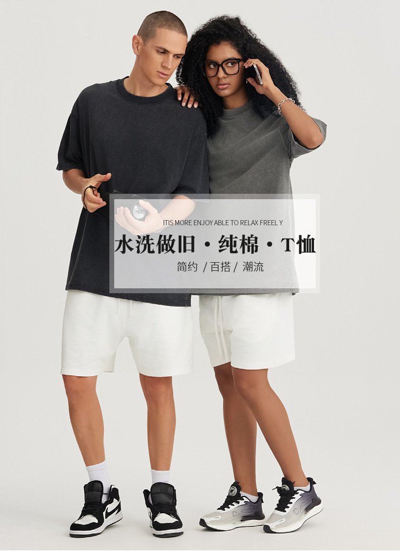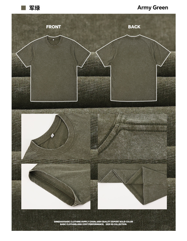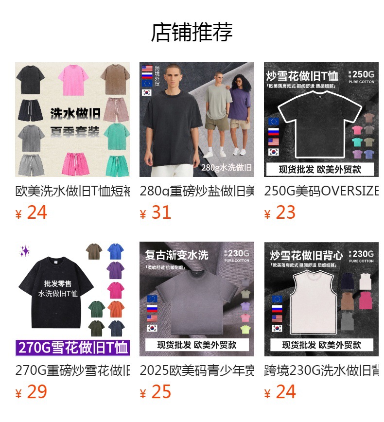 这款是230G纯棉蜡染水洗工艺做旧T恤,外贸热销款。常规备货50W+件现货,欧美尺码S-5XL。可按客户要求定制LOGO,洗水唛、吊牌、包装袋等。默认10件一袋包装,量大联系客服报价。