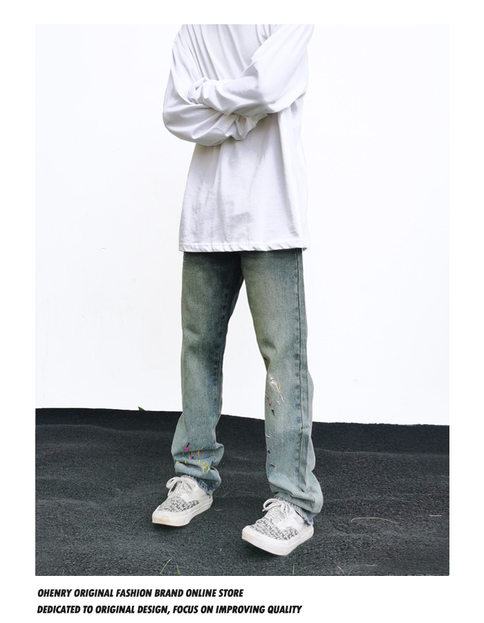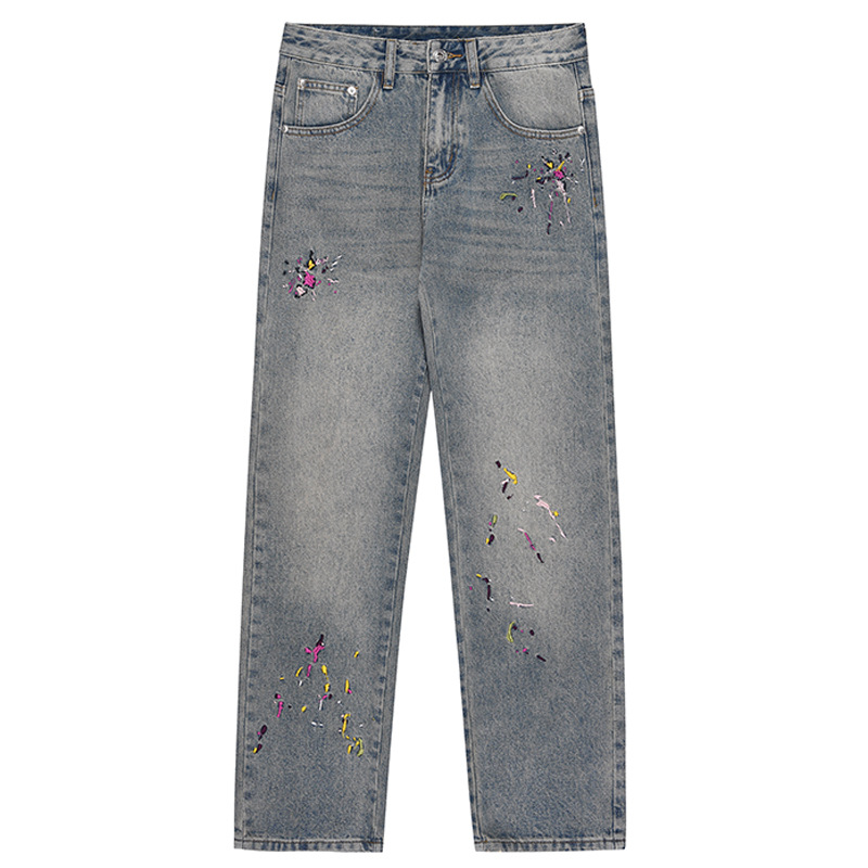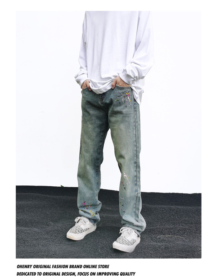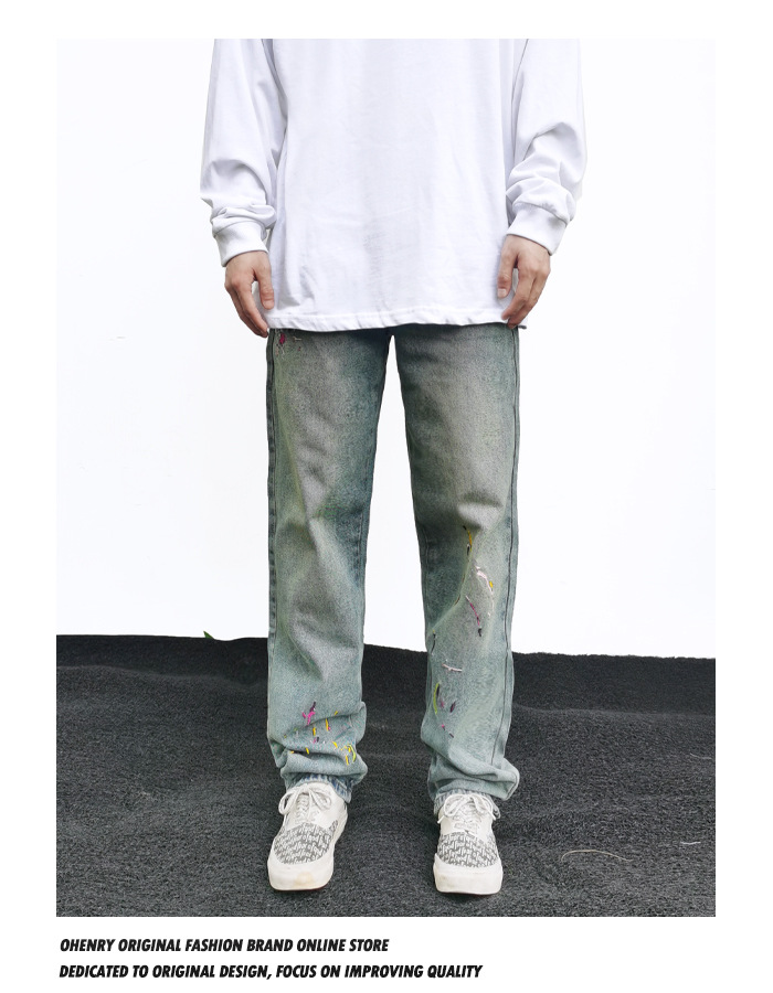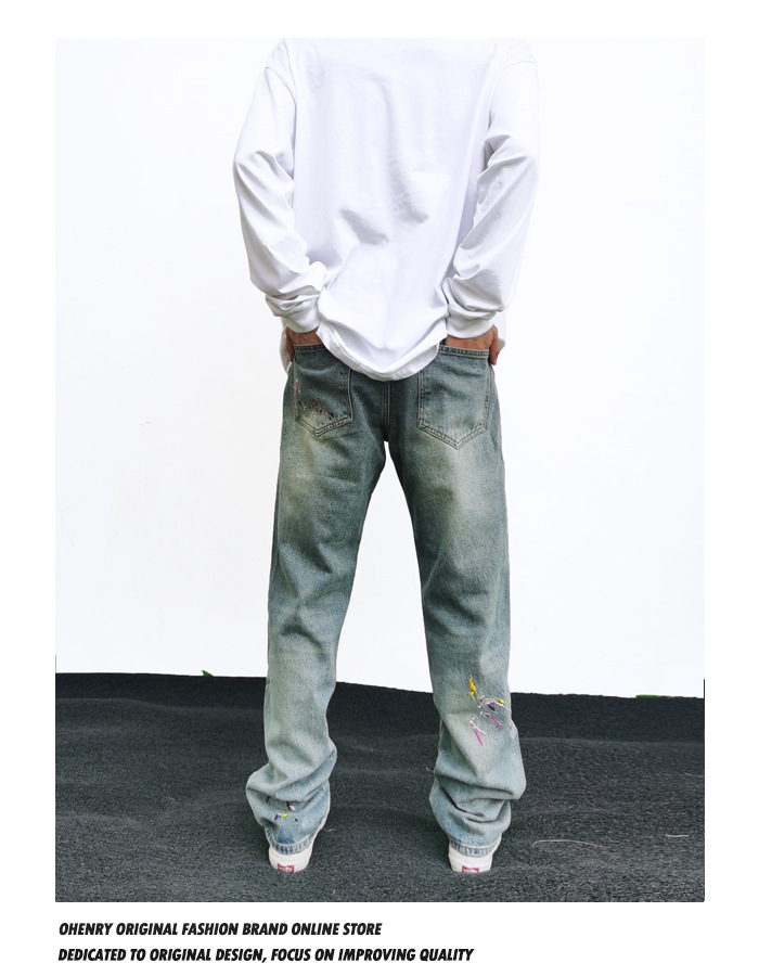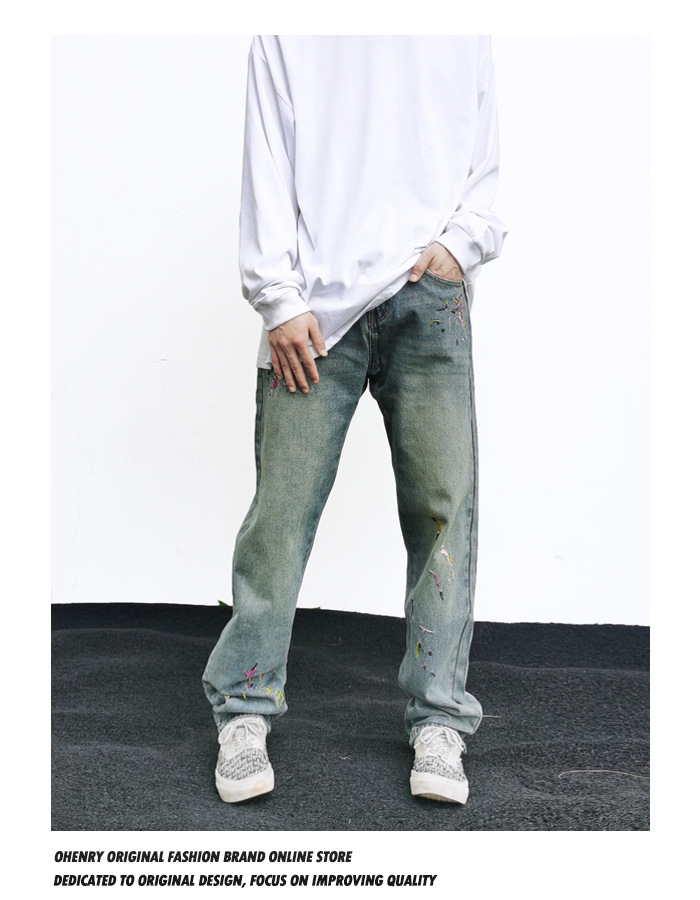 2024 남성 패션 바지 스플래시 잉크 자수 세척 느슨한 직선 청바지 미국 캐주얼 바지 남성 캐주얼스토어 가기