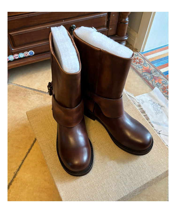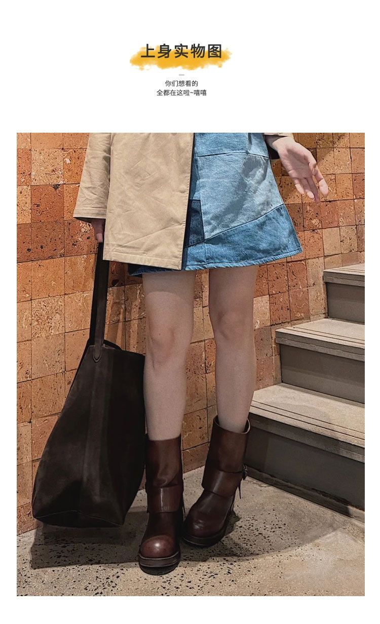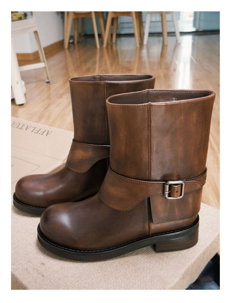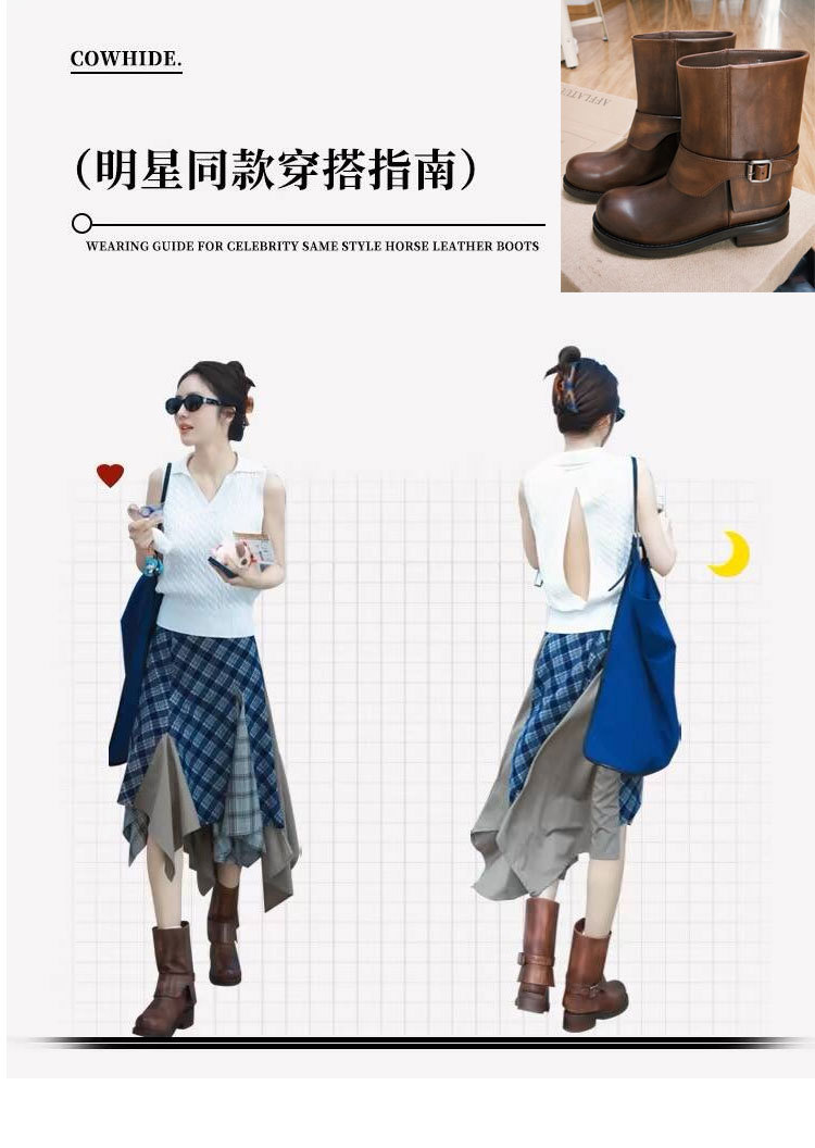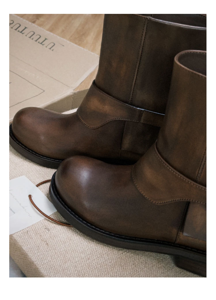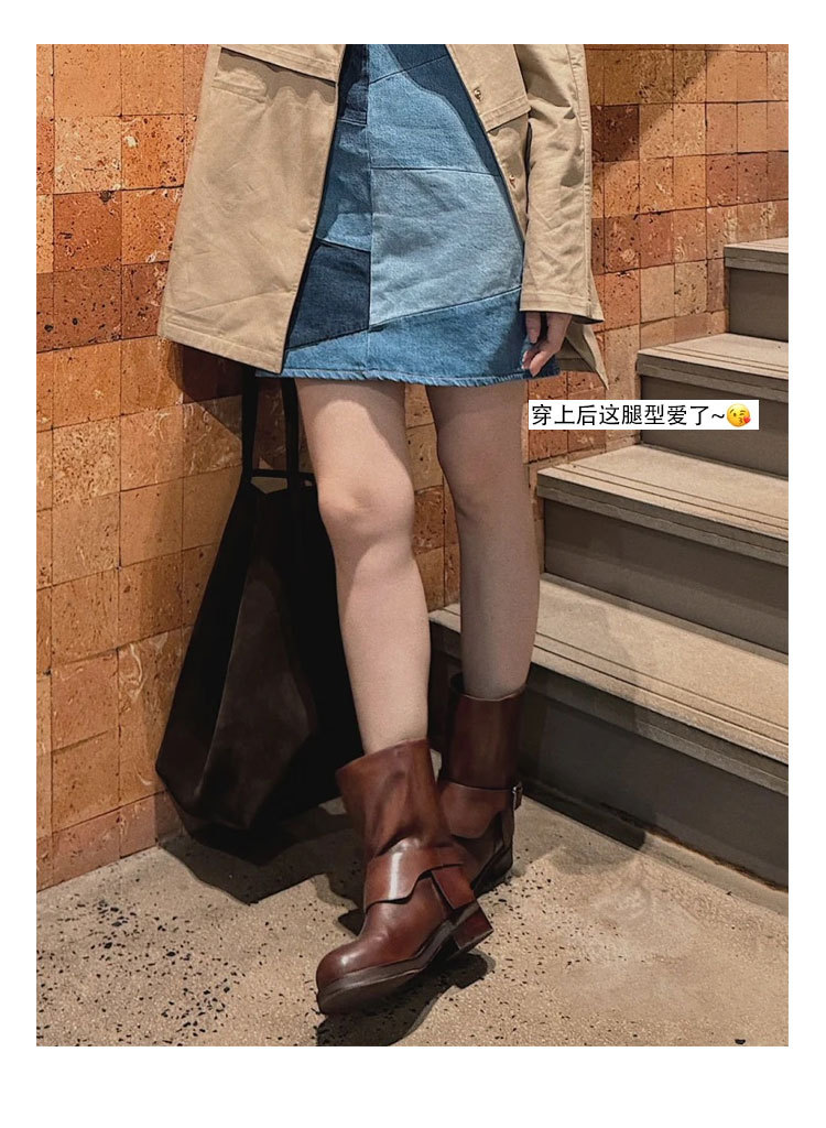 Cai Wenjing Zhou Yutong 동일 스타일 레트로 정품 가죽 라운드 발가락 중간 두께의 짧은 뒤꿈치 망토 부츠 여성의 새로운 컬러 광택 마틴 부츠스토어 가기