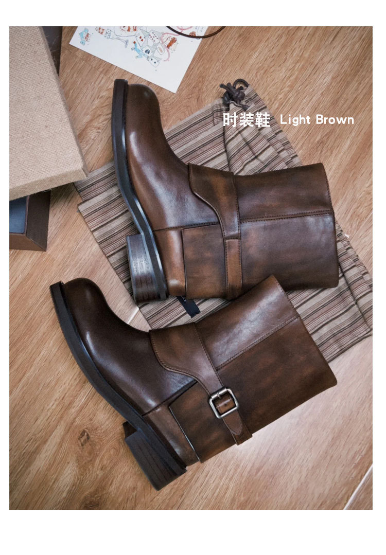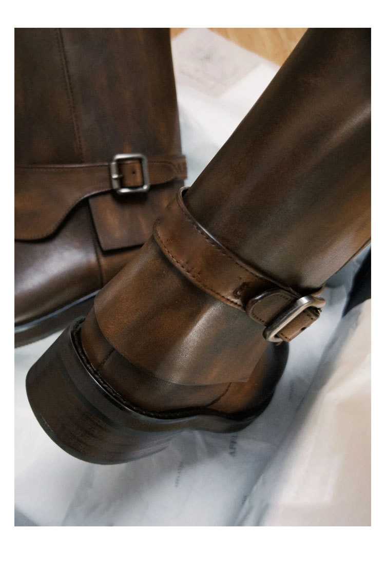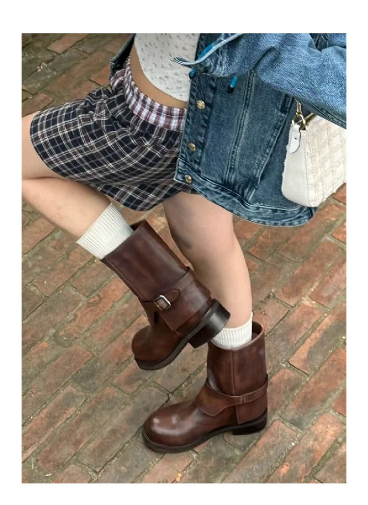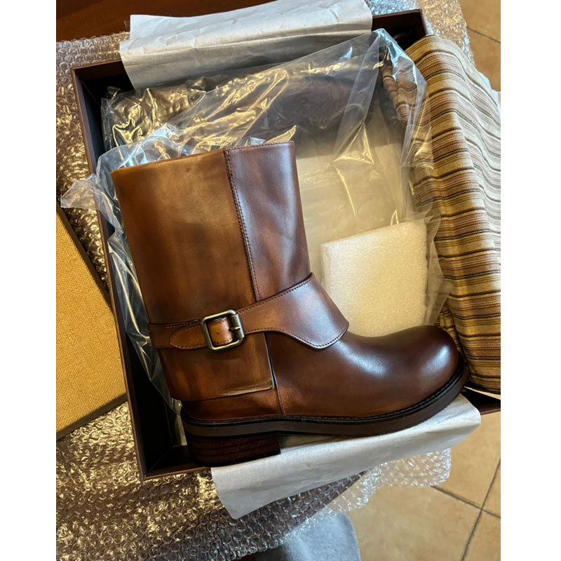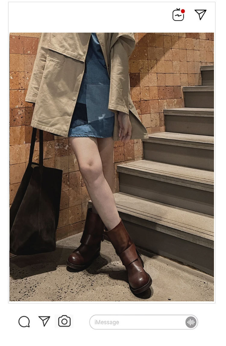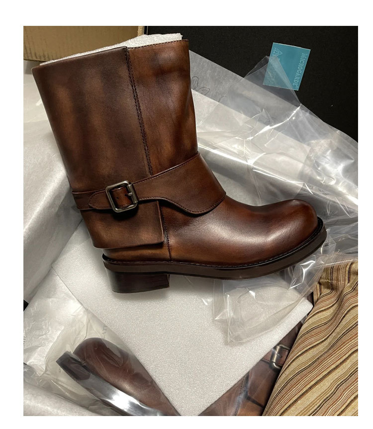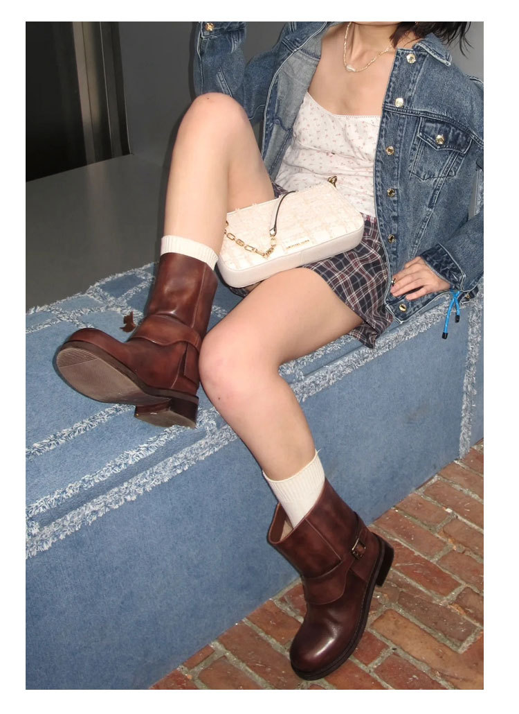 Cai Wenjing Zhou Yutong 동일 스타일 레트로 정품 가죽 라운드 발가락 중간 두께의 짧은 뒤꿈치 망토 부츠 여성의 새로운 컬러 광택 마틴 부츠스토어 가기