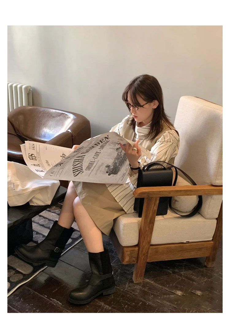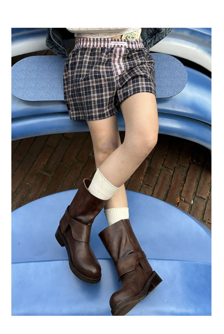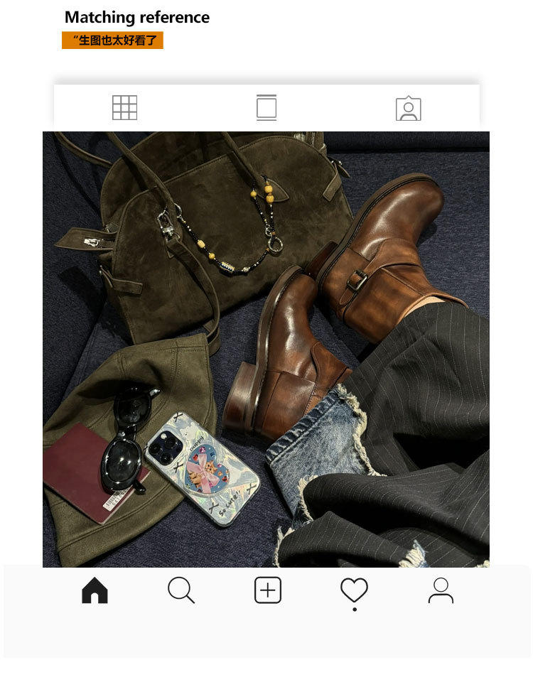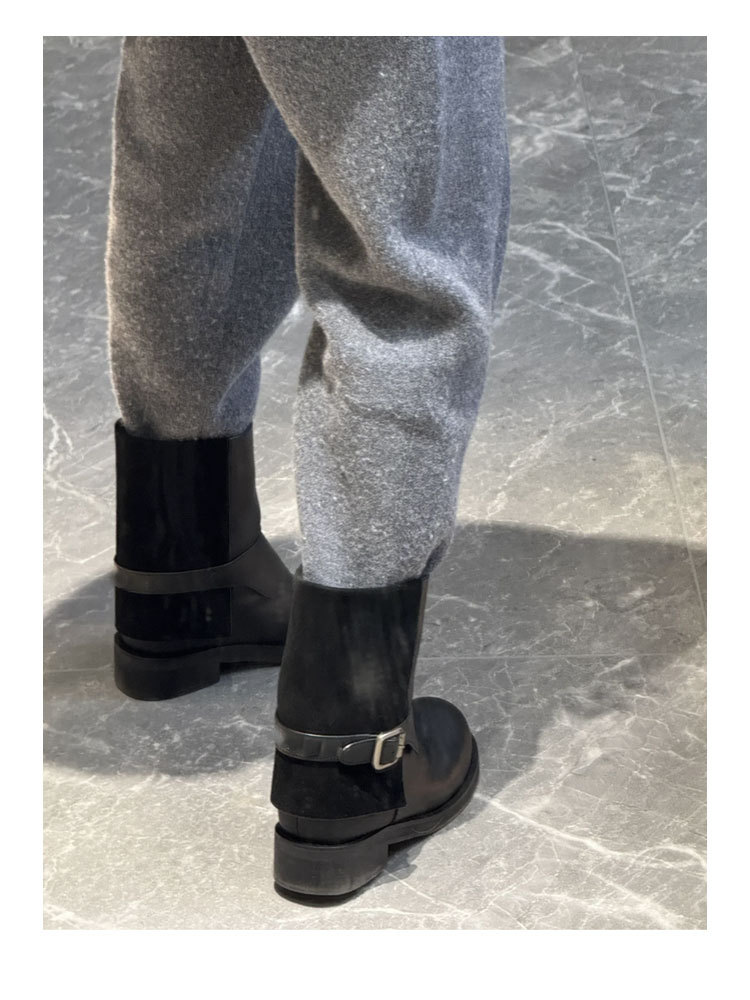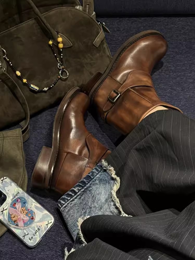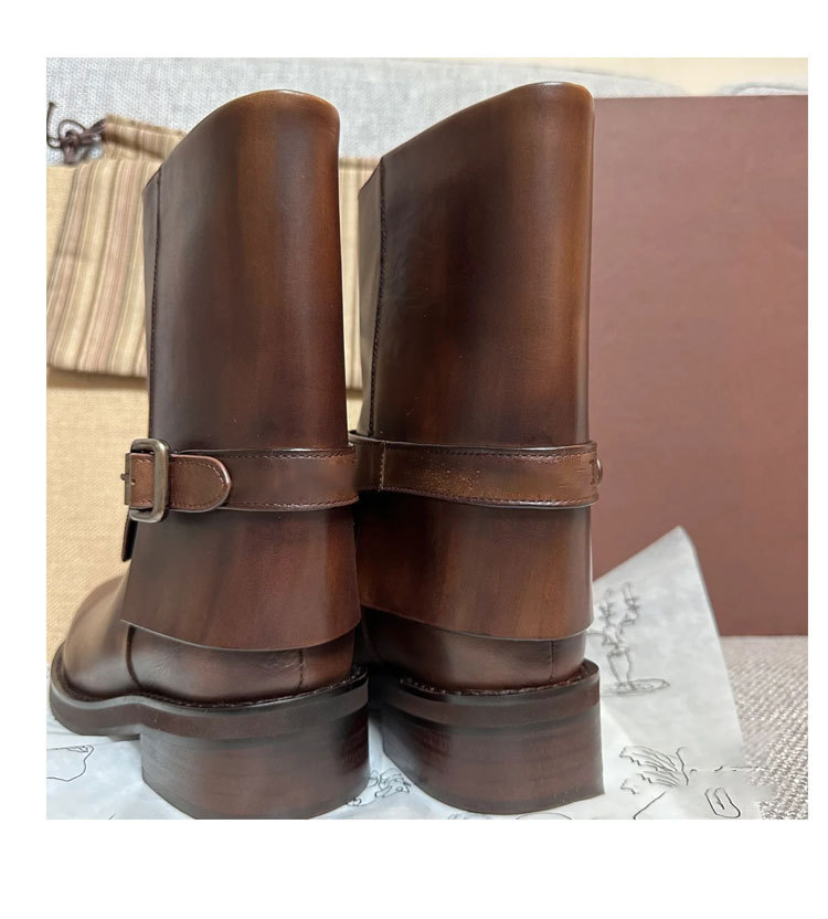 Cai Wenjing Zhou Yutong 동일 스타일 레트로 정품 가죽 라운드 발가락 중간 두께의 짧은 뒤꿈치 망토 부츠 여성의 새로운 컬러 광택 마틴 부츠스토어 가기