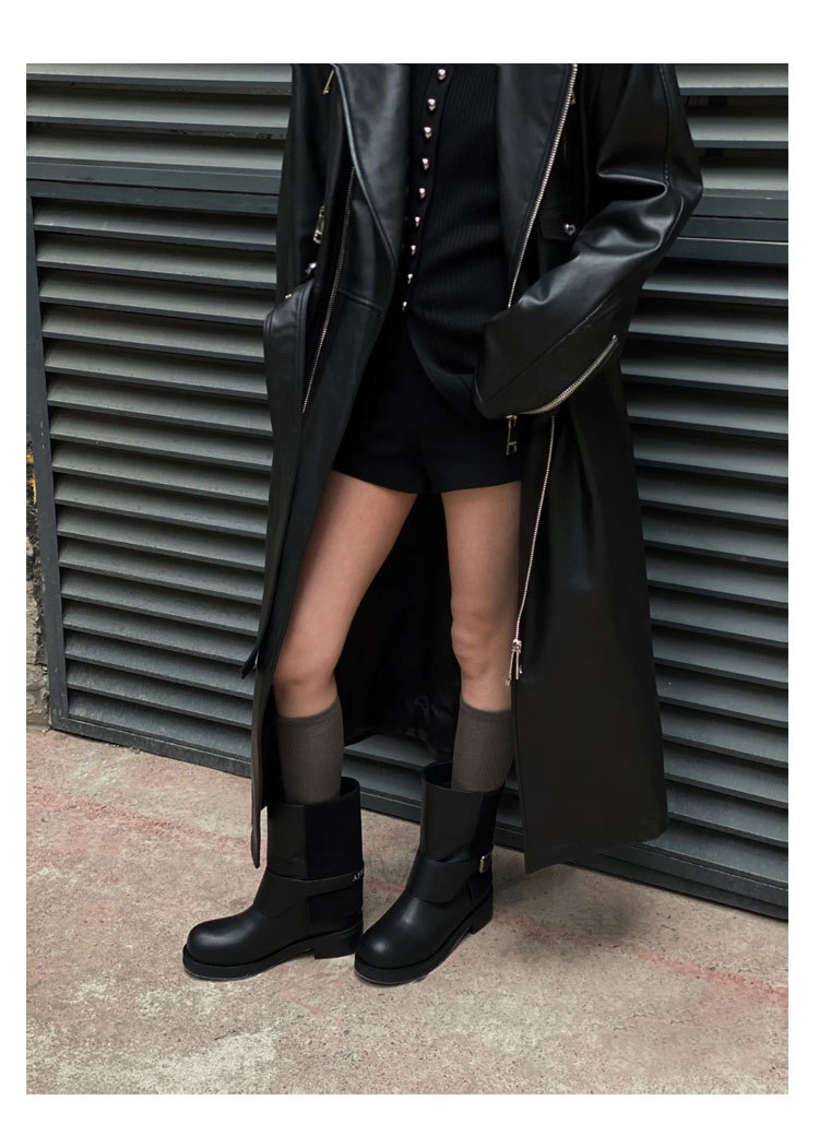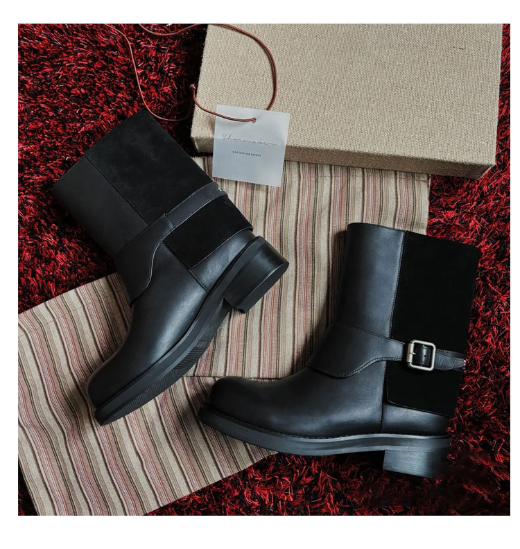 Cai Wenjing Zhou Yutong 동일 스타일 레트로 정품 가죽 라운드 발가락 중간 두께의 짧은 뒤꿈치 망토 부츠 여성의 새로운 컬러 광택 마틴 부츠