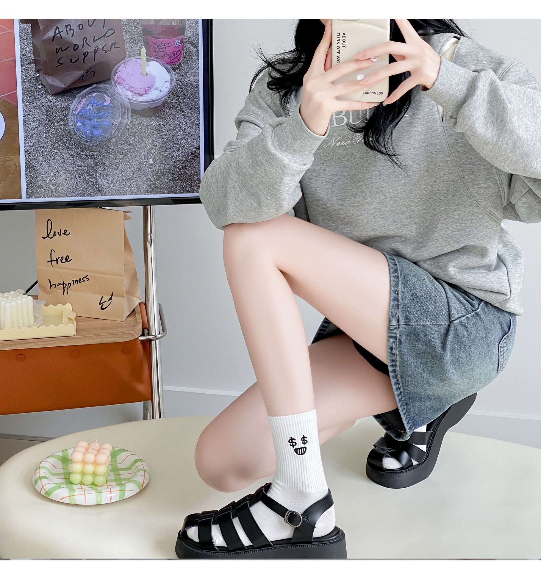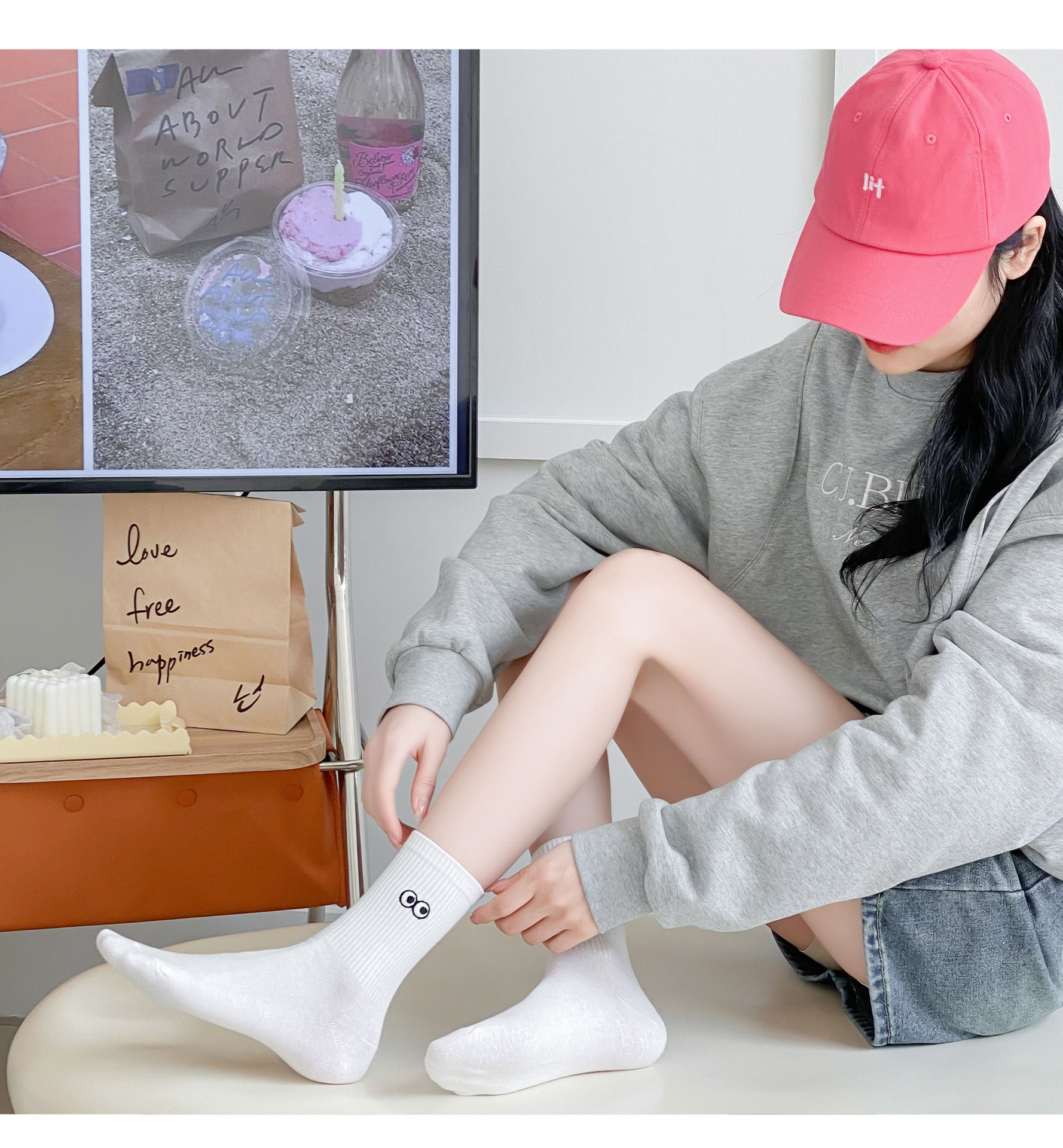 재미있는 자수 양말 어린이 가을과 겨울 높은 고무 가닥 중간 튜브 양말 메쉬 적외선 착용 연인 양말 흰색 끈 스타킹스토어 가기