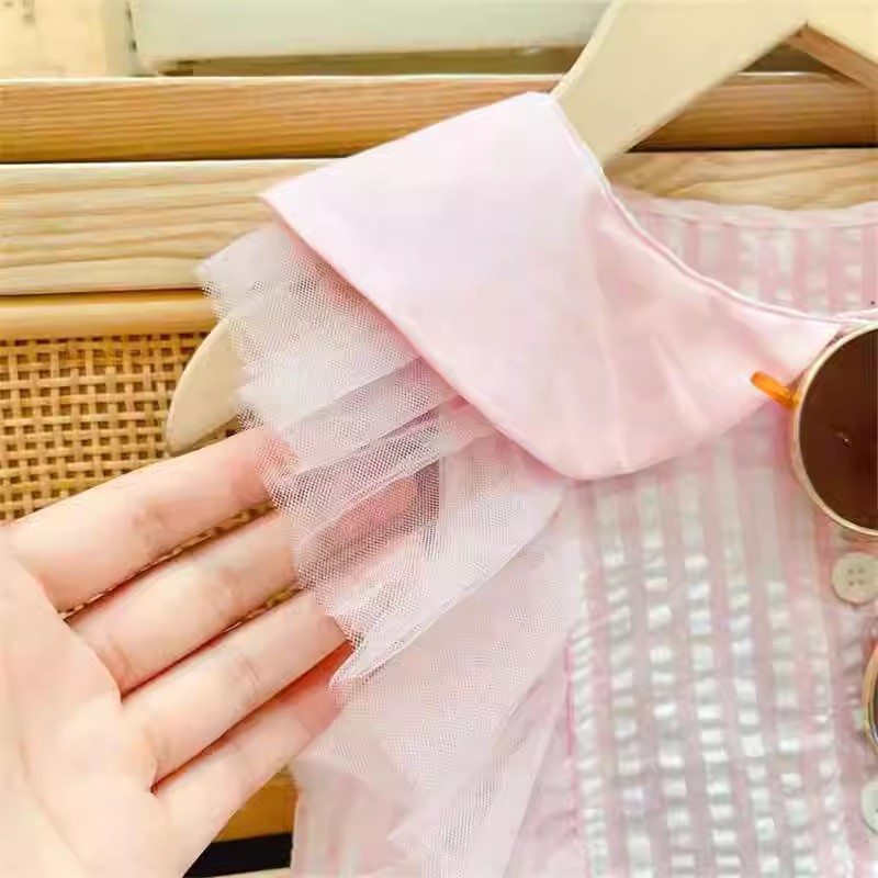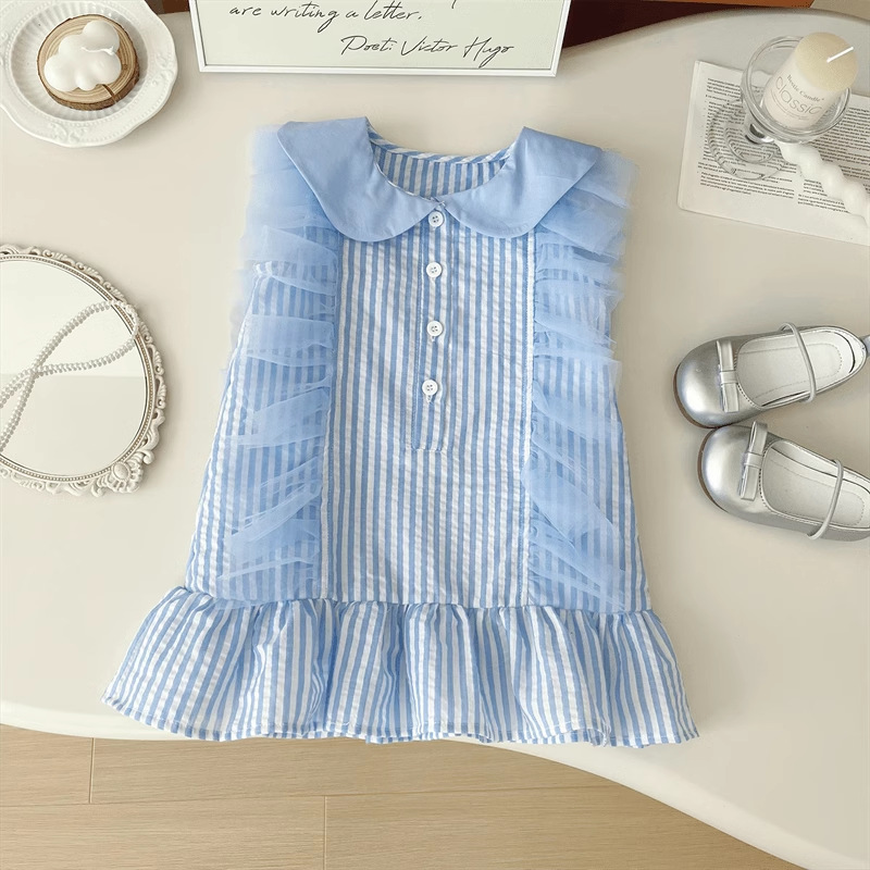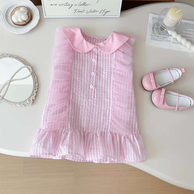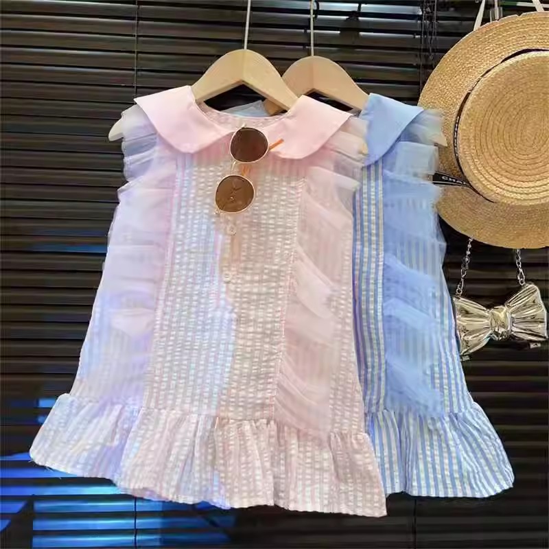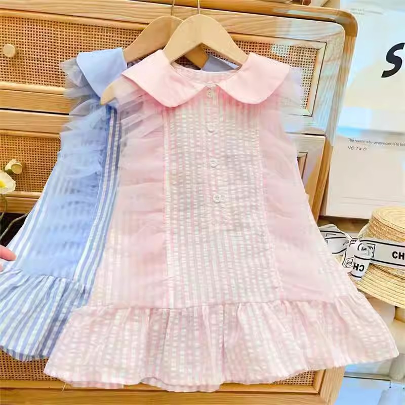 2024 여름 새로운 한국 스타일 소녀의 줄무늬 메쉬 바느질 민소매 원피스 소녀의 귀여운 조끼 공주 원피스스토어 가기