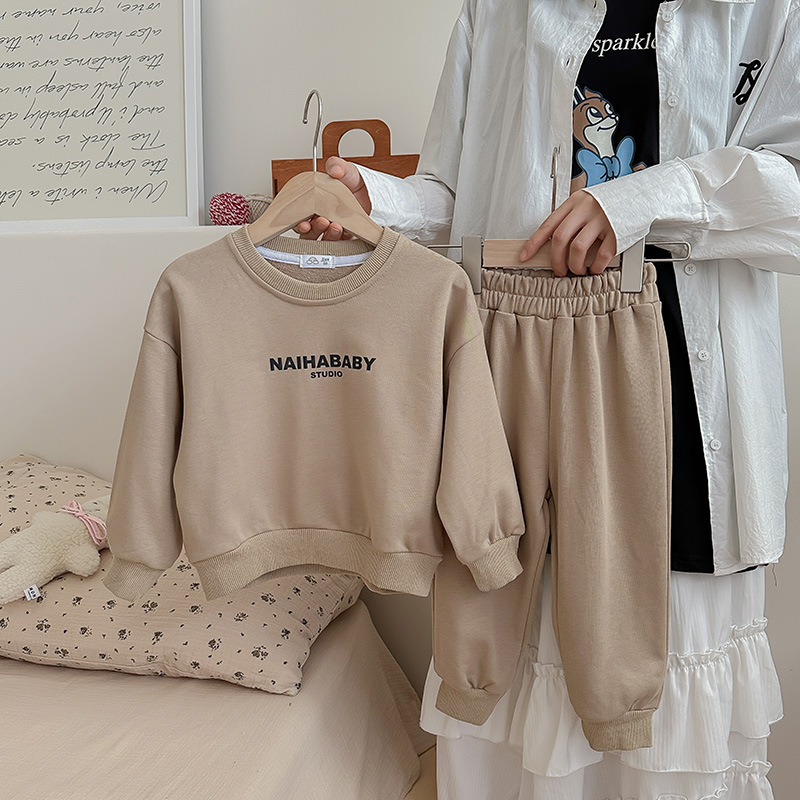 INS 가을 2025 새로운 한국 스타일 아동복 면 레터 컬러 스웨트 셔츠 + 소년 소녀용 바지 세트스토어 가기