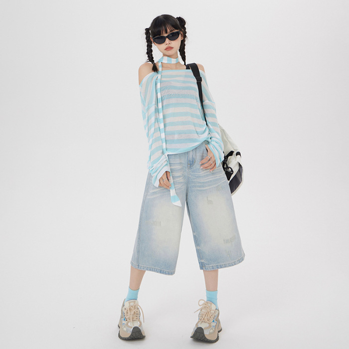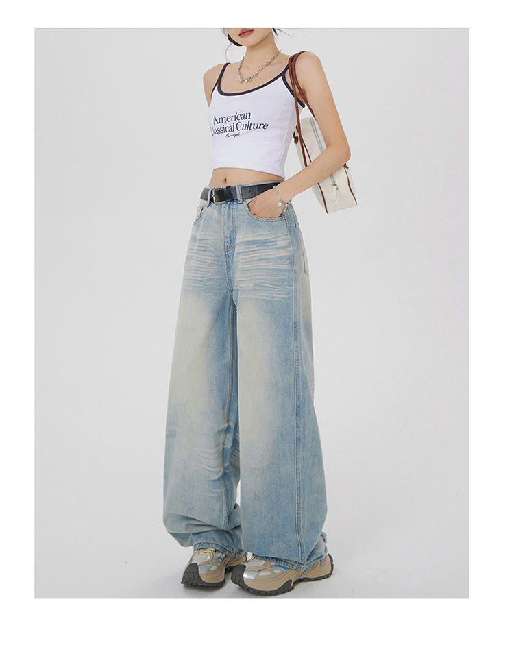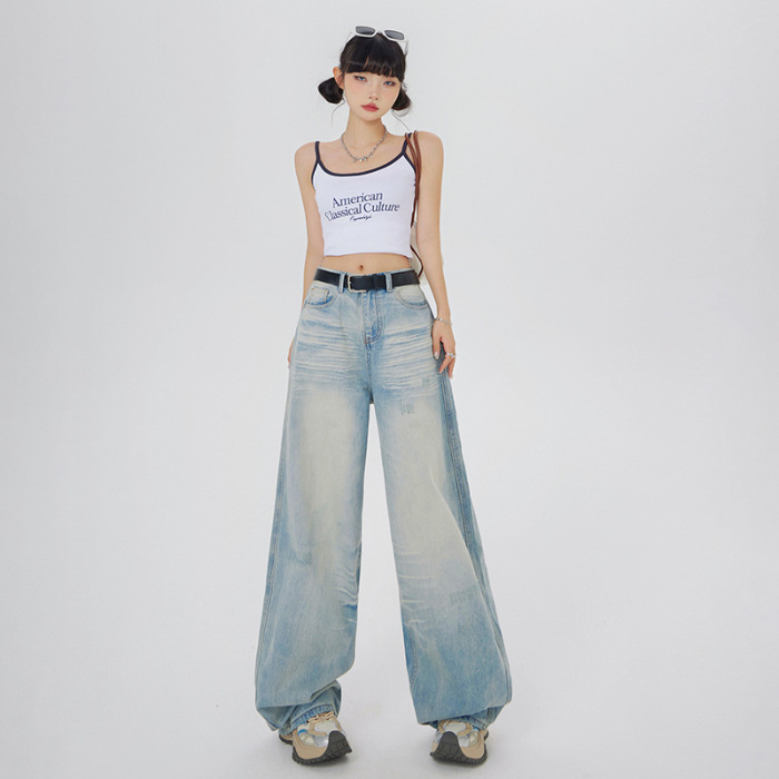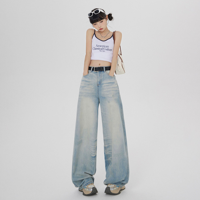 아메리칸 스타일 레트로 세척 느슨한 와이드 레그 청바지 여성의 2024 여름 높은 허리 슬리밍 올 매치 트렌디 리핑 스트레이트 팬츠