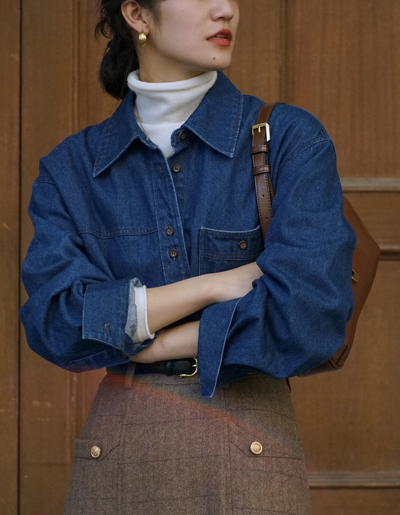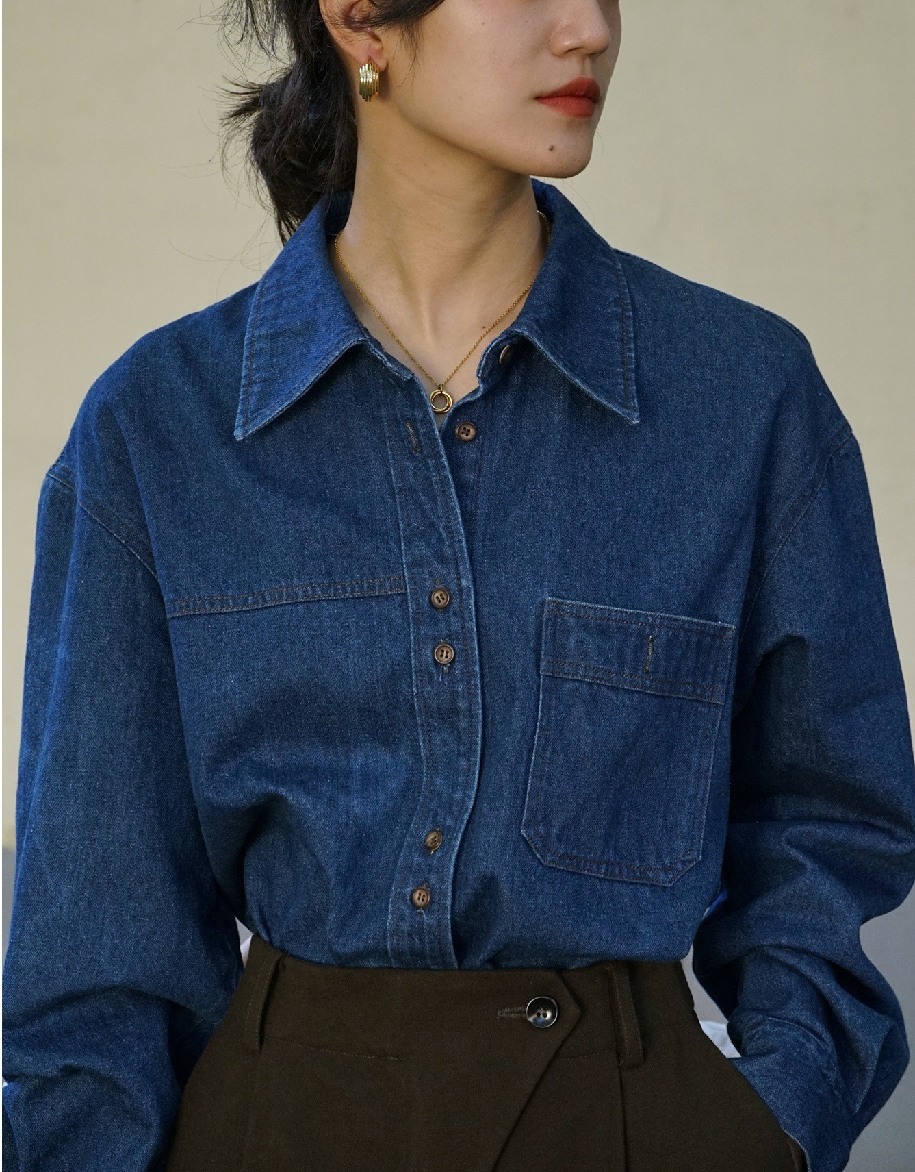 검은 서점 조용한 스타일 면 예술적 복고풍 여성을위한 긴팔 클래식 스택 데님 셔츠
