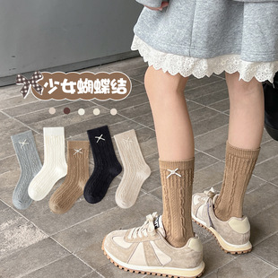 minliu女童袜子批发春秋复古纯色中筒袜珍珠蝴蝶结儿童袜秋冬棉袜