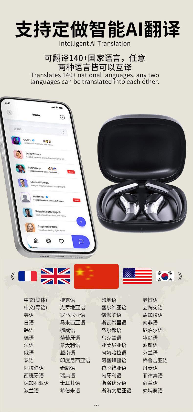 翻译耳机、AI智能耳机、实时翻译耳机、语音翻译器、蓝牙耳机、TWS耳机、无线耳机、运动耳机、降噪耳机