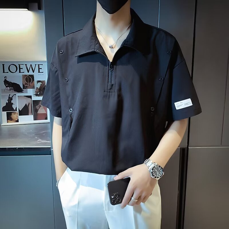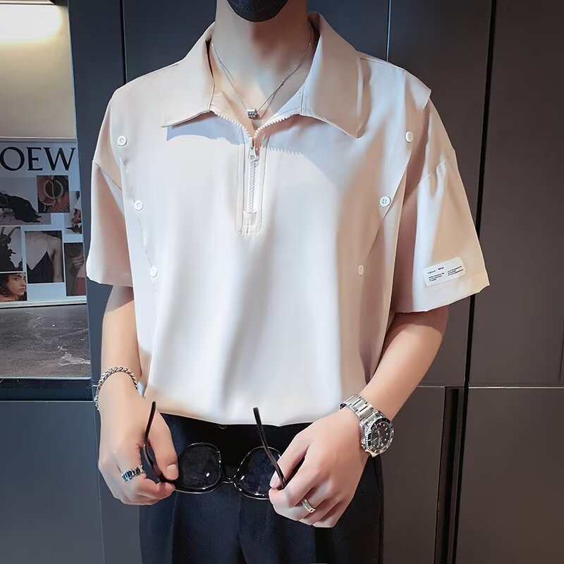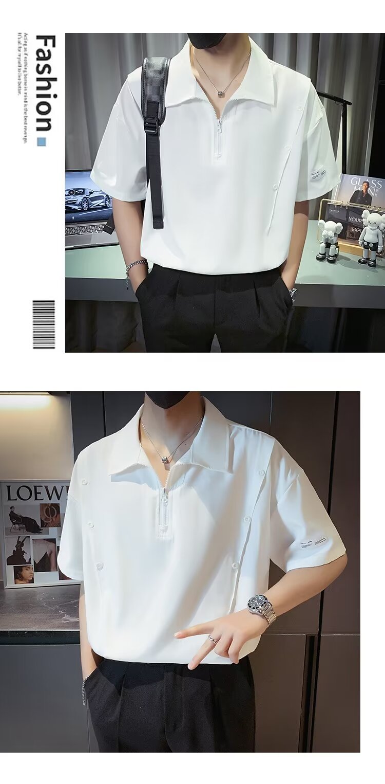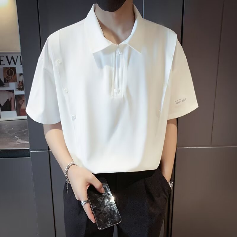 반 지퍼 아이스 실크 반팔 남성 디자인 센스 니쉬 셔츠 티셔츠 트렌디 한 브랜드 패셔블 탑 쿨 센스 반소매 폴로 셔츠