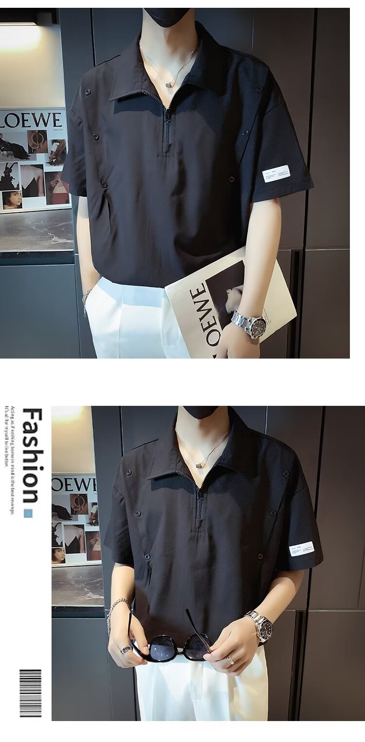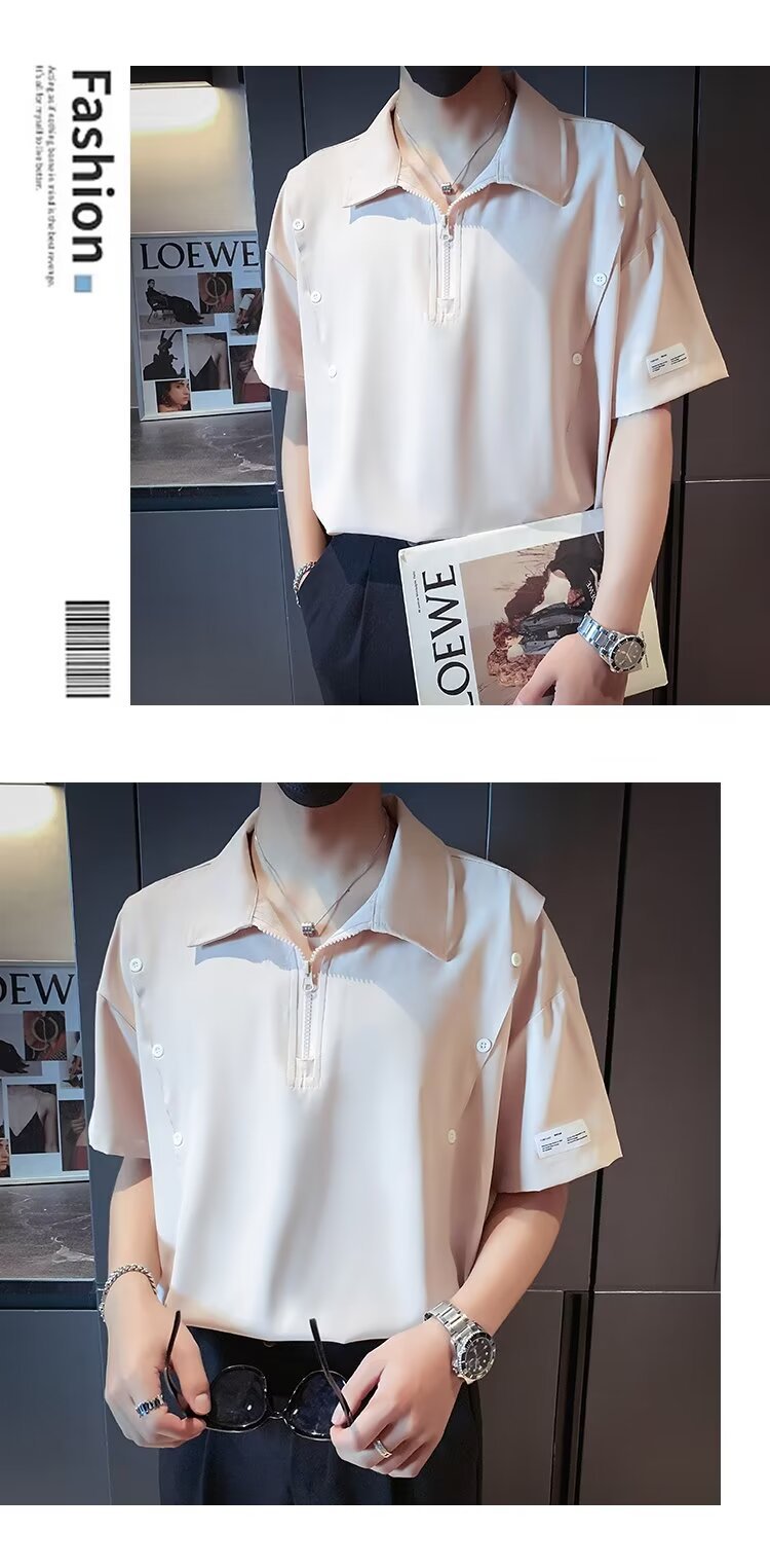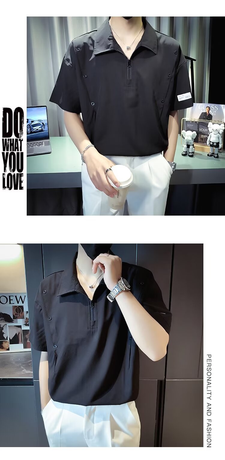 반 지퍼 아이스 실크 반팔 남성 디자인 센스 니쉬 셔츠 티셔츠 트렌디 한 브랜드 패셔블 탑 쿨 센스 반소매 폴로 셔츠