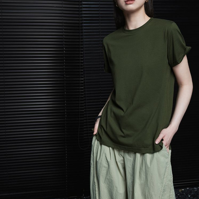 그린 코튼 반팔 티셔츠 여자 2024 년 여름 새로운 핫 숄더 루즈 올 매치 아메리칸 스타일 레트로