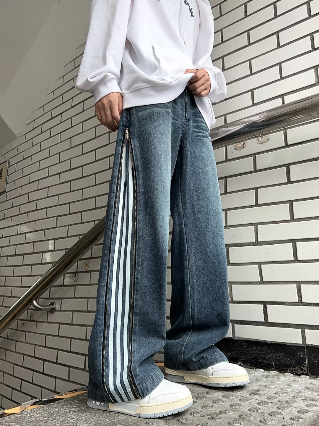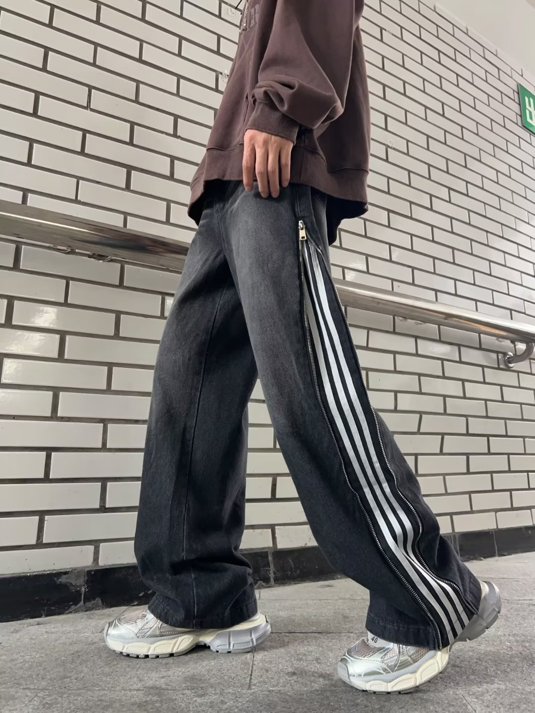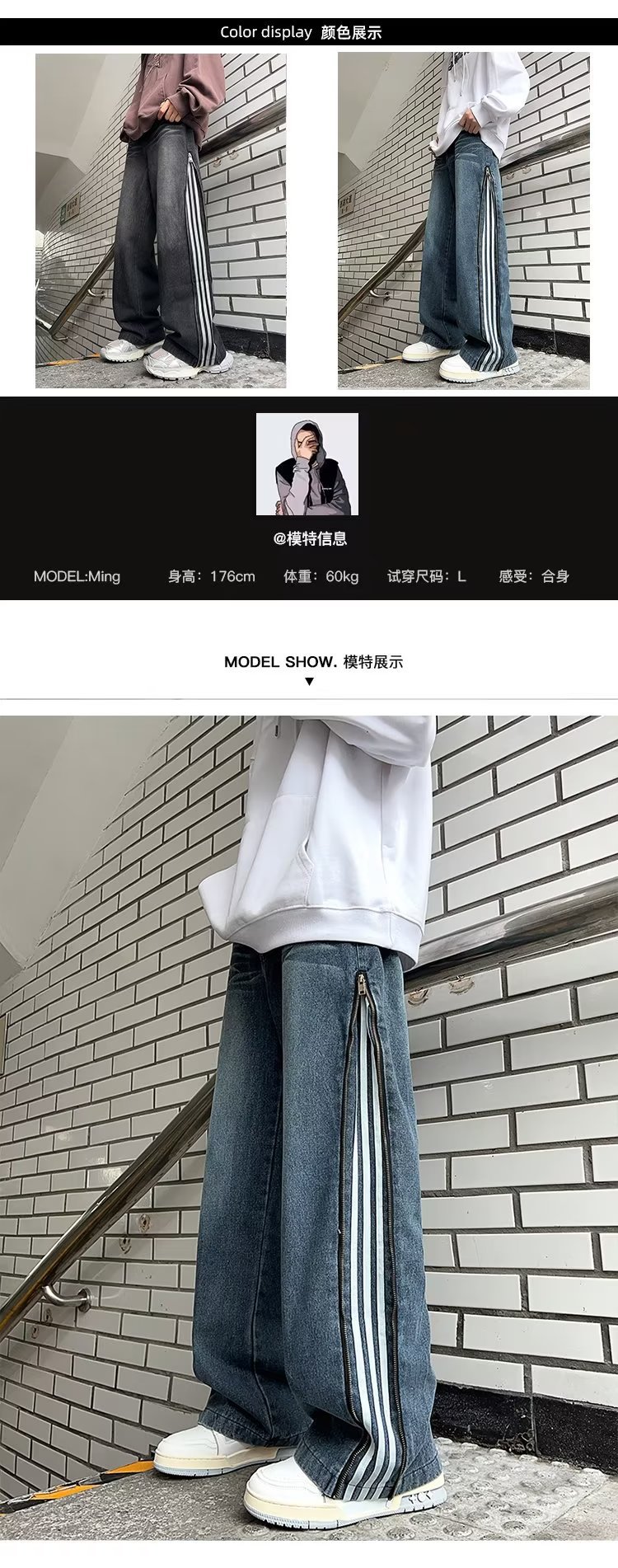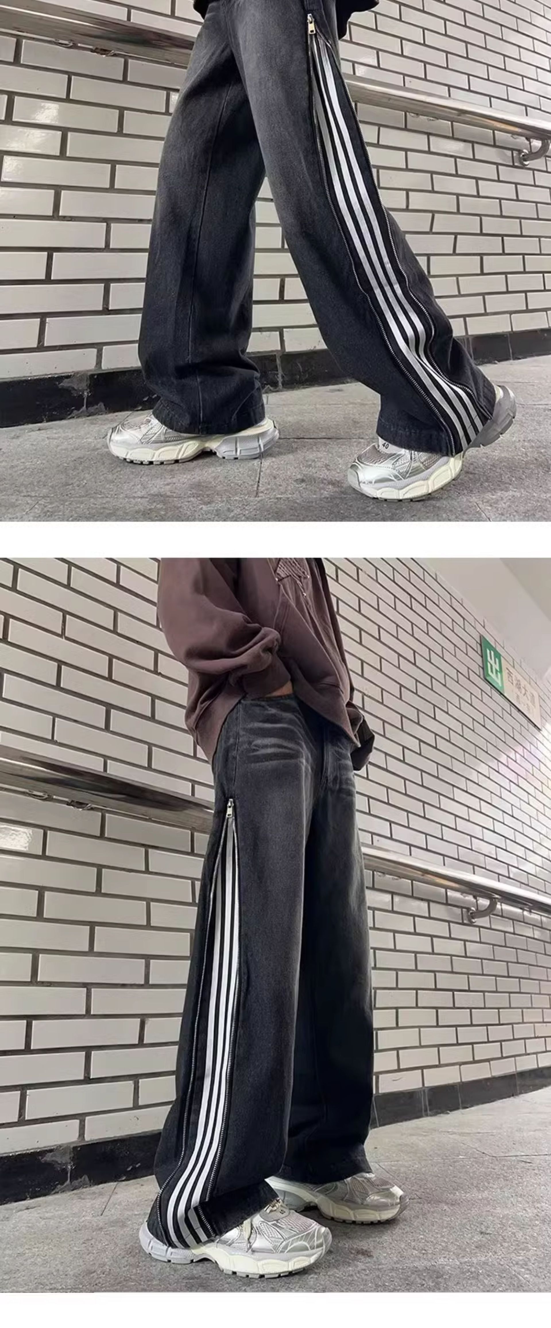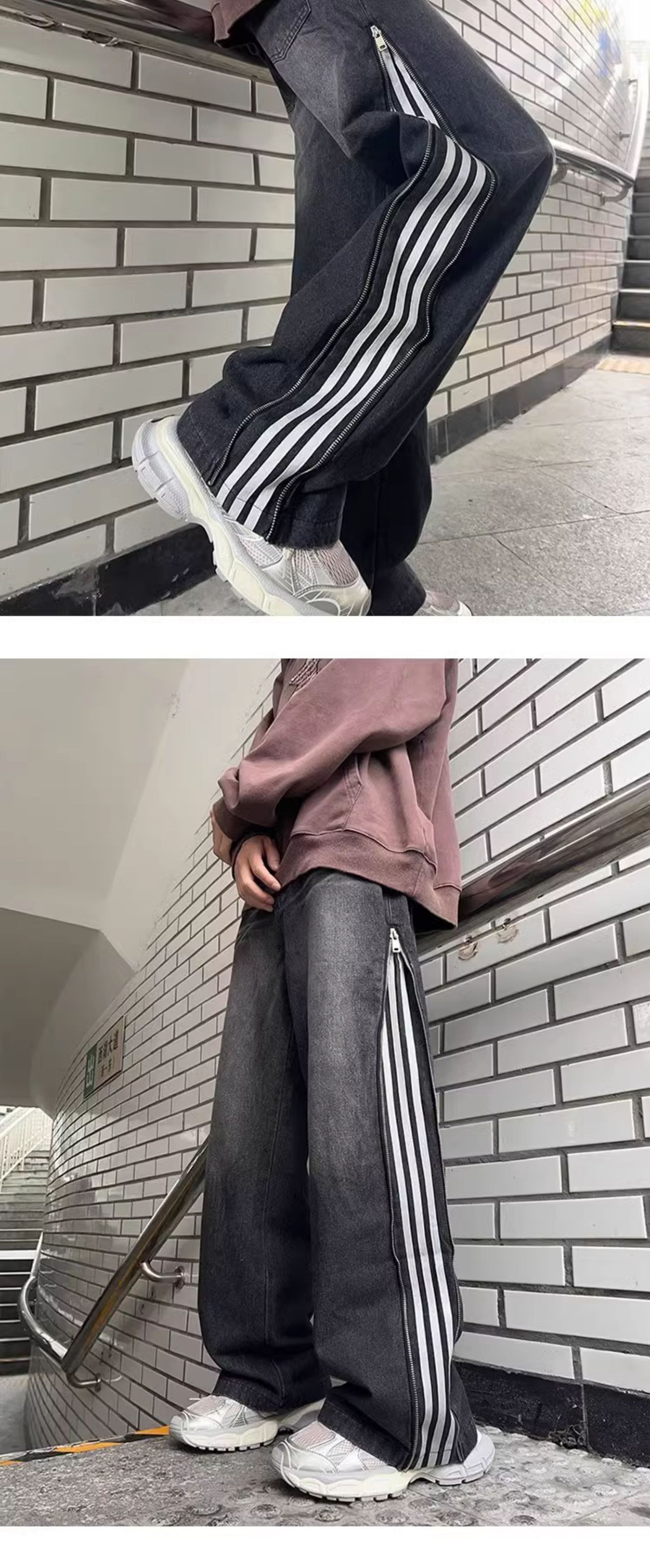 条纹黑色牛仔裤男春秋季美式复古三条杠裤子高街垂感宽松直筒长裤