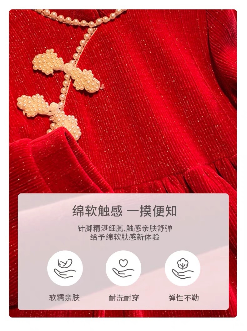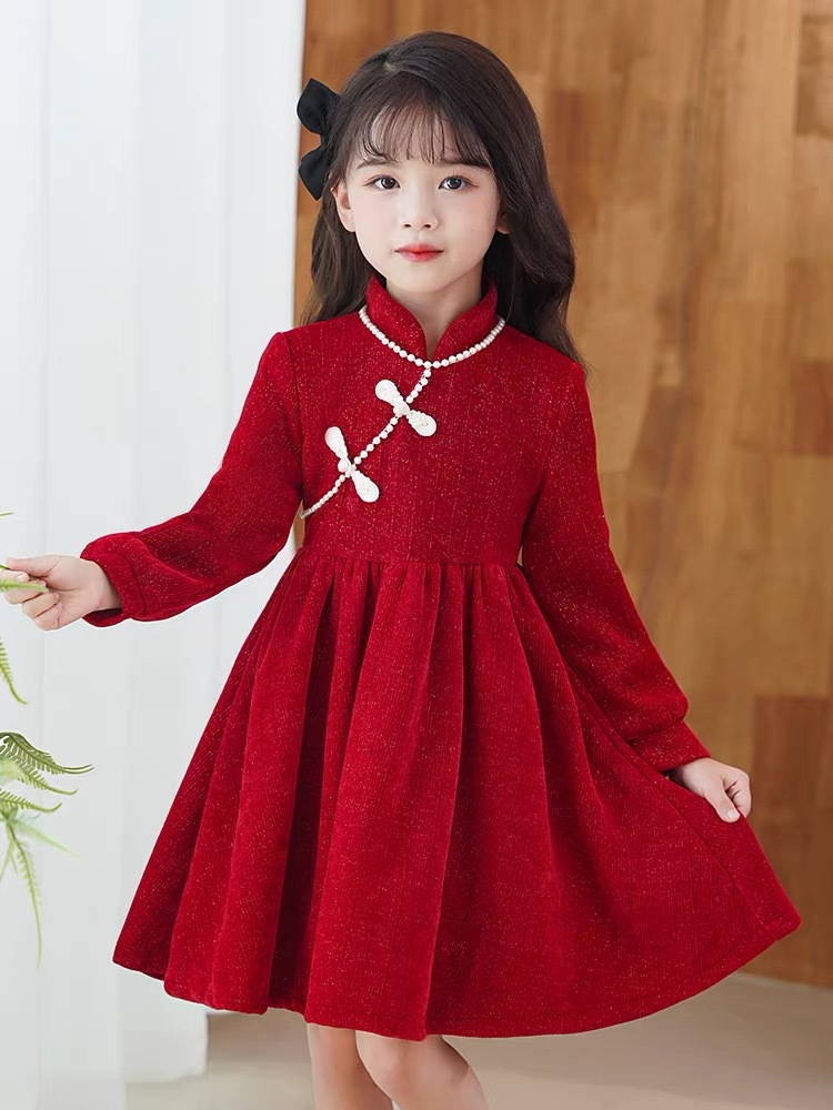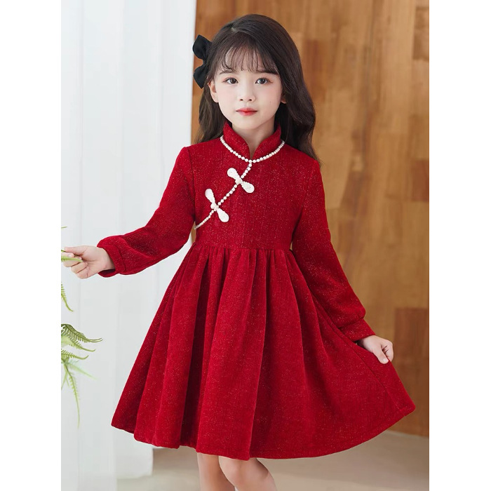 여자 새해 원피스 겨울 기모 어린이 새 중국 청삼 원피스 소녀 패션 레트로 레드 원피스