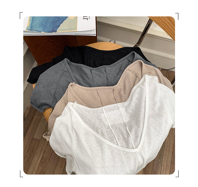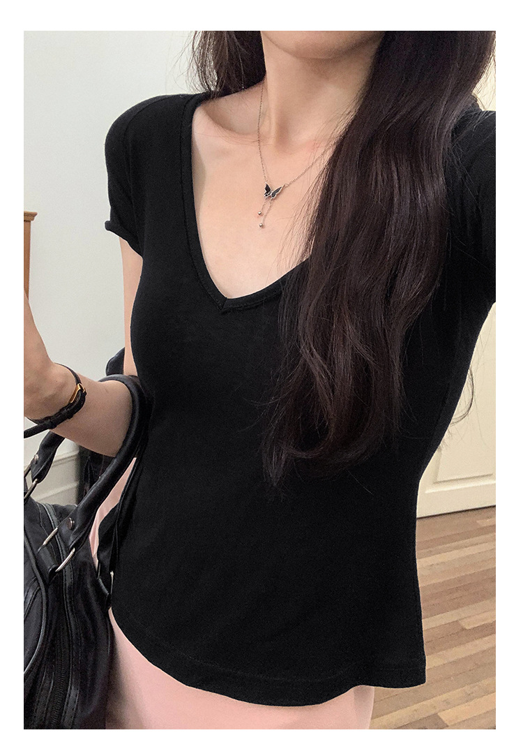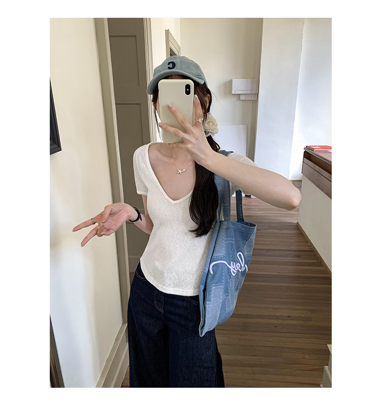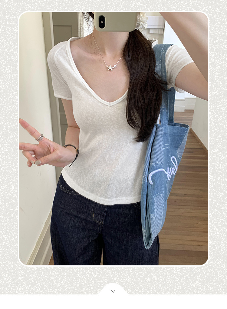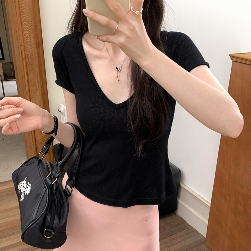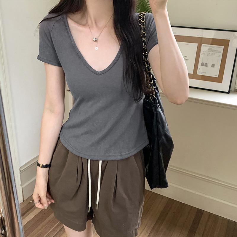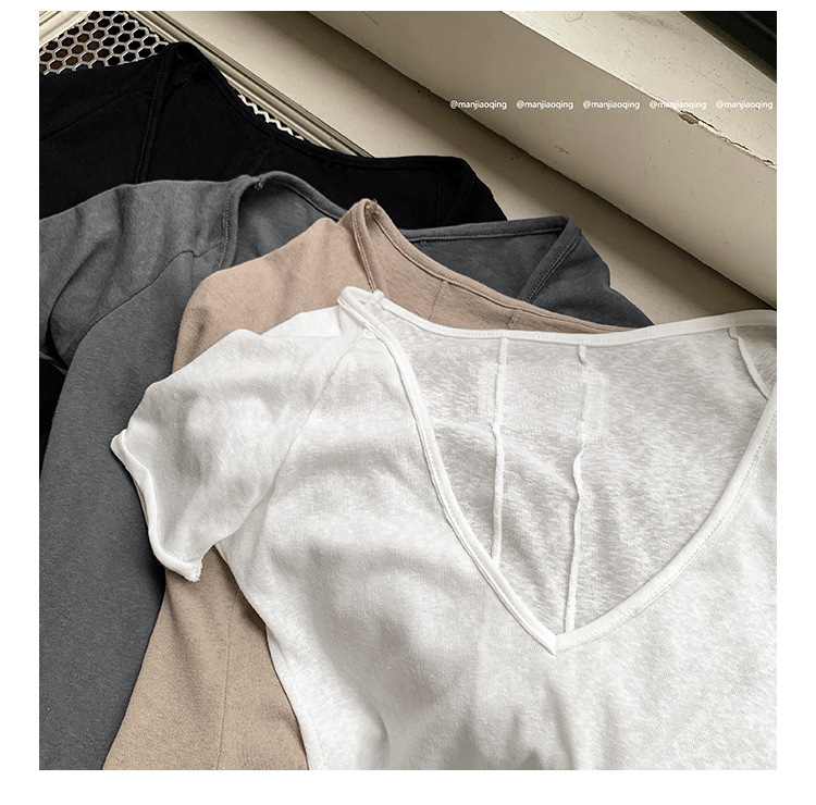 한국 스타일 Chic Niche V-neck Raglan 반팔 티셔츠 여자 여름 2024 새로운 간단한 올 매치 얇은 탑
