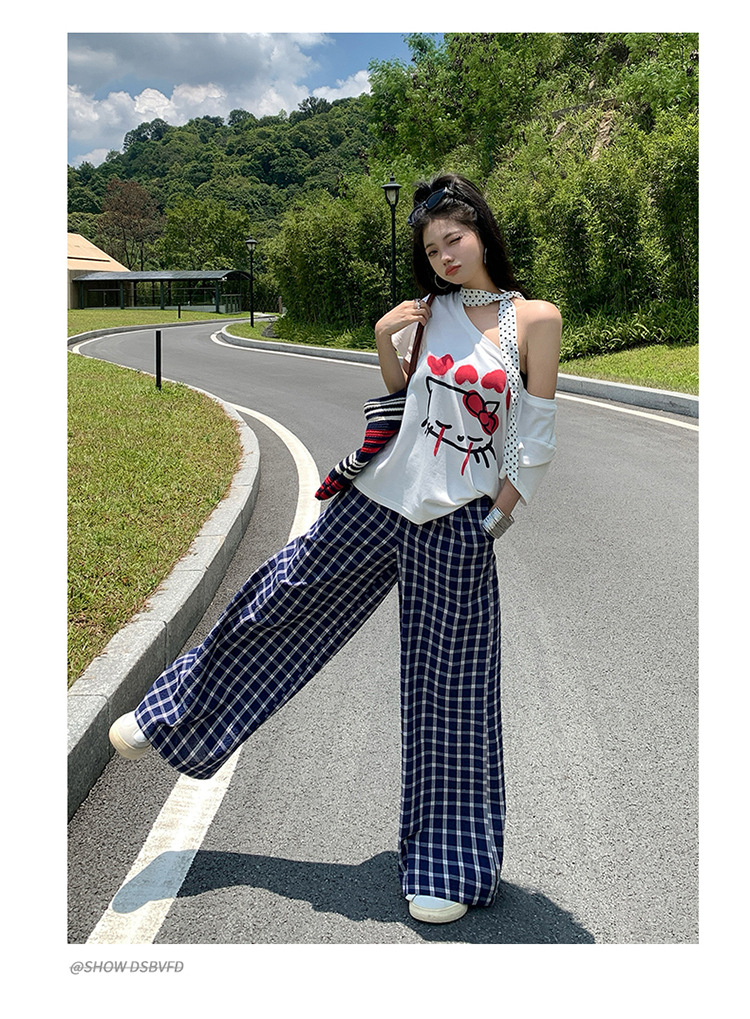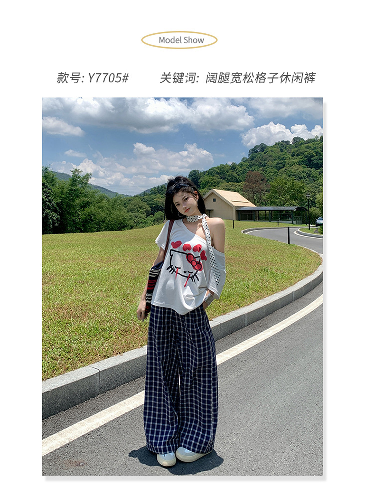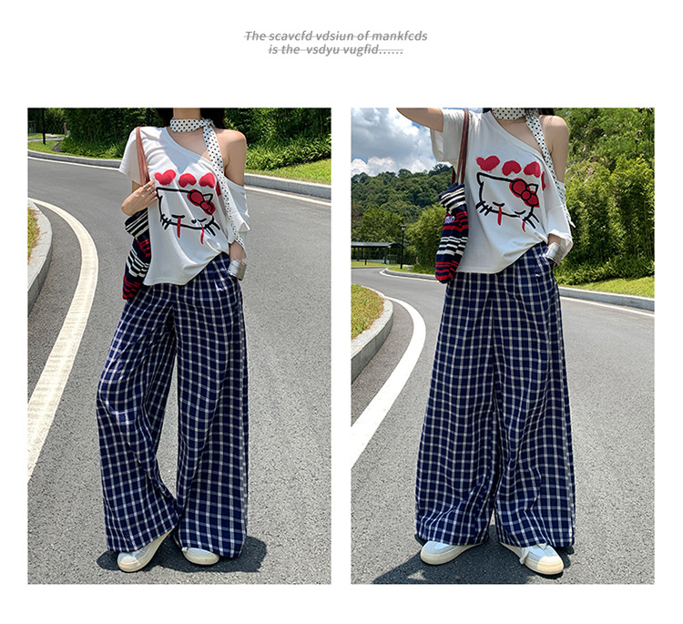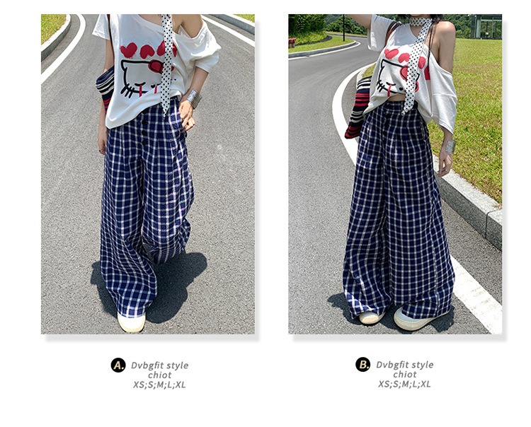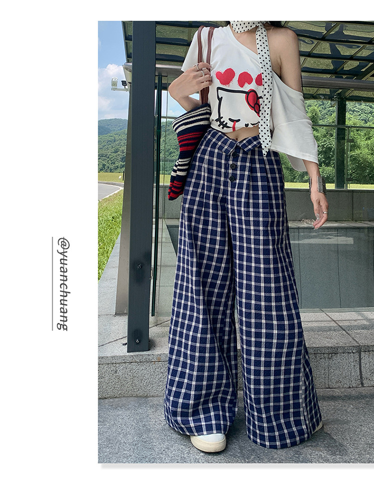 빈티지 아메리칸 스타일 스파이스 소녀 격자 무늬 2024 느슨한 넓은 다리 바지 싱글 행 멀티 버튼 게으른 복용량 직선 여성용 바지스토어 가기