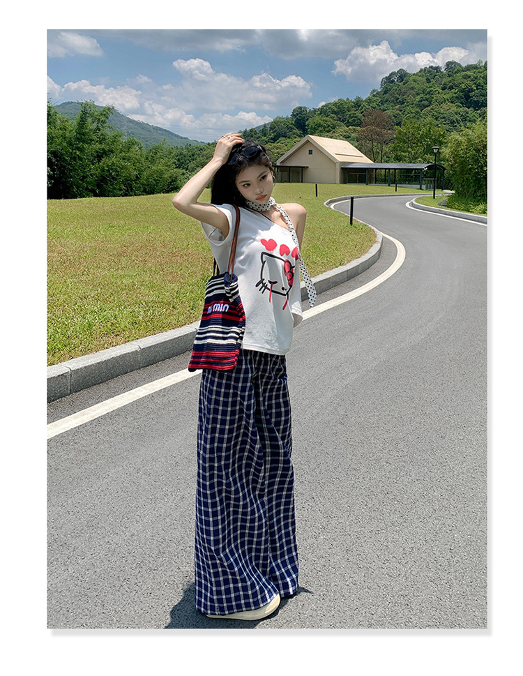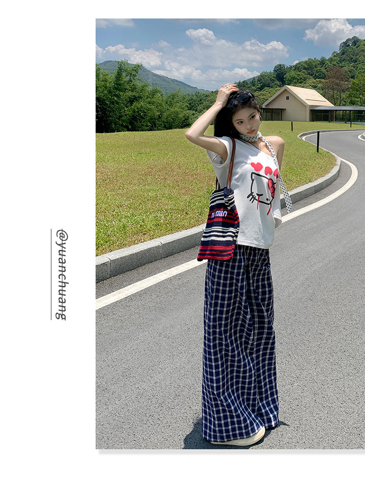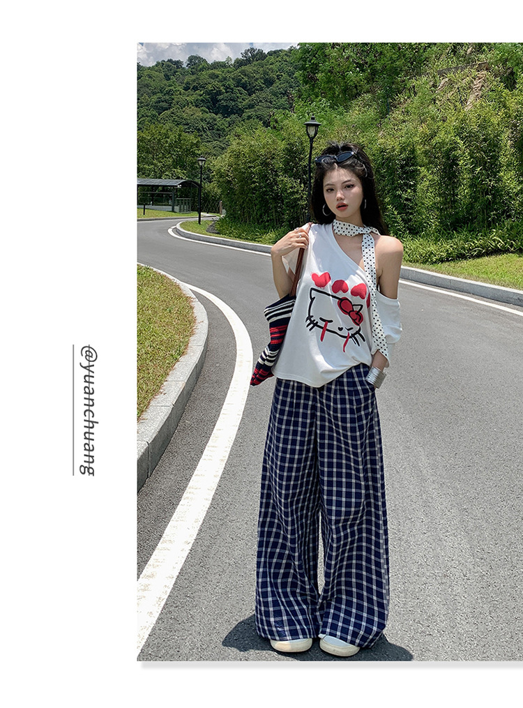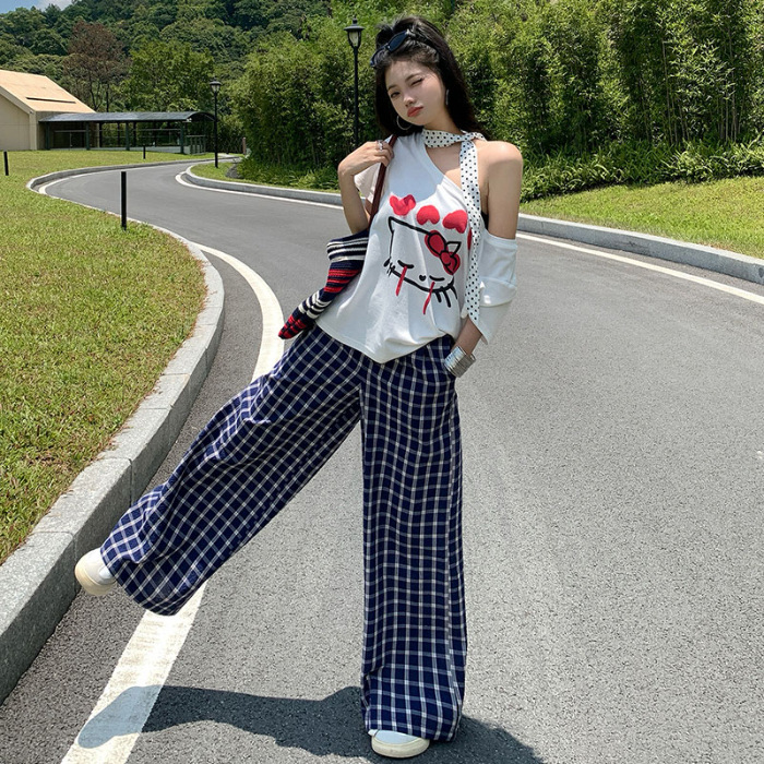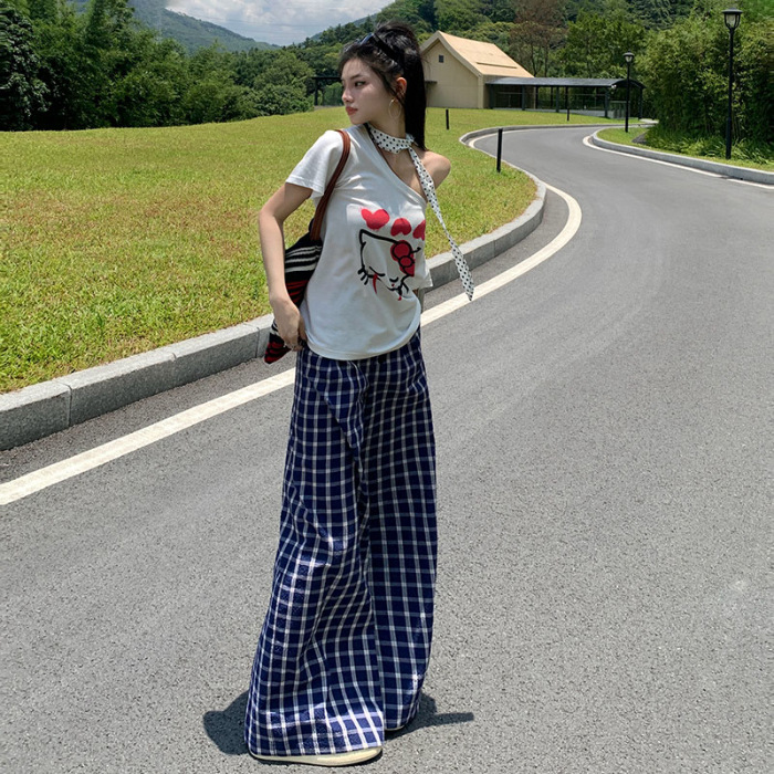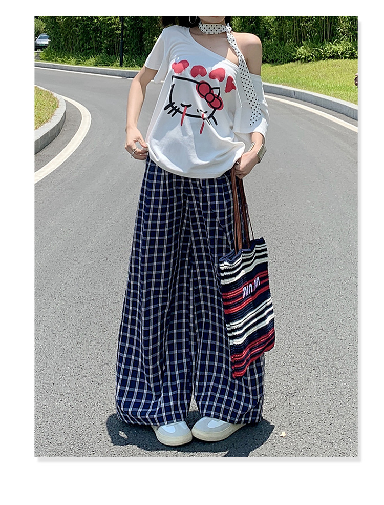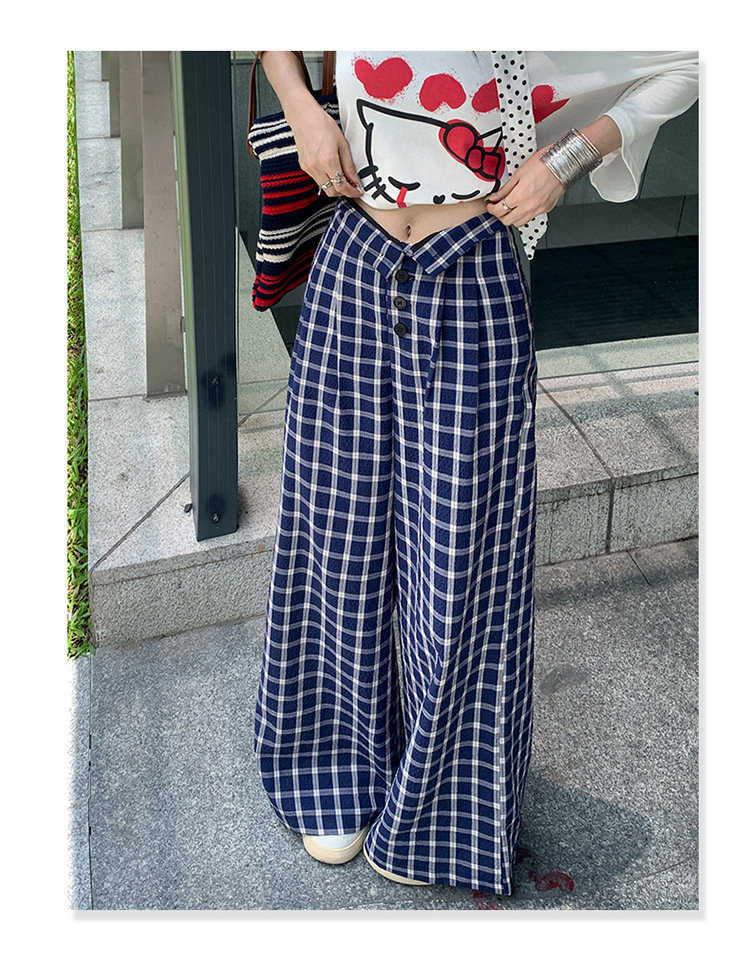 빈티지 아메리칸 스타일 스파이스 소녀 격자 무늬 2024 느슨한 넓은 다리 바지 싱글 행 멀티 버튼 게으른 복용량 직선 여성용 바지