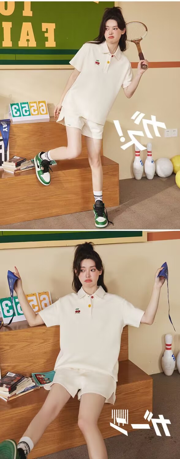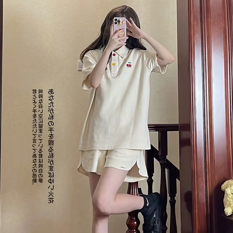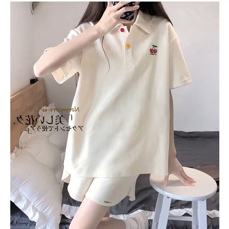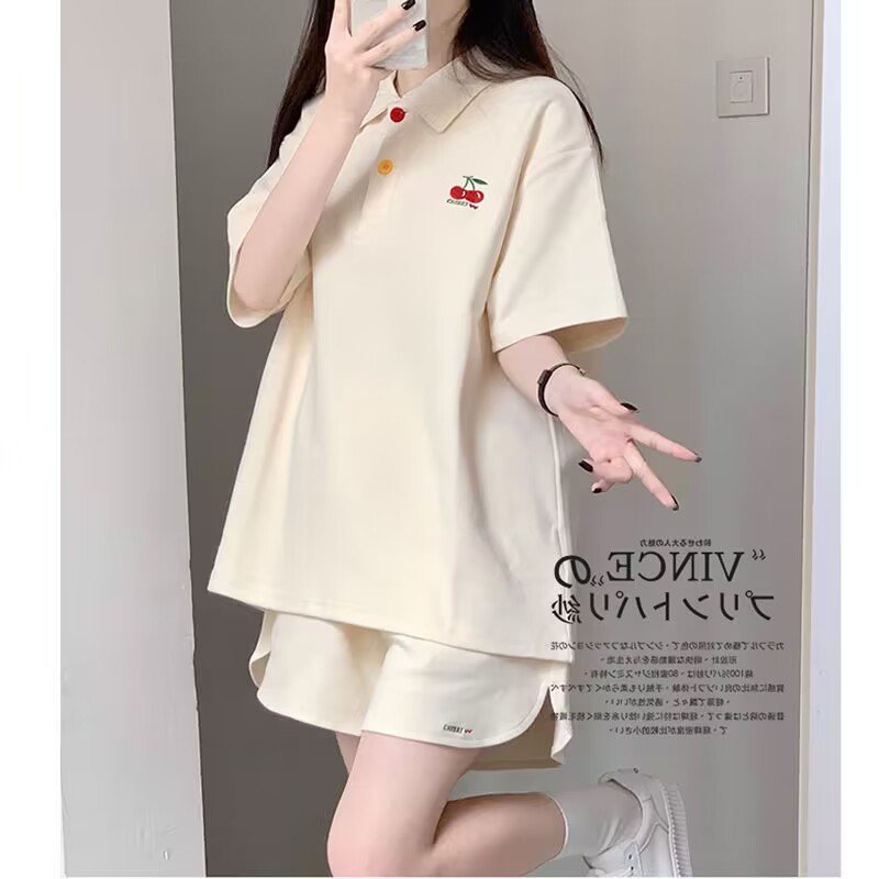 인터넷 인기있는 폴로 칼라 스포츠웨어 세트 여성의 2024 여름 캐주얼 느슨한 반팔 반바지 투피스 세트스토어 가기