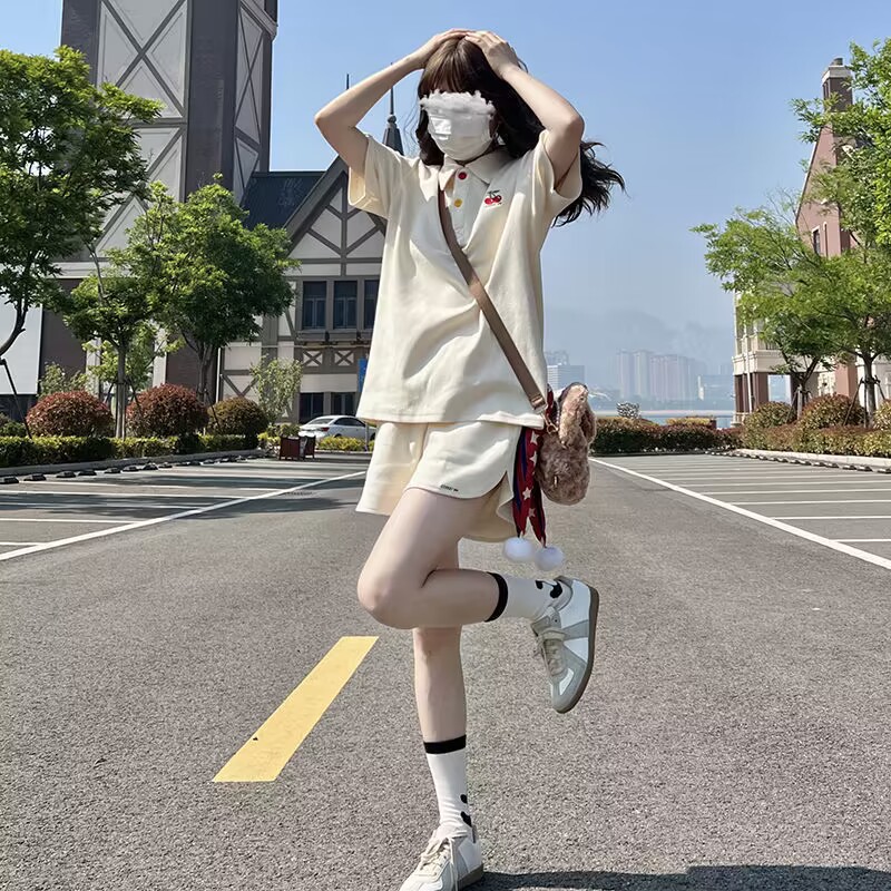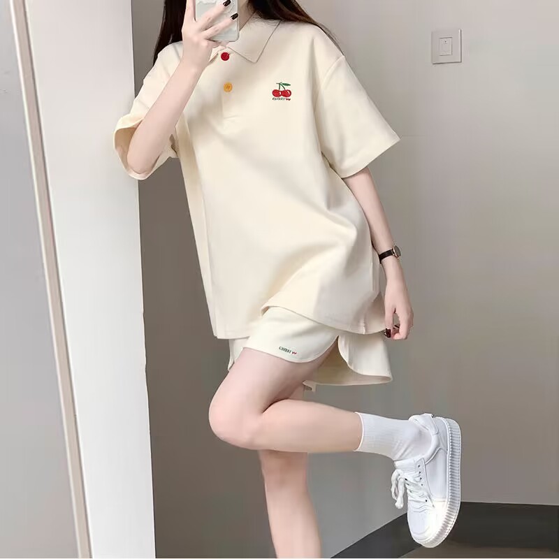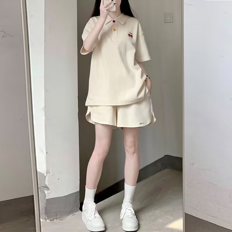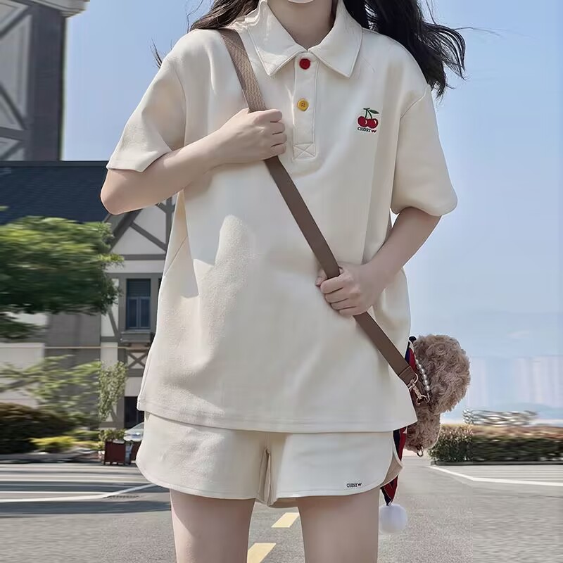 인터넷 인기있는 폴로 칼라 스포츠웨어 세트 여성의 2024 여름 캐주얼 느슨한 반팔 반바지 투피스 세트