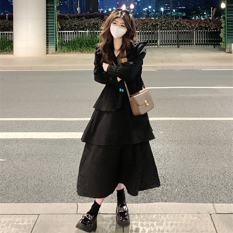 러플 브이넥 원피스 여성복 2025 신상 봄가을 아메리칸 컬리지 스타일 블랙 허리라인 강조 케이크 A라인 롱스커트스토어 가기
