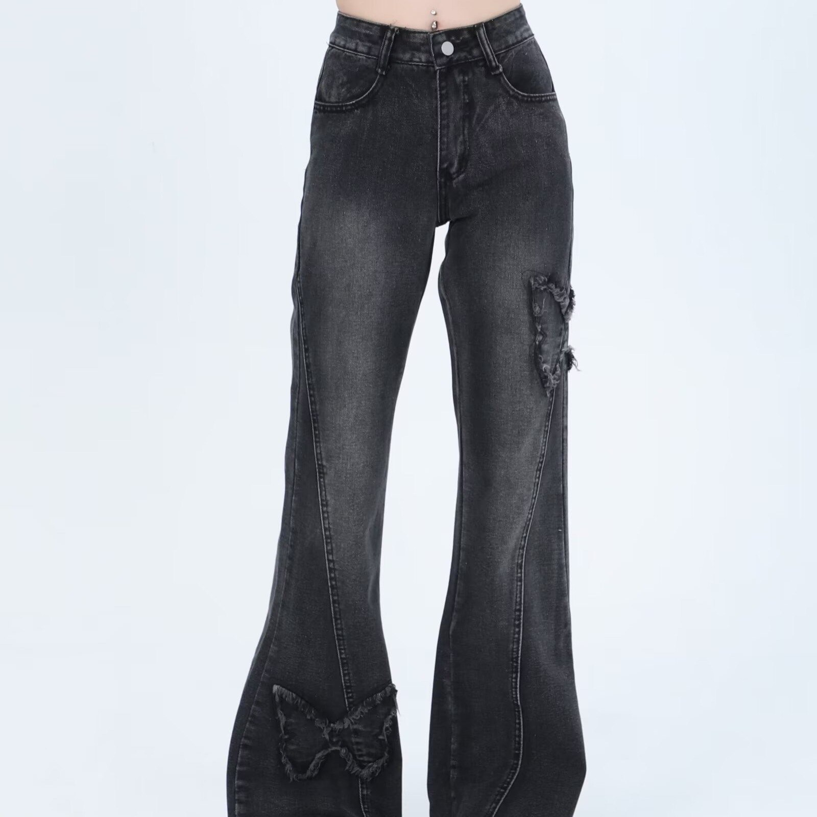 통통녀 미국식 하이 스트리트 바이브 나비 수 놓은 마이크로 라 청바지 여성 여름 플러스 사이즈 여성 슬리밍 와이드 레그 바지