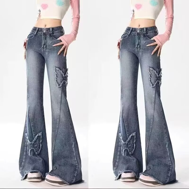 통통녀 미국식 하이 스트리트 바이브 나비 수 놓은 마이크로 라 청바지 여성 여름 플러스 사이즈 여성 슬리밍 와이드 레그 바지스토어 가기