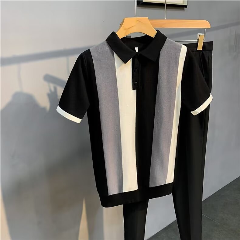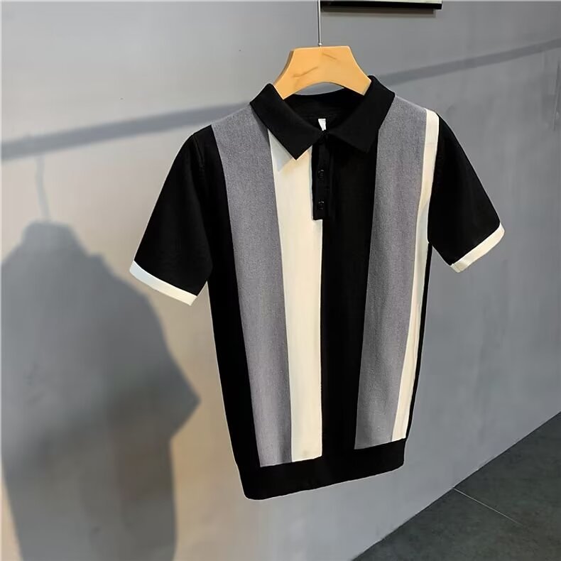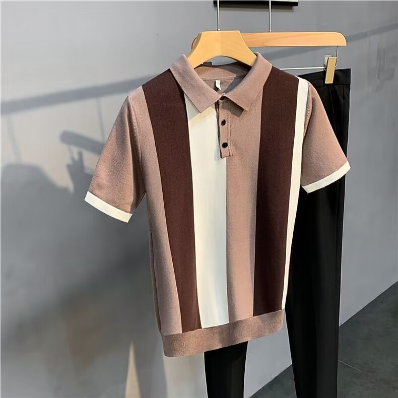 夏季新款冰丝条纹翻领短袖针织衫男士时尚青年潮流百搭休闲上衣潮