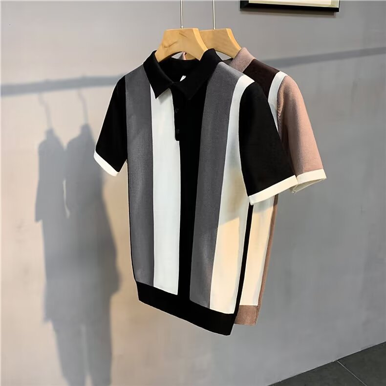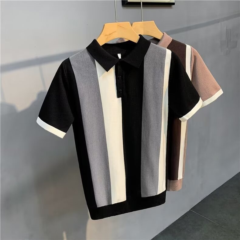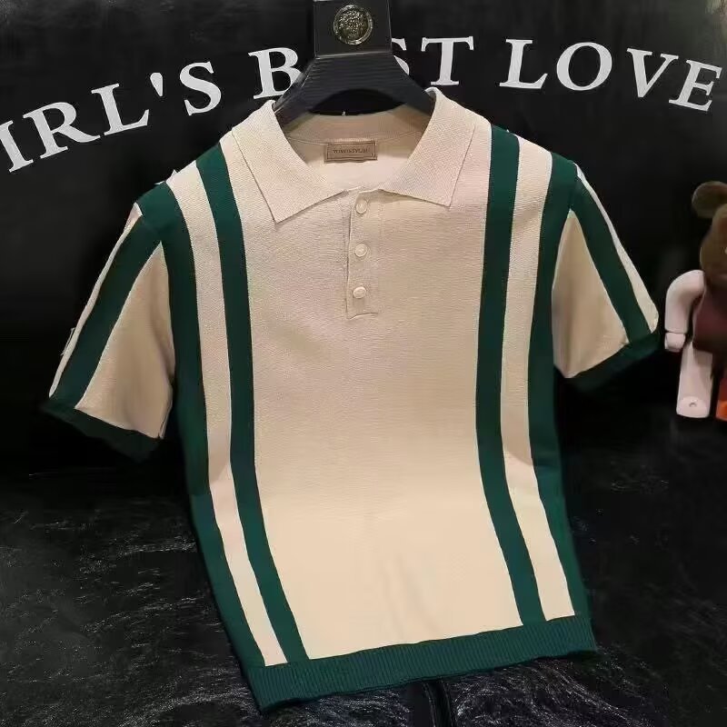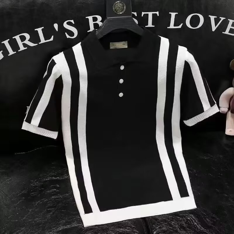 여름 새로운 아이스 실크 스트라이프 옷깃 반팔 스웨터 남성 패션 청소년 트렌디 올매치 캐주얼 탑 트렌디스토어 가기