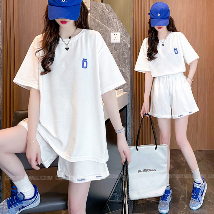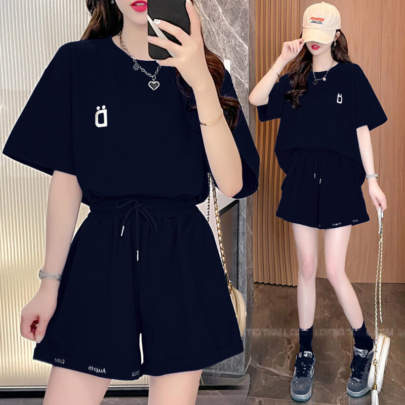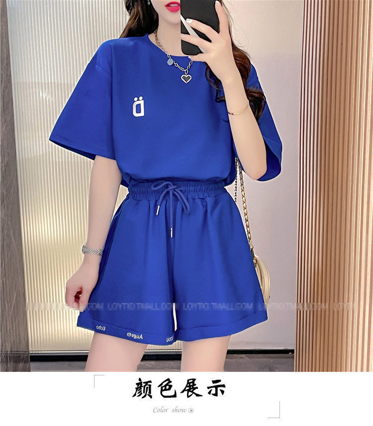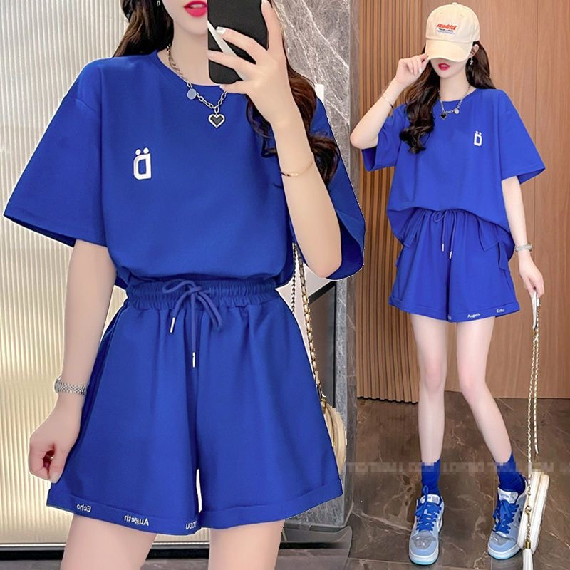 클라인 블루 루즈 플러스 사이즈 캐주얼 반팔 티셔츠 반바지 여름 스포츠 게으른 스타일 탑 반바지 세트 여성