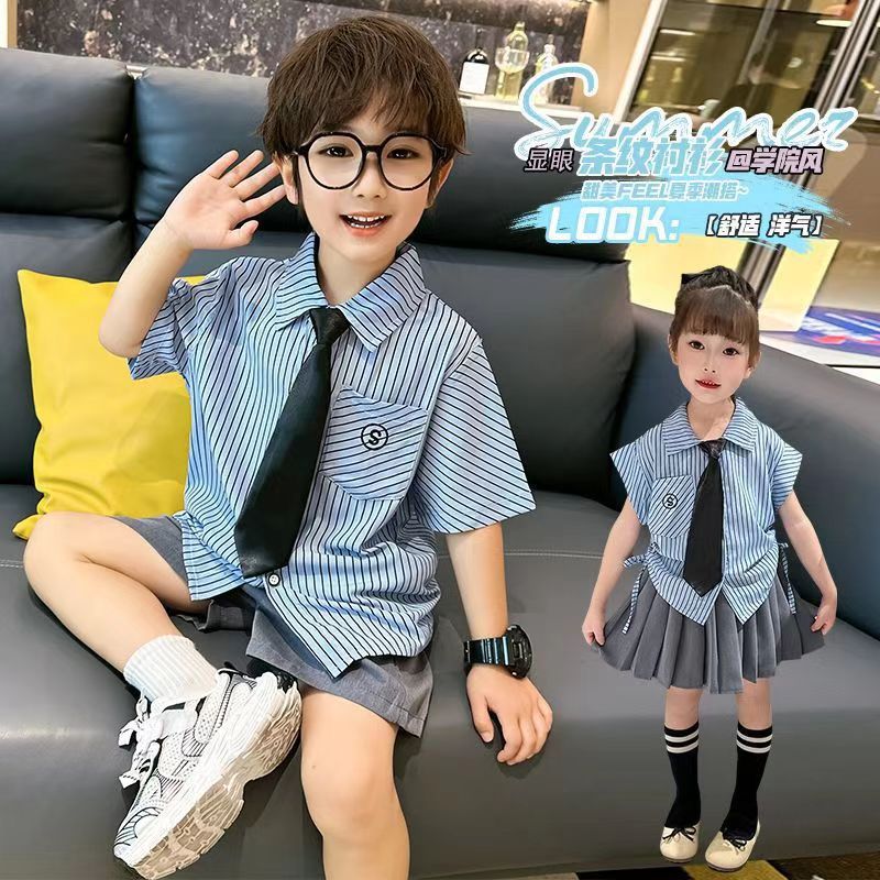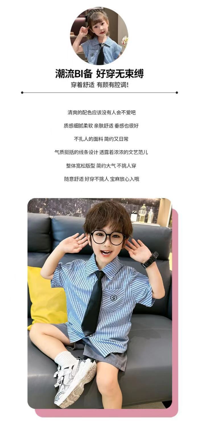 남자들의 여름 2024 새로운 세트 어린이 잘 생긴 유행 여자 대학 스타일 셔츠 반바지 투피스 세트스토어 가기