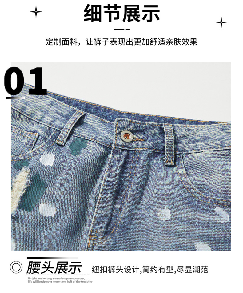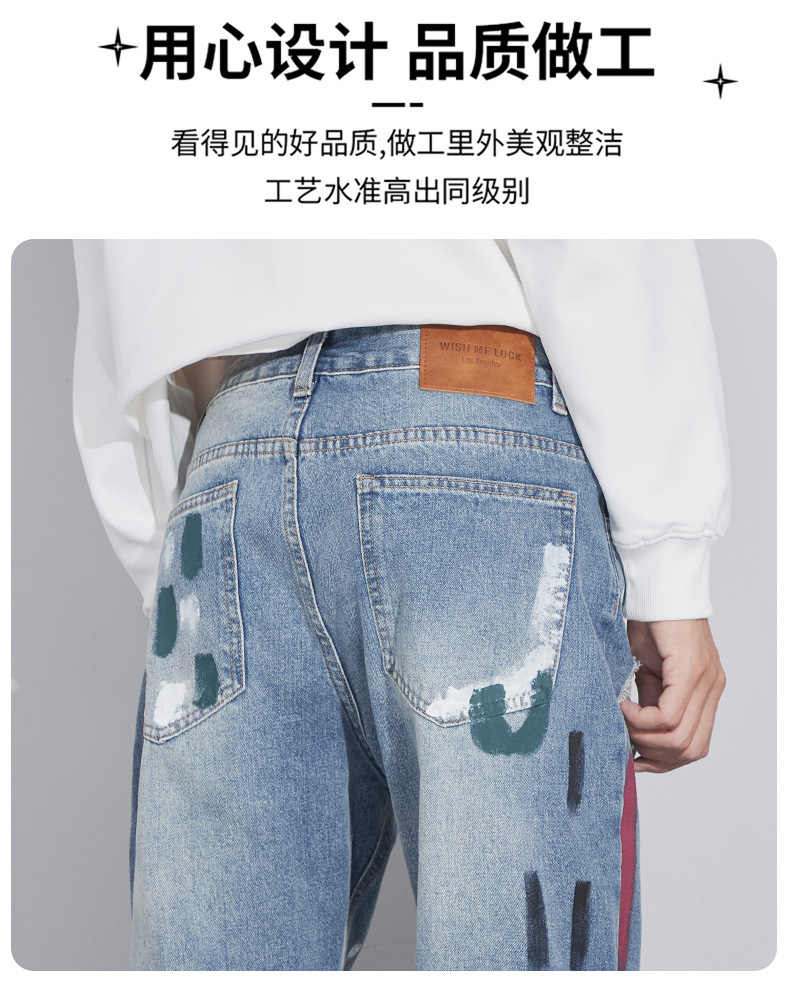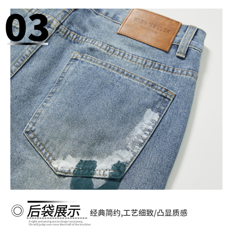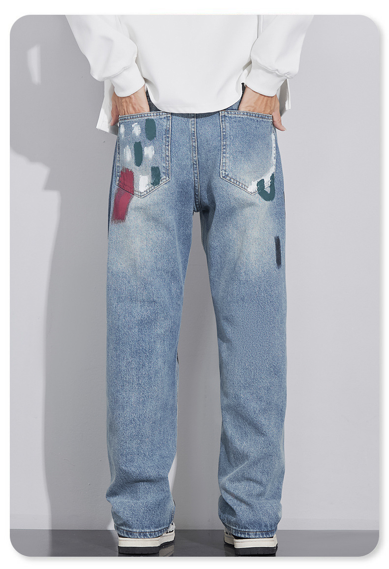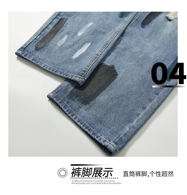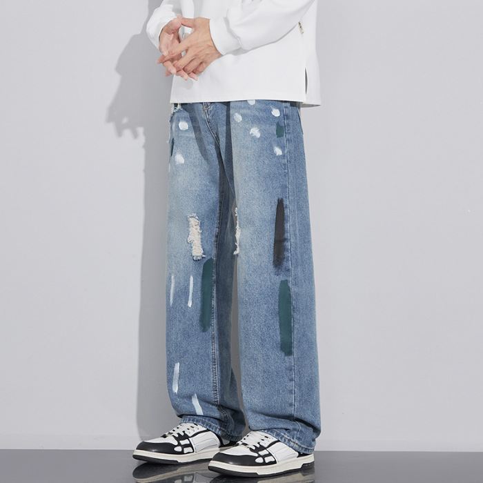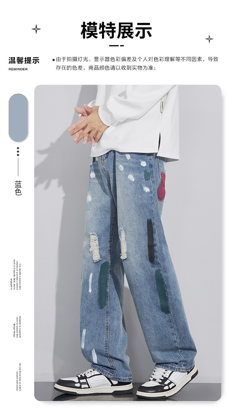 아메리칸 스타일 낙서 청바지 남자 여름 얇은 올 매치 느슨한 스트레이트 바지 남자 독특한 리핑 바지