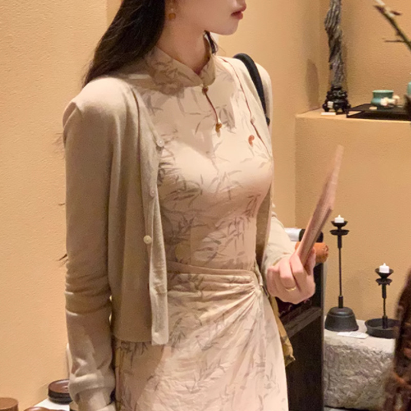 세련된 새로운 중국 복고풍 수정 청삼 여성의 봄 우아한 인쇄 원피스 투피스 2024 새로운 여성 의류